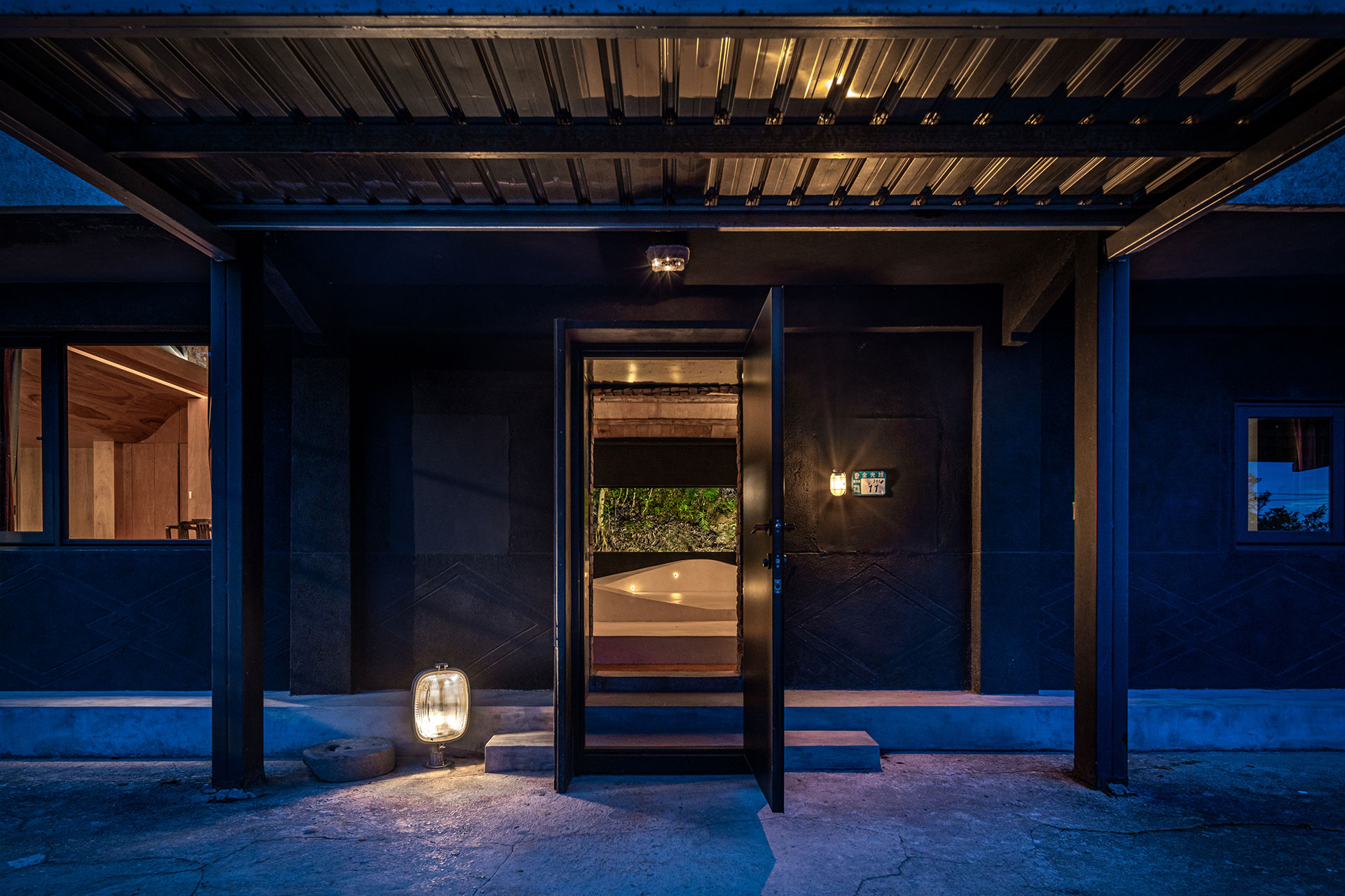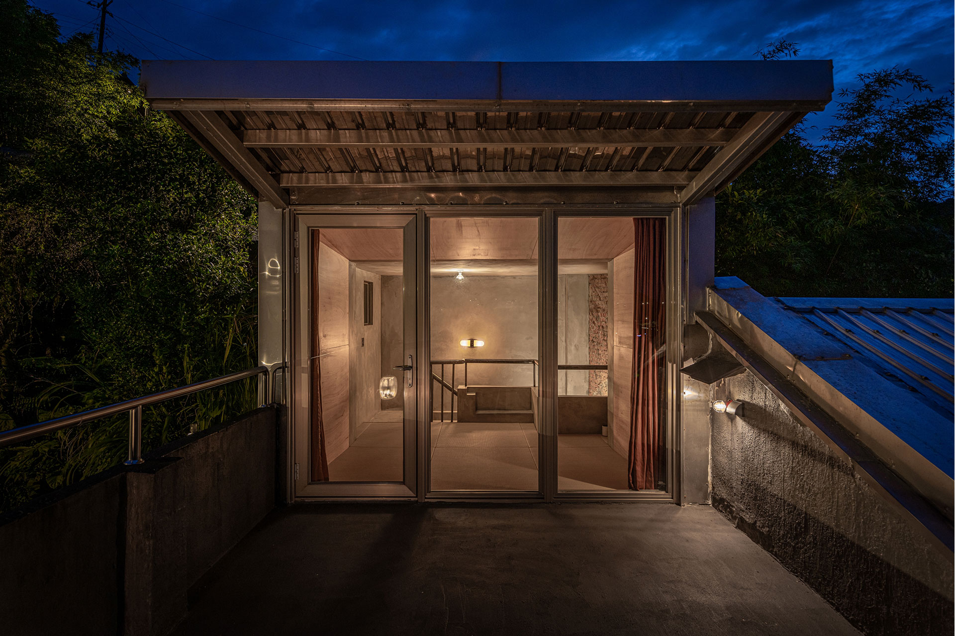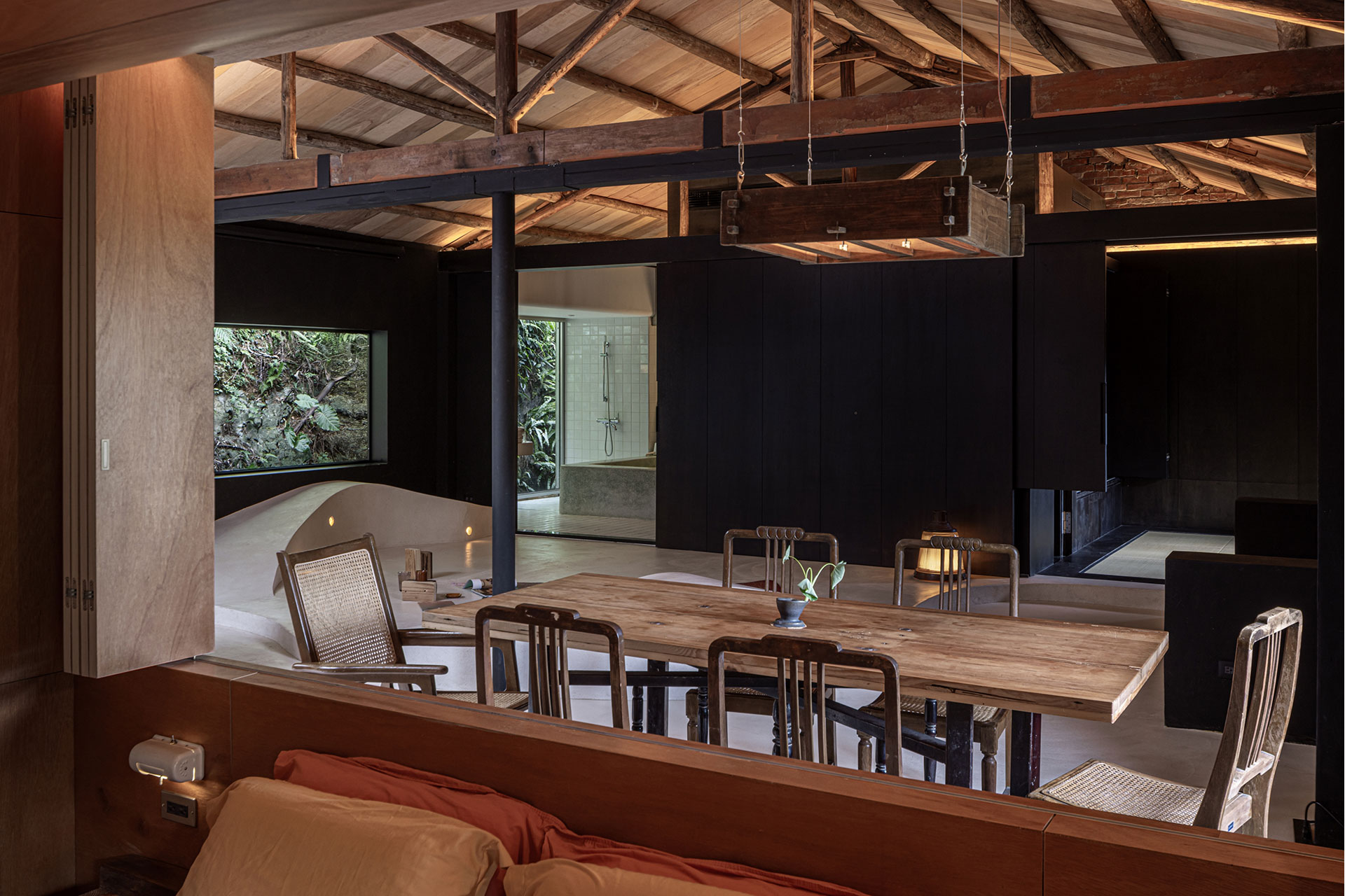 Instead of uniform brightness, light orchestrates the experience with theatrical layering. Warm tones reflect the timber roof structure to preserve the building’s unique atmosphere. Wall lighting highlights the textures of the original brickwork and weathered ironwork, allowing the traces of time to stand out. Guestrooms recede to a more intimate scale to support rest with low-intensity light. In the bathroom, the depth of the surrounding mountain is drawn inward. At night, reflected and refracted light turns the mountainside and vegetation into a soothing nocturnal panorama, creating a bathing experience in harmony with nature. Above the dining table, a pendant light reconstructed from a traditional bamboo steamer merges Taiwanese culinary culture with lighting language, becoming a light carrier that resonates with everyday emotions.