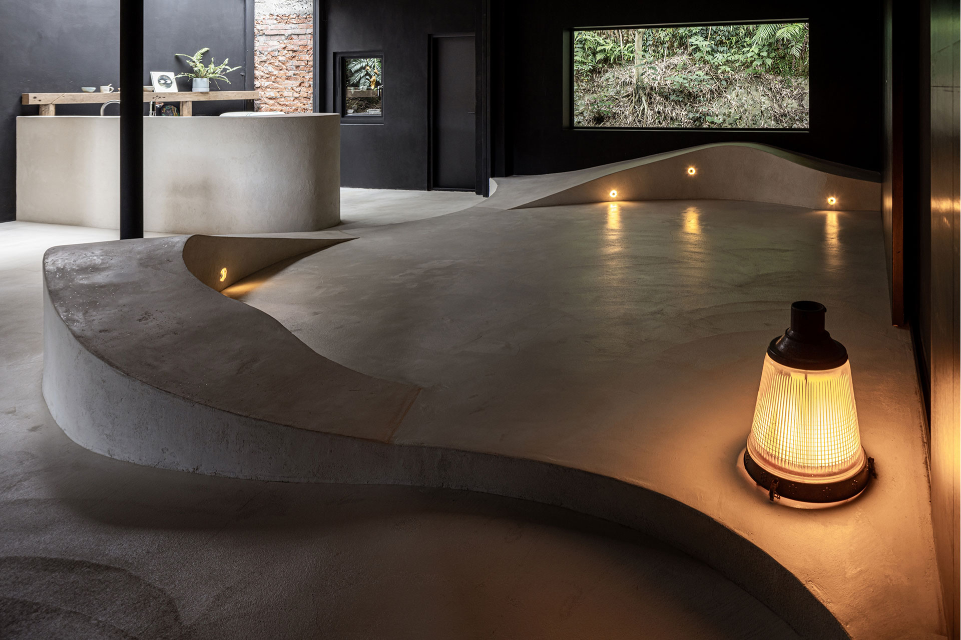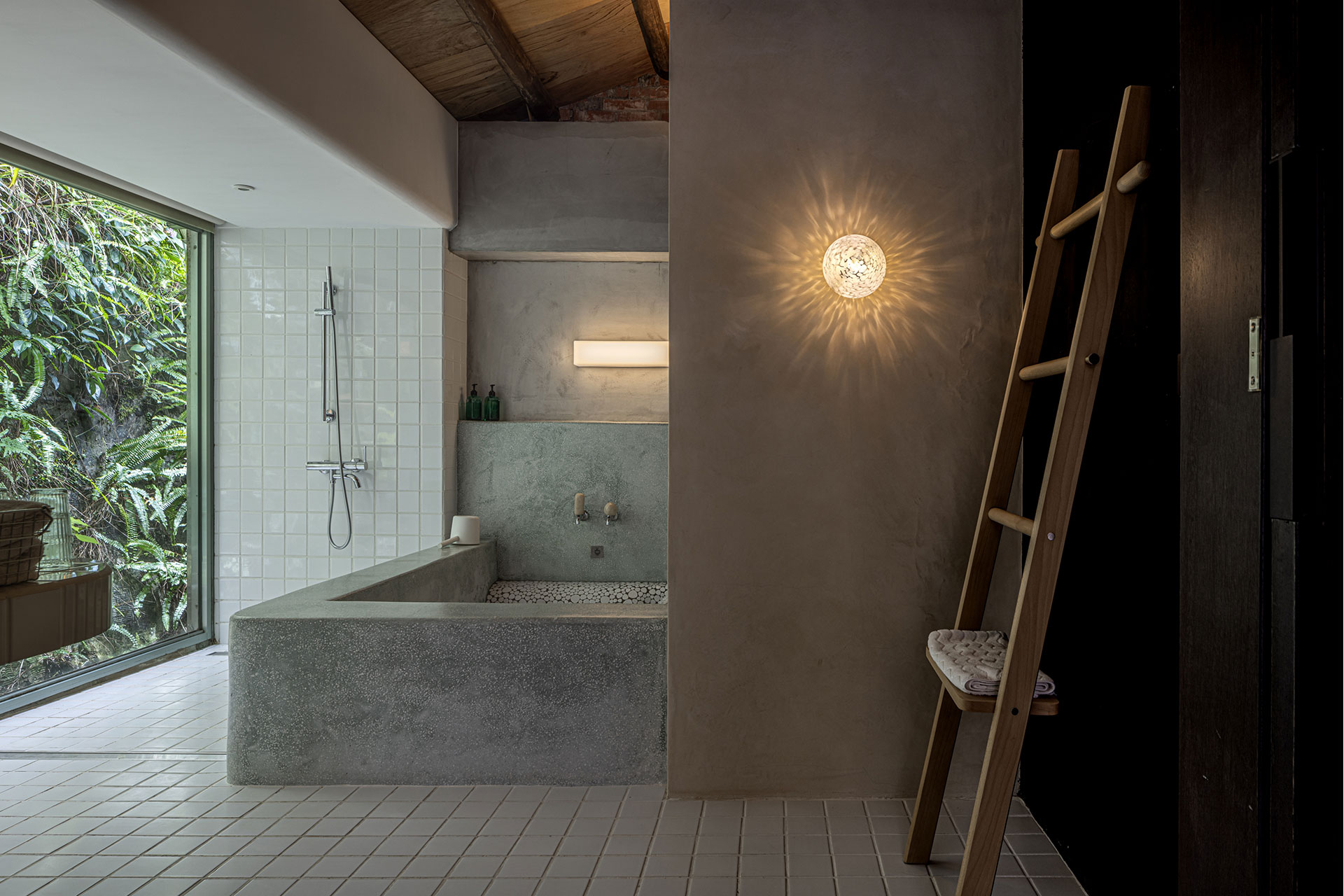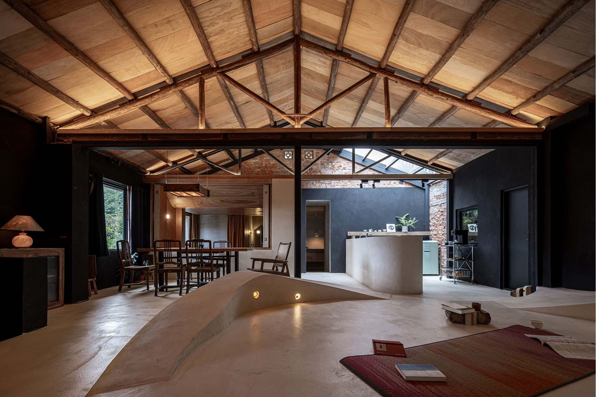 Instead of uniform brightness, light orchestrates the experience with theatrical layering. Warm tones reflect the timber roof structure to preserve the building’s unique atmosphere. Wall lighting highlights the textures of the original brickwork and weathered ironwork, allowing the traces of time to stand out. Guestrooms recede to a more intimate scale to support rest with low-intensity light. In the bathroom, the depth of the surrounding mountain is drawn inward. At night, reflected and refracted light turns the mountainside and vegetation into a soothing nocturnal panorama, creating a bathing experience in harmony with nature. Above the dining table, a pendant light reconstructed from a traditional bamboo steamer merges Taiwanese culinary culture with lighting language, becoming a light carrier that resonates with everyday emotions.