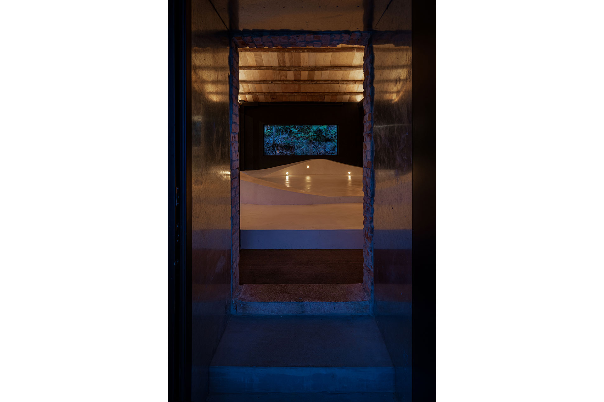 The narrow entrance recalls the atmosphere of a mine tunnel opening. As travellers open the door, low illumination and directional beams guide an emotional transition into the interior. Stepping inside, guests are greeted by a white sculpted communal space shaped like natural terrain, where visitors may sit or lounge to relax. Lighting is placed intentionally close to the ground with 2200-2700K low-colour-temperature, low-glare, narrow-beam fixtures. Subtle light embedded along the slope resembles glimmers hidden within an ore vein, gently guiding movement. Illumination does not dominate but shapes how the body meets the ground, slowing the pace and easing the mind instinctively.