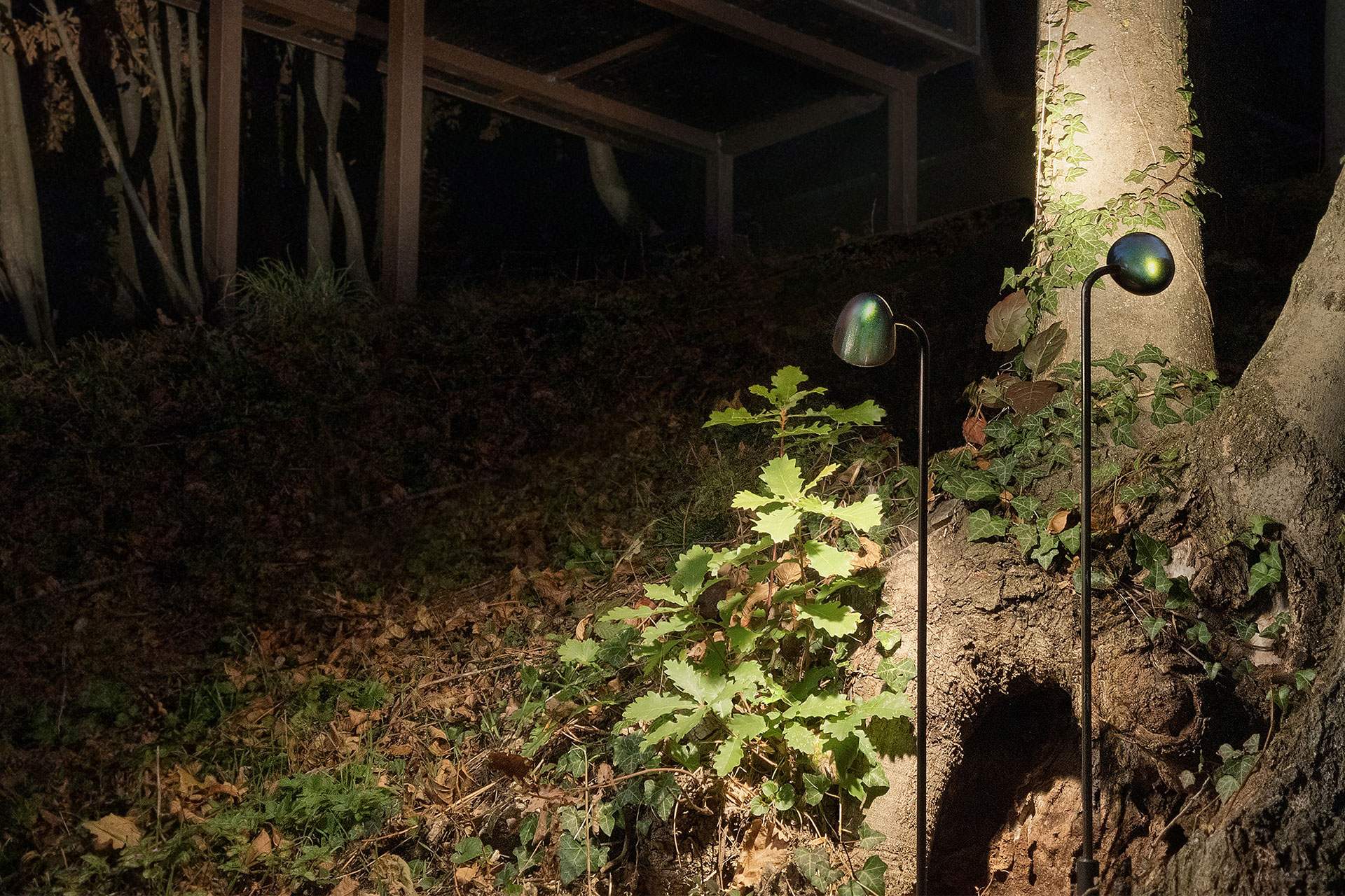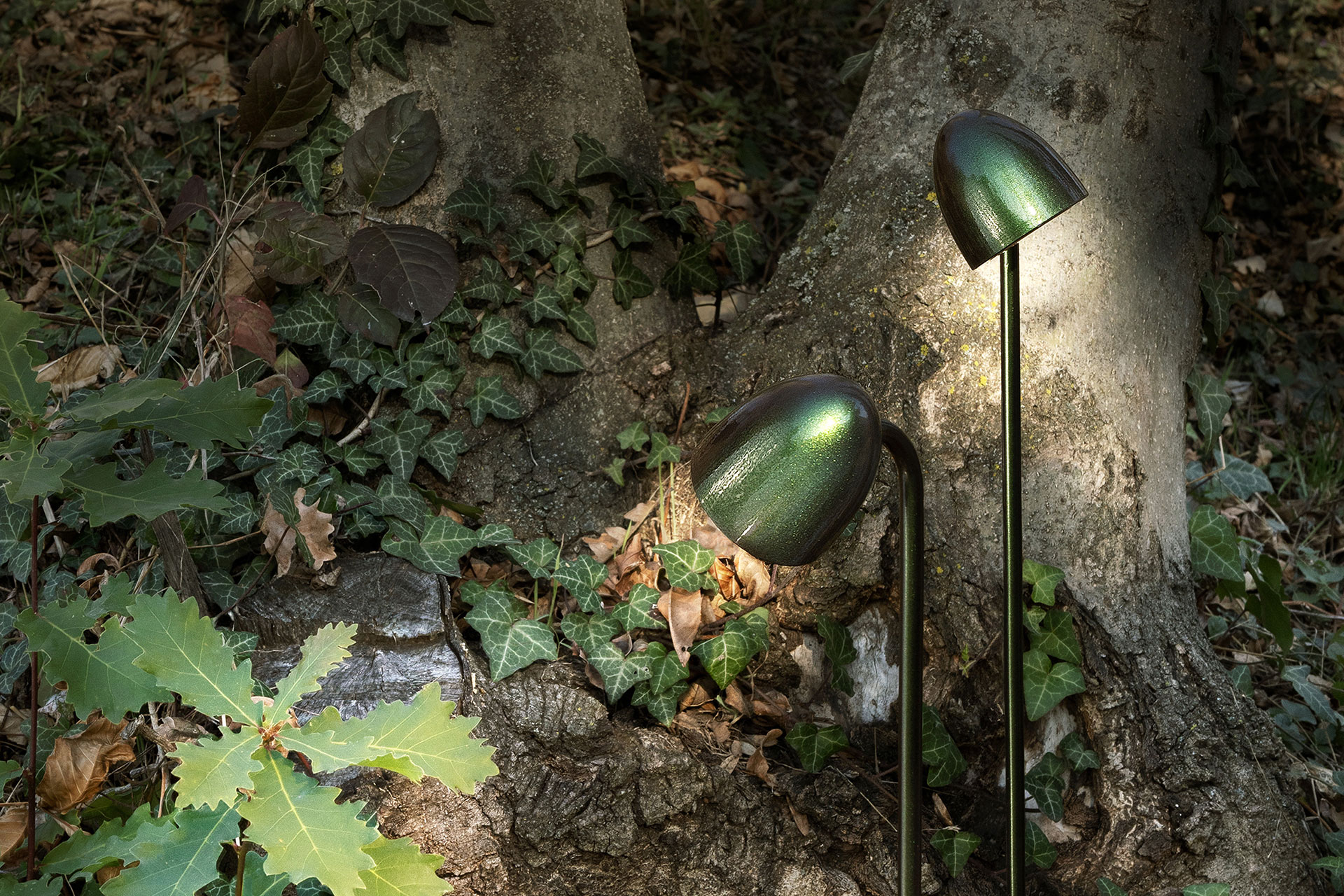Three spots featuring a slender structure designed to blend seamlessly with the ground, becoming almost invisible among the leaves.The iridescent Cetonia Green and Lucent Grove finishes capture and reflect the nuances of nature, while the satin Pine Green and Ink Black variants blend discreetly into the landscape with understated elegance.