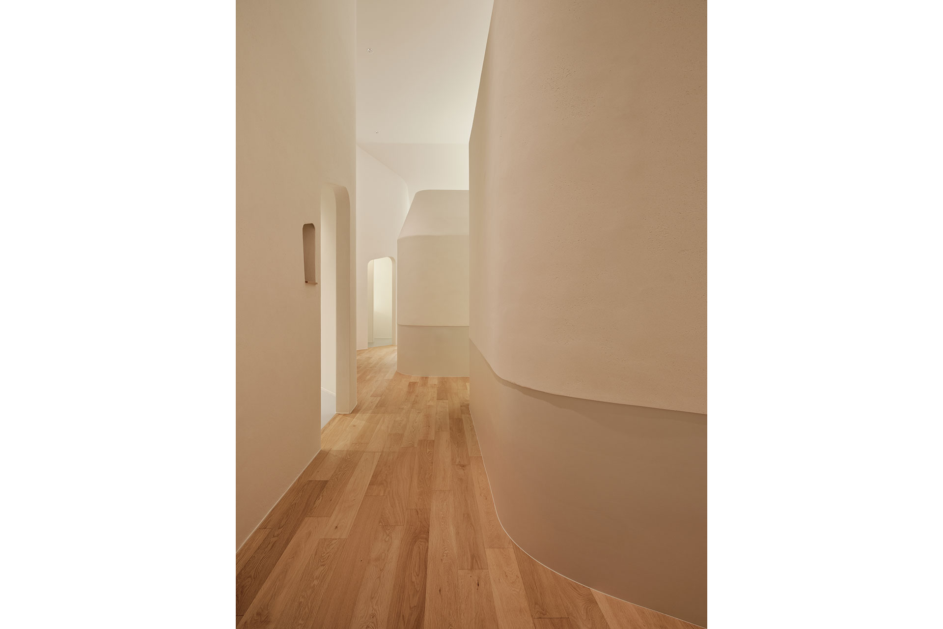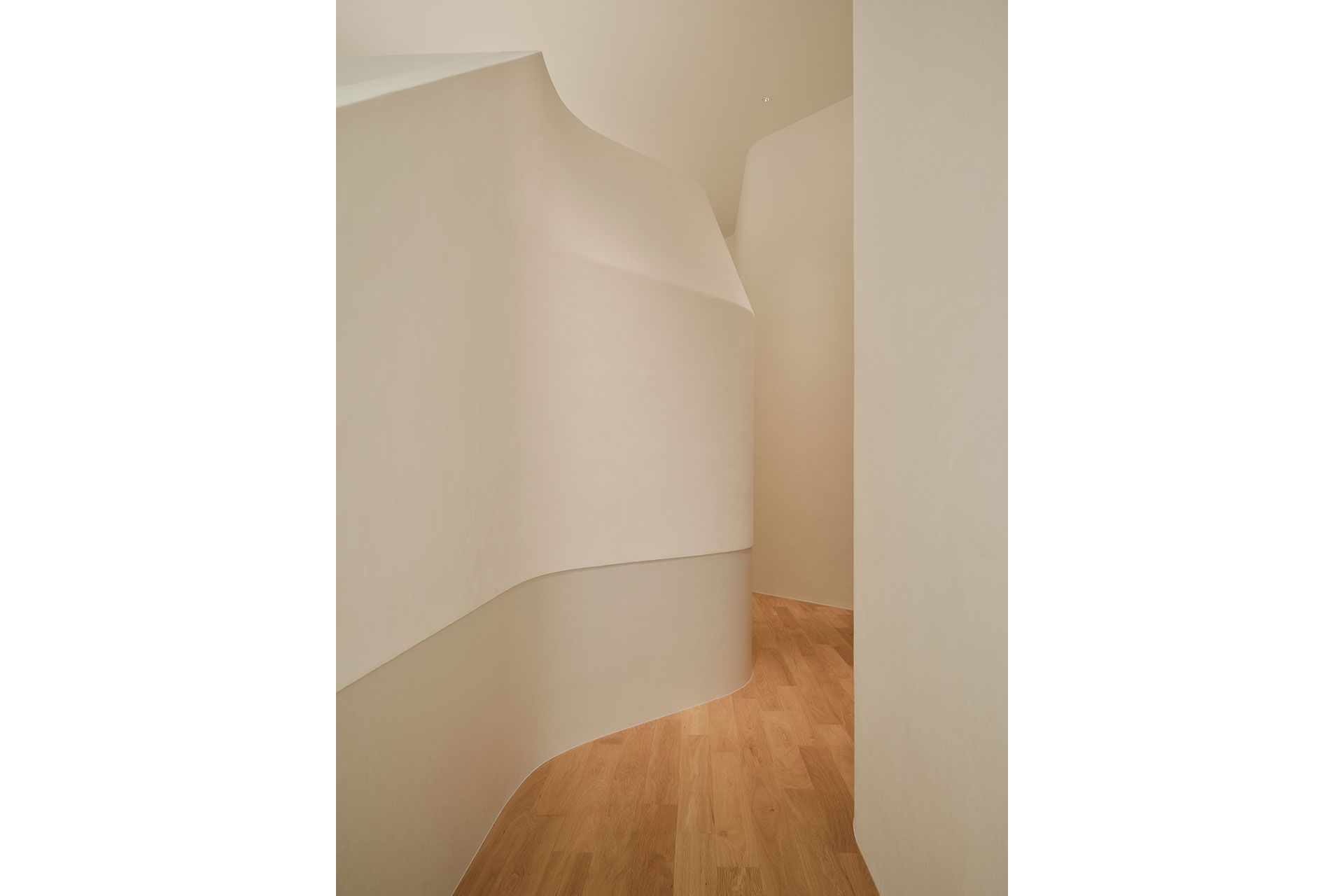 The largest opening faces north, with no openings on the south or west sides. Linear lights are installed above the ceilings of the two lower spaces (four above the larger and two above the smaller) to provide ambient indirect illumination throughout the space. Their height is carefully adjusted to remain unseen and to eliminate cutoff lines caused by the raised volumes.