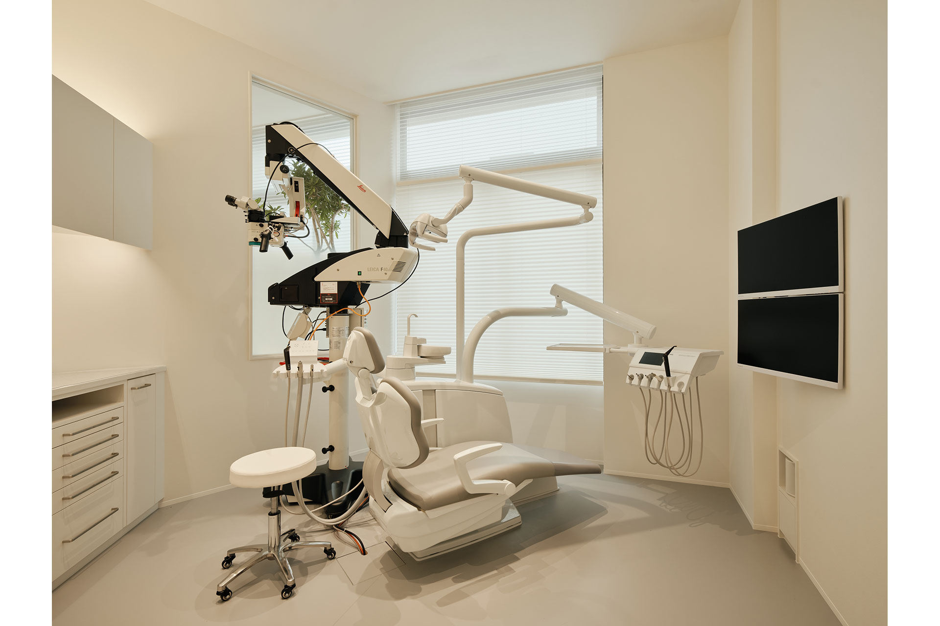 Treatment rooms are equipped with high-CRI (Ra90+) downlights on the ceiling and indirect lighting above and below shelving to support precise color judgment and detailed dental work. This ensures uniform illumination without glare while minimizing shadows.