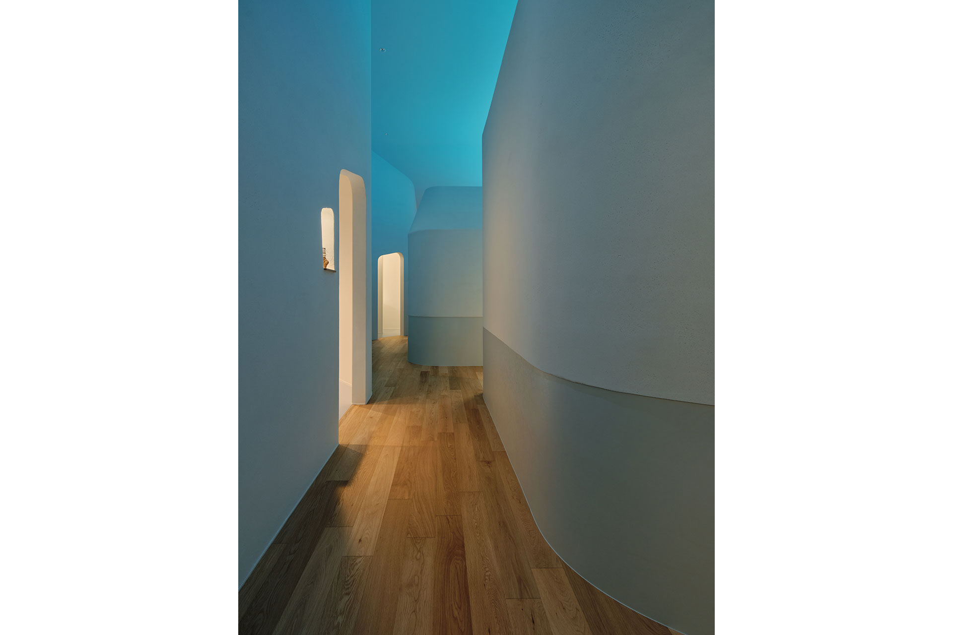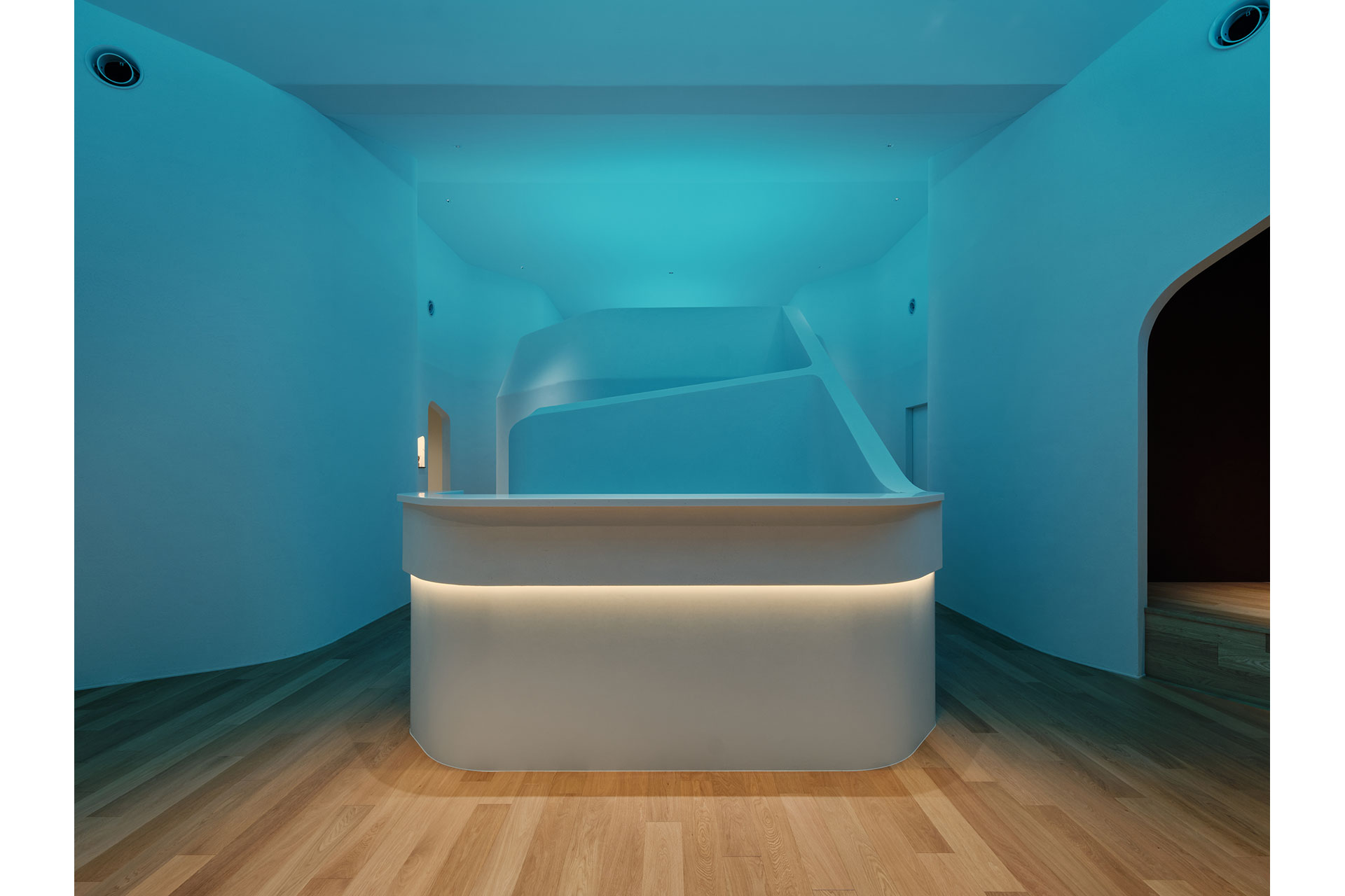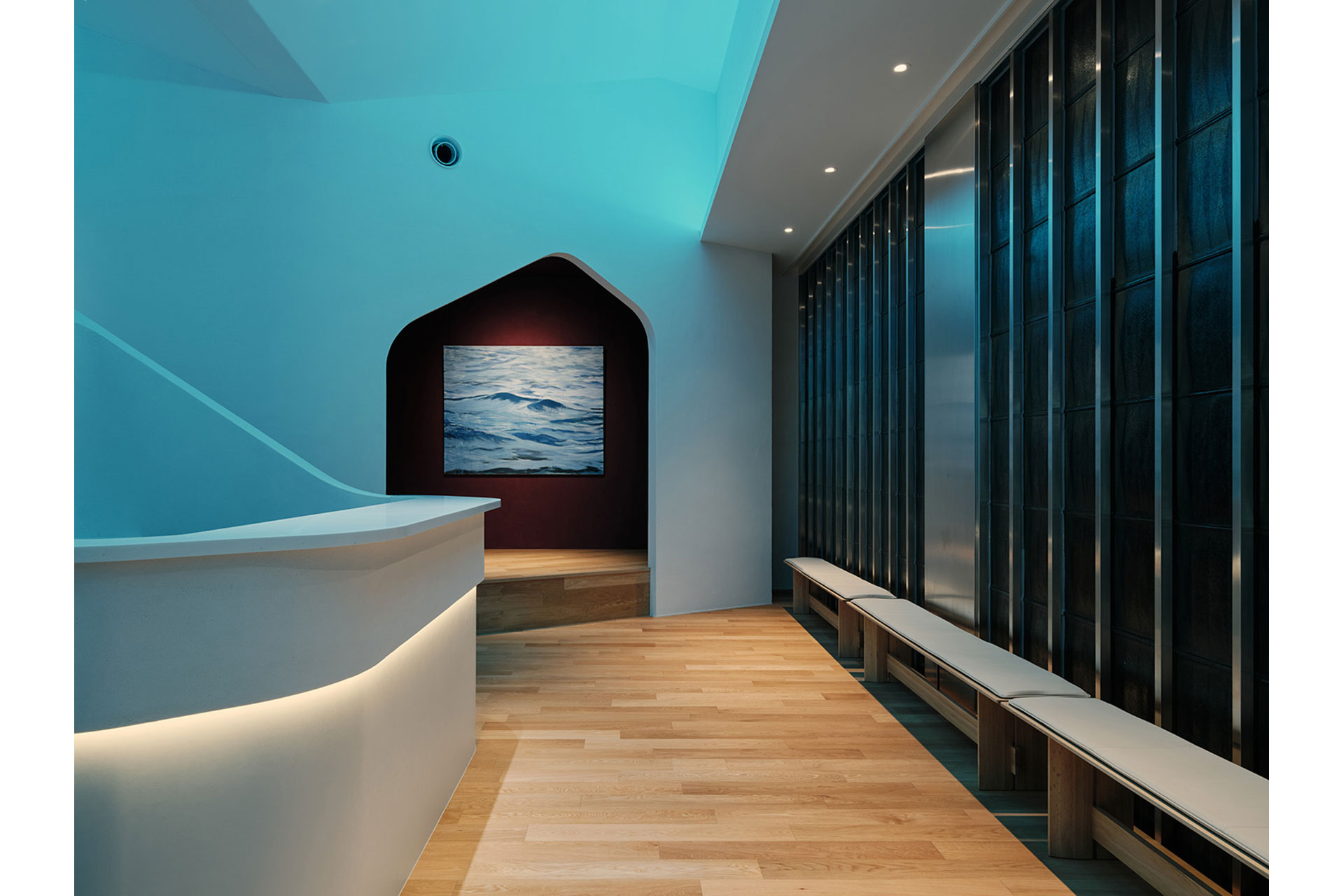 Linear lights in the central area are tunable between 2700K and 20000K (Azure light). Before opening, the Azure light promotes staff alertness; during operation, 3500K balances concentration and calm; after hours, 2700K creates a soothing environment. These transitions occur over five minutes, conveying time naturally without relying on clocks. The Azure light also recreates an open sky on the ceiling and generates an immersive “Blue Cave” experience along the angled corridors, with reflected oceanic blue creating depth and a sense of enclosure.