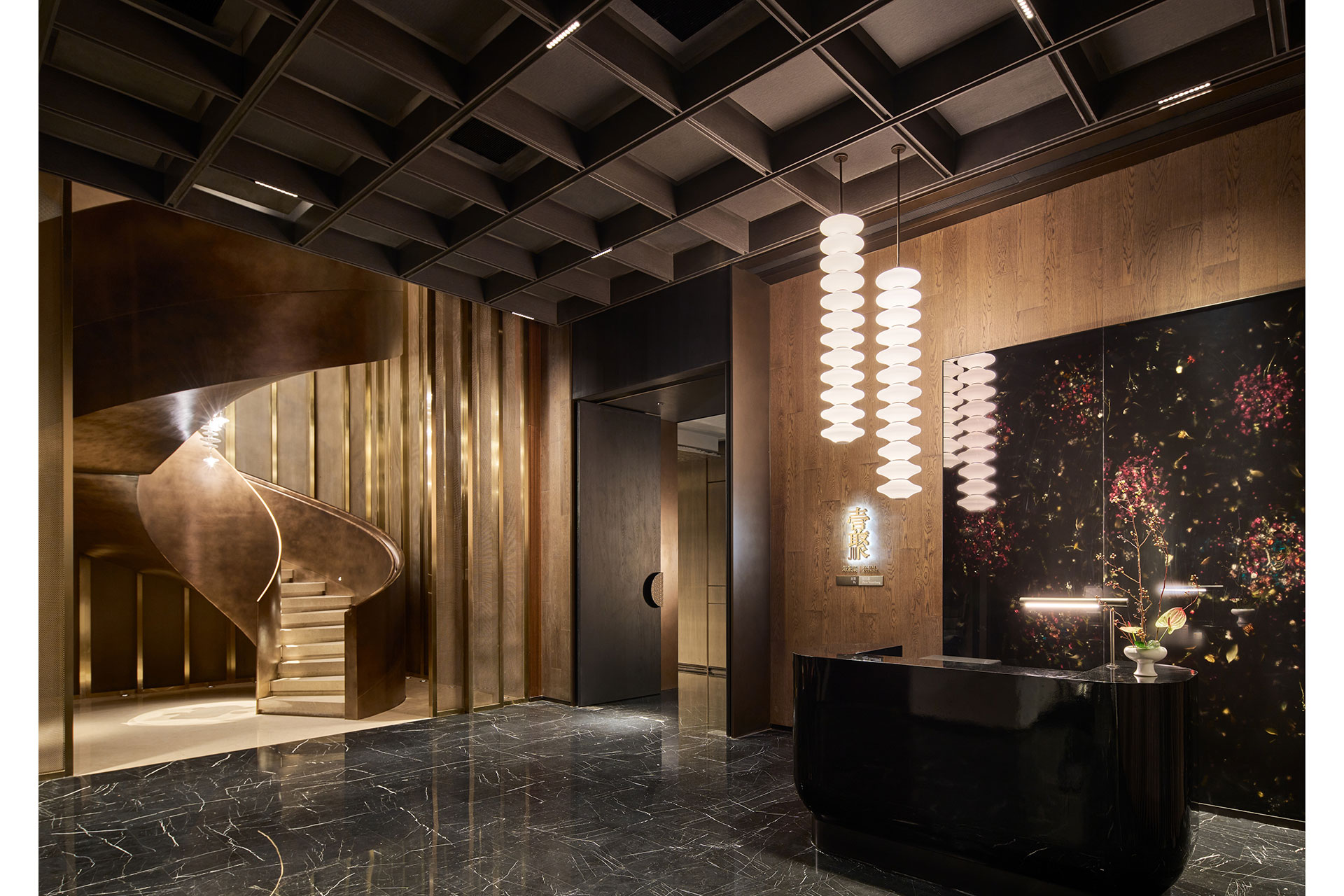 A core philosophy of the design is the sophisticated layering of light to evoke specific emotions and guide the user. This is immediately evident in the dramatic public areas. The lift lobby’s backlit “starry night” ceiling and the reception’s dynamic “breathing” wall act as captivating focal points, providing visual drama and a sense of expansive height. This grand scale is further explored in a spectacular, sculptural staircase, where integrated lighting highlights the bronze materiality and fluid form. These theatrical installations are balanced by meticulous cove and linear lighting, which washes surfaces in a soft glow to define spatial boundaries, highlight luxurious finishes, and provide a sense of comfortable enclosure.