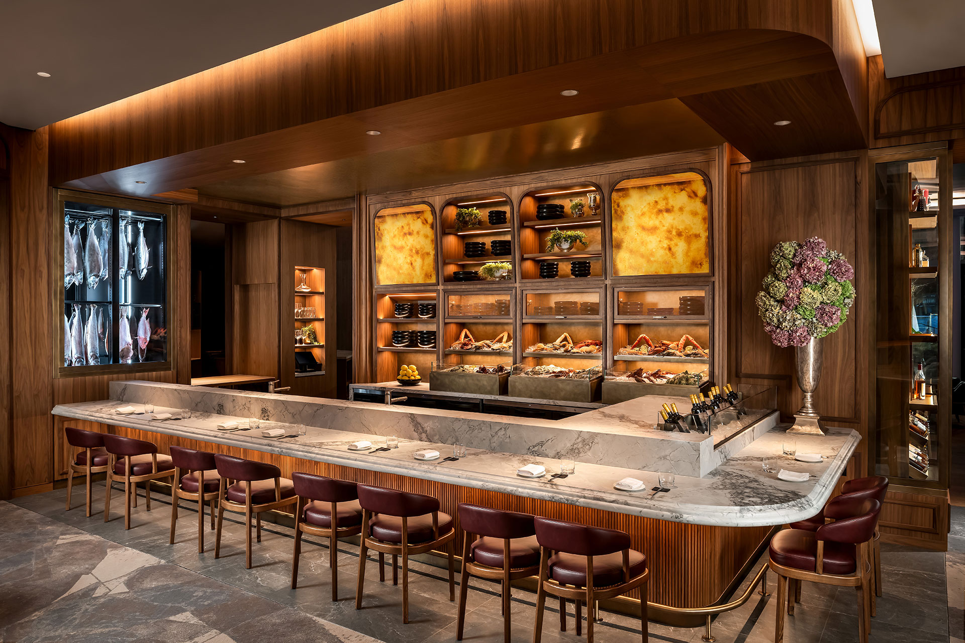 Intensity, shadow, contrast, distribution, and color were meticulously balanced to create depth and atmosphere without overwhelming diners. Cooler tones accentuate the freshness of seafood, while warmer hues enrich the presentation of meats and wines, reinforcing the artistry of each dish. Carefully placed pools of intimacy coexist with evenly illuminated surfaces, supporting both operational efficiency and guest comfort.