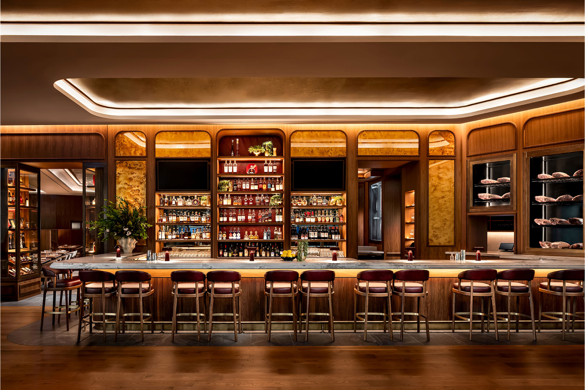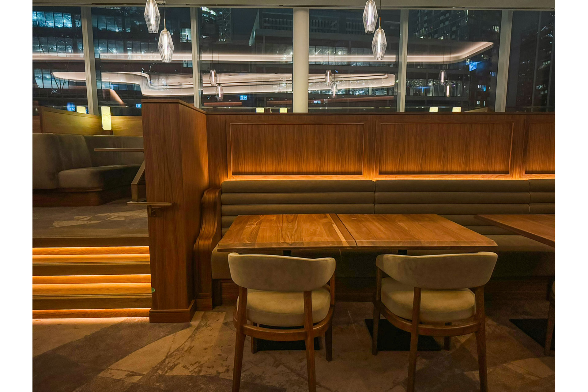 The scheme complements a luxurious palette of wood, leather, and metallic accents. Warm light reveals material depth, while coves and carefully positioned pendants define focal zones, including the bar and dining areas. Recessed downlights, dim-to-warm and subtly integrated, deliver precision illumination without disrupting architectural integrity. Scene-based controls enable smooth transitions from vibrant daytime service to intimate evening ambiance, gradually deepening downlight warmth to evoke the soft glow of candlelight.