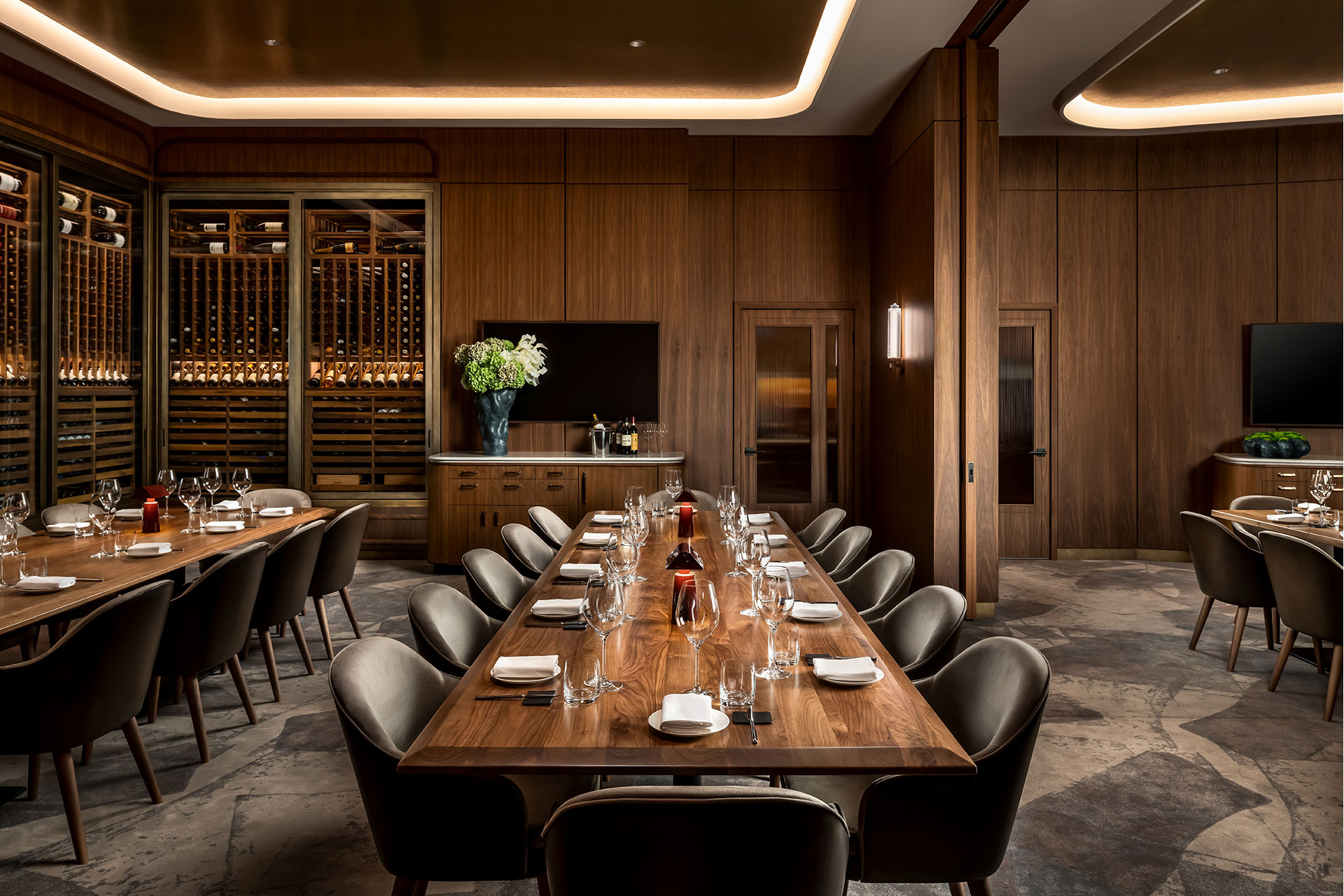 At the heart of the design is a vertical gradient of color temperature, from 2200K at the floor via integrated step lights to 2700K in ceiling coves. This progression sculpts textures, draws the eye upward, and enhances the richness of the interiors. Guests encounter a space that is simultaneously expansive and personal, where each moment feels deliberate and elevated.