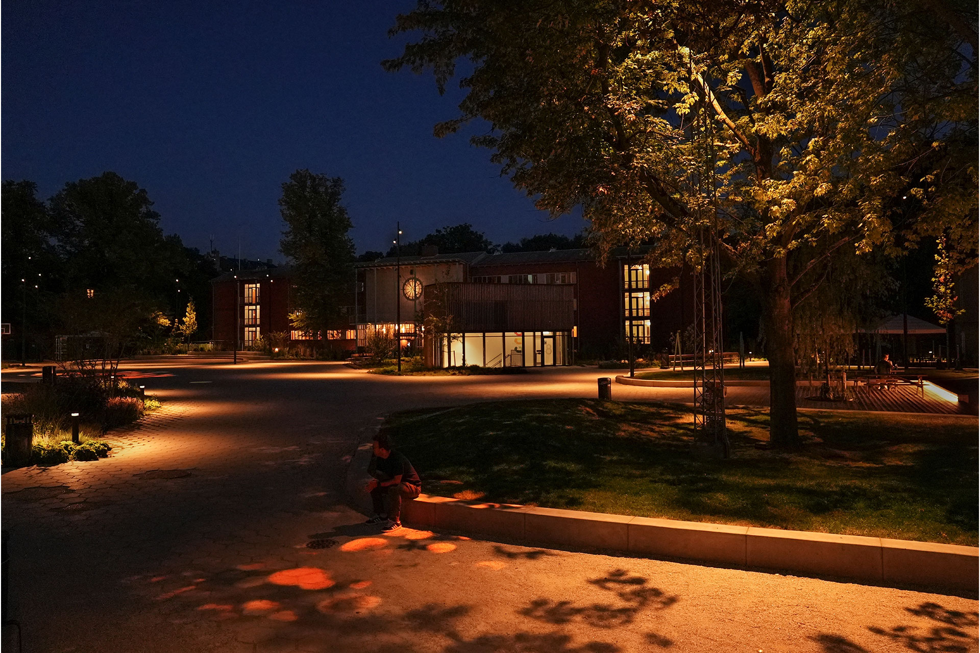 A key atmospheric gesture is the illumination of both existing and newly planted trees. Although lit from above, their highlighted canopies introduce a subtle vertical layer of light that creates an enveloping spatial quality, enhancing depth and intuitive orientation. With luminaires discreetly positioned among the branches, the interplay of foliage, shadow and movement produces a dynamic yet calming visual texture on the ground.