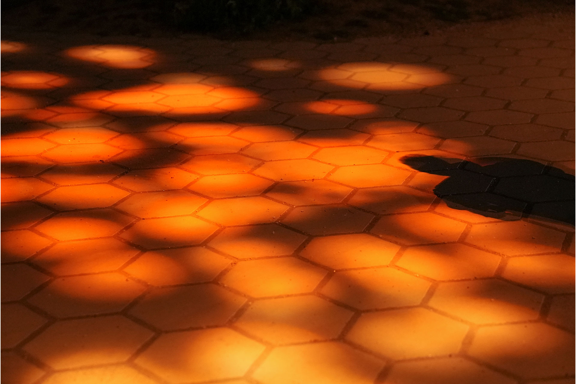An artistic layer is introduced through subtle gobo projections set along a diagonal axis across the square, marking the trace of a historic main route. The projections cast clusters of warm light specks on the paving, enriching the visual palette without disturbing the overall spatial calm.