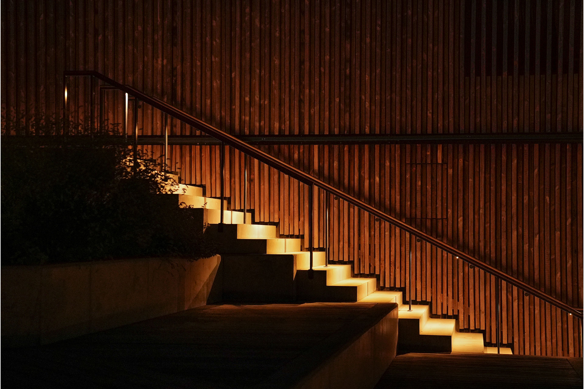 Along the terraced landscape staircase, lighting is integrated into the landscape features. Bollards concealed within the planting and discreetly built-in handrail lighting provide safe movement while enhancing the tactile qualities of the terrain.