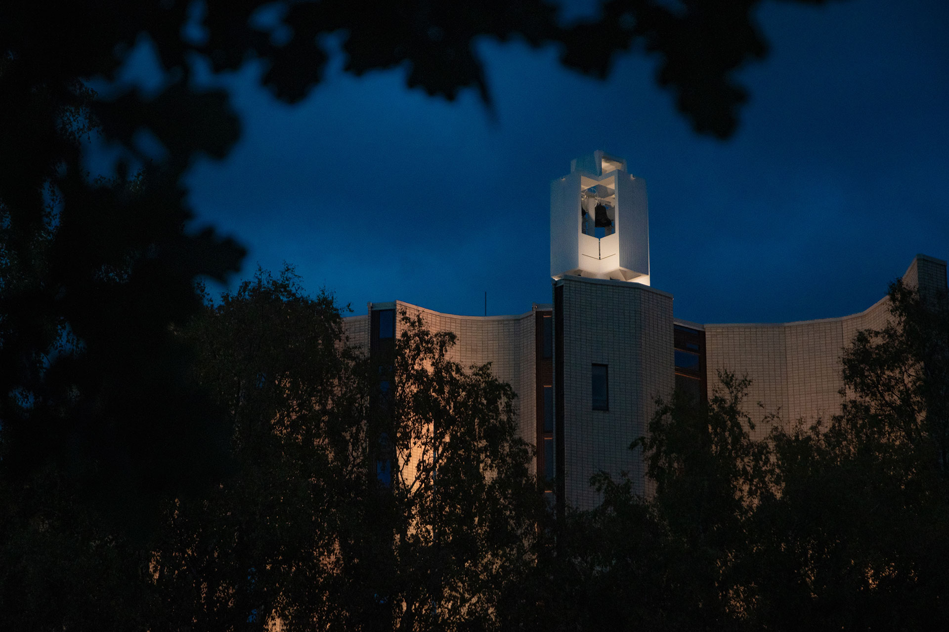 Despite the technical possibilities of dynamic and color-changing lighting, the everyday exterior lighting appearance is based on white light. The primary exterior lighting scene consists of a subtle, slow transition between warm and neutral white tones, moving gently around the building. This restrained movement brings life to the façade without drawing attention away from the architecture itself. The bell tower remains static, reinforcing its calm and monumental character.
