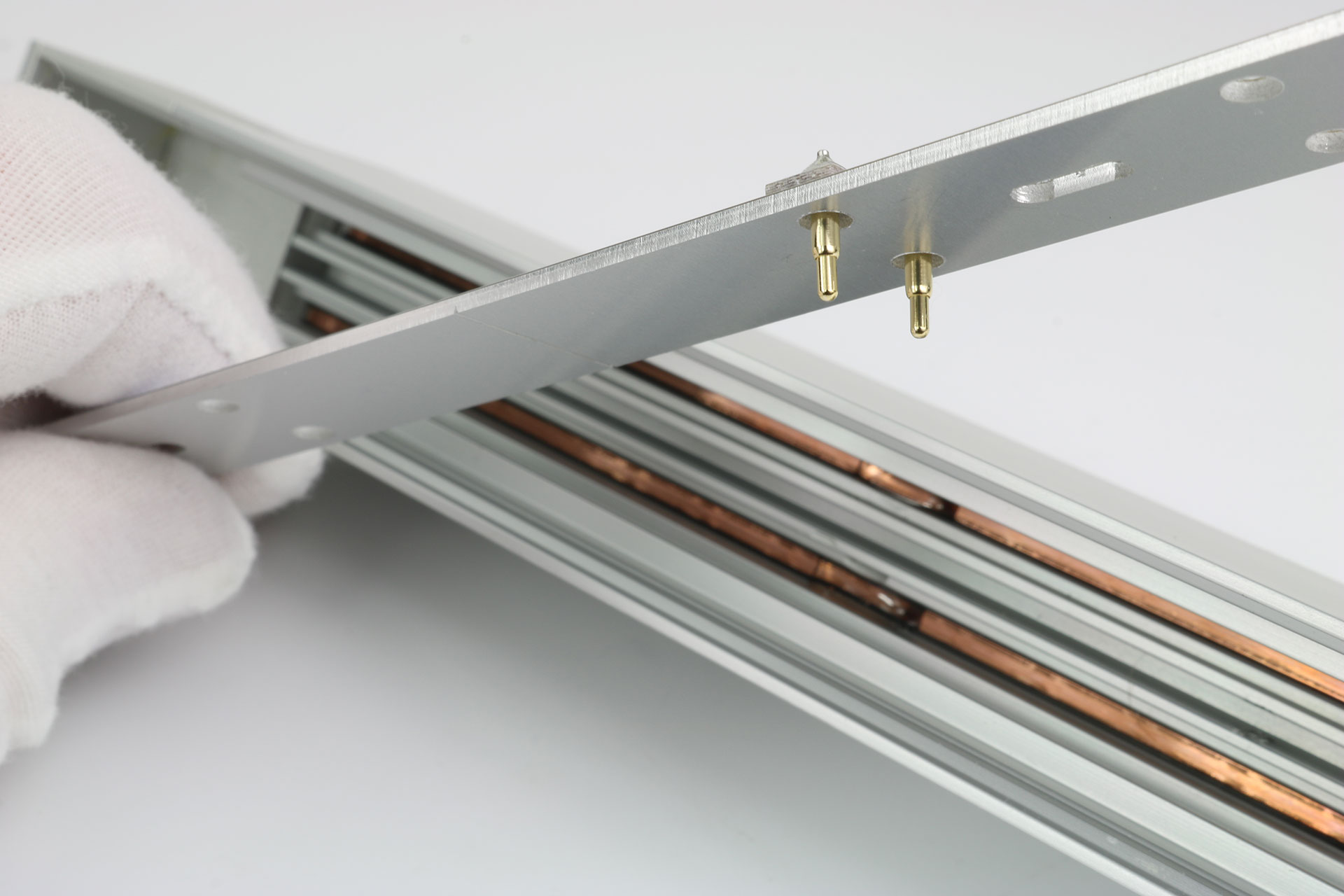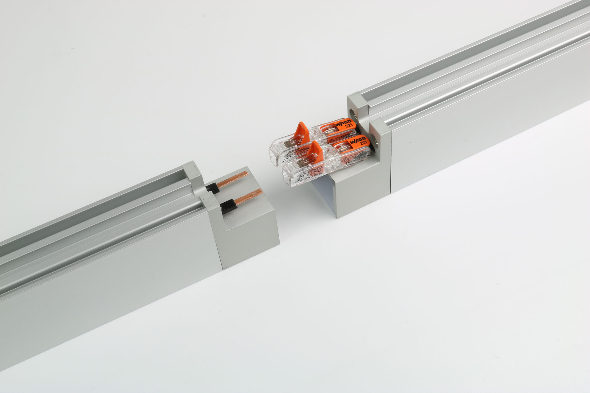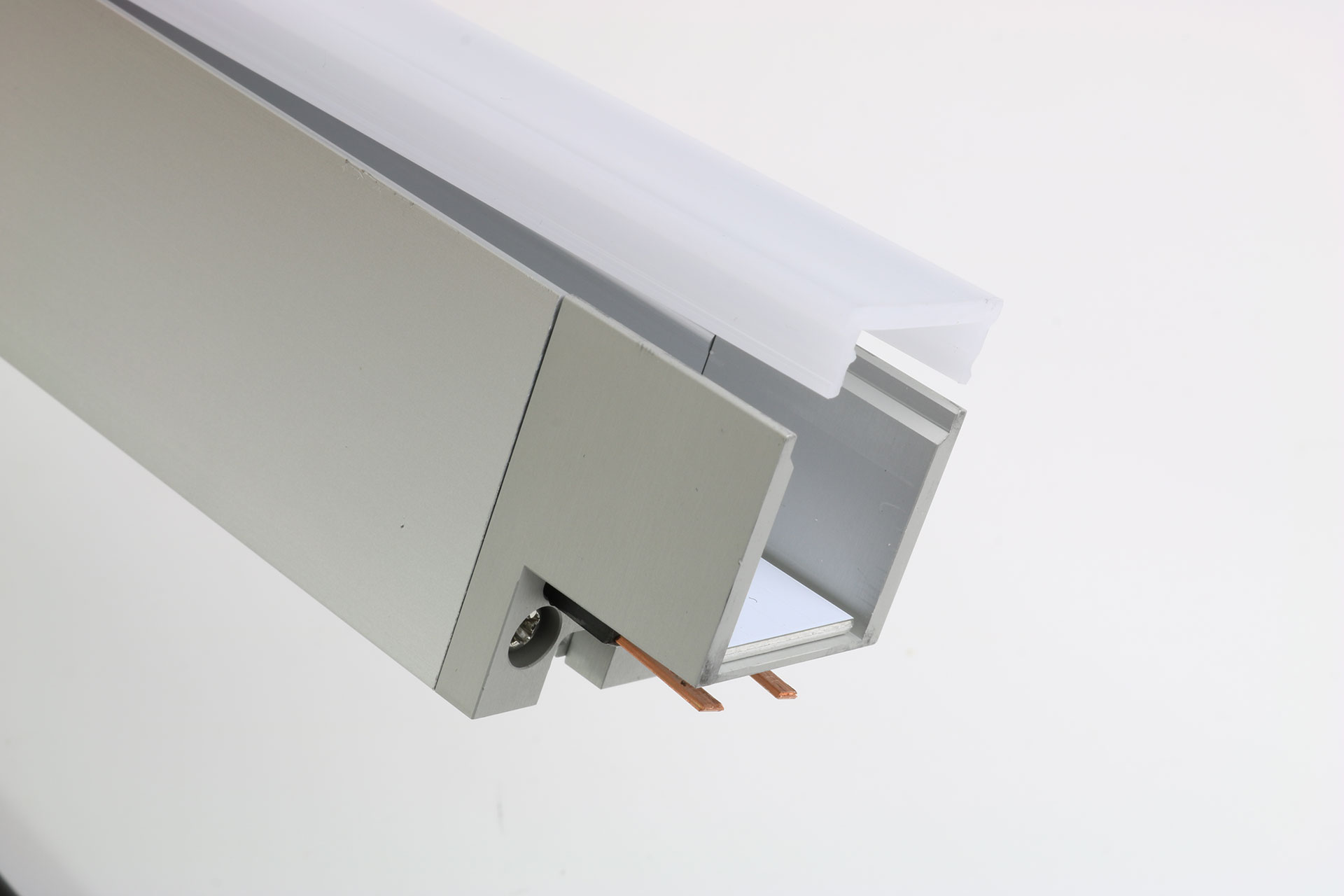 • Aluminium profile housing with internal 24V DC power fed copper conductors with no polarity.