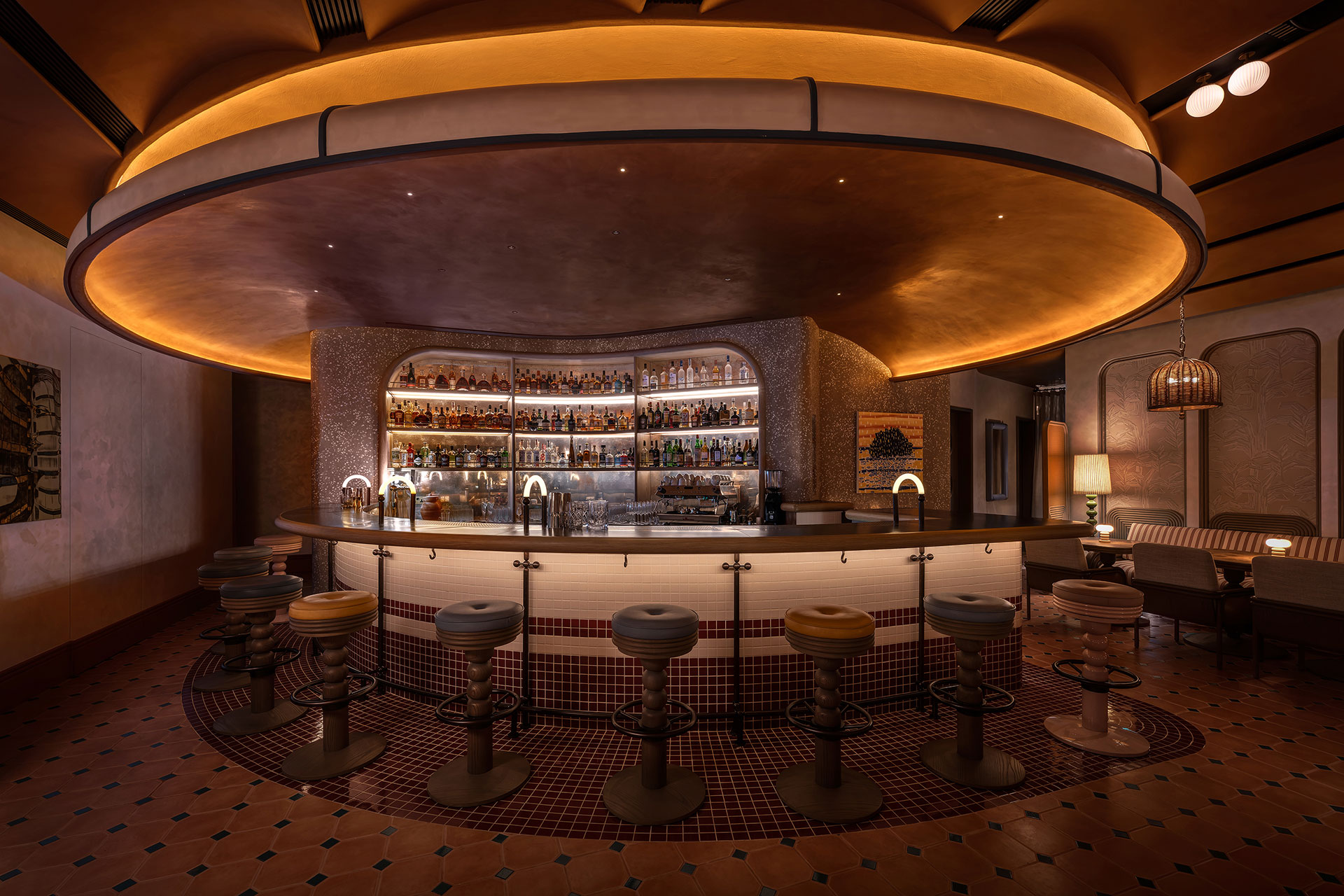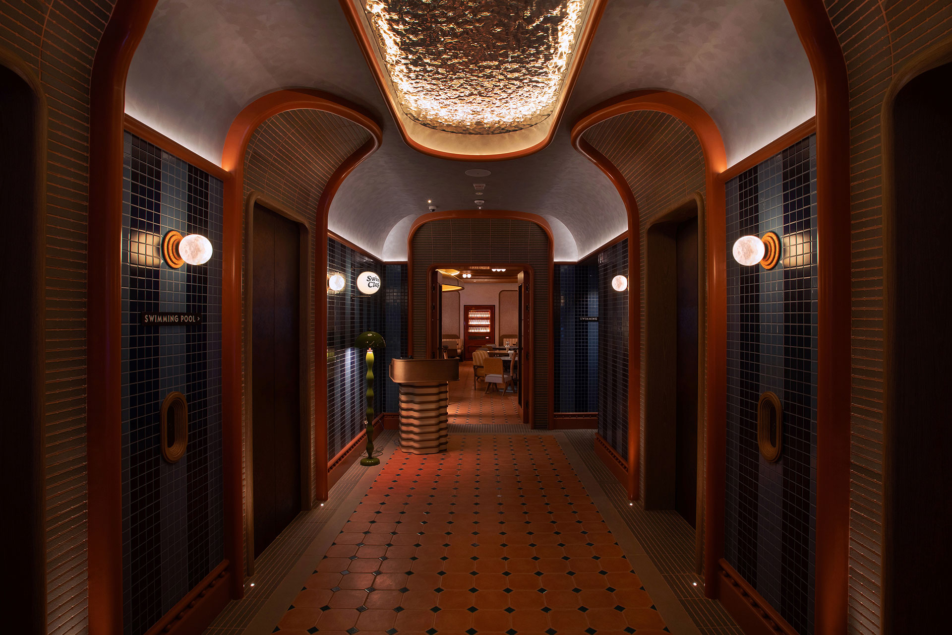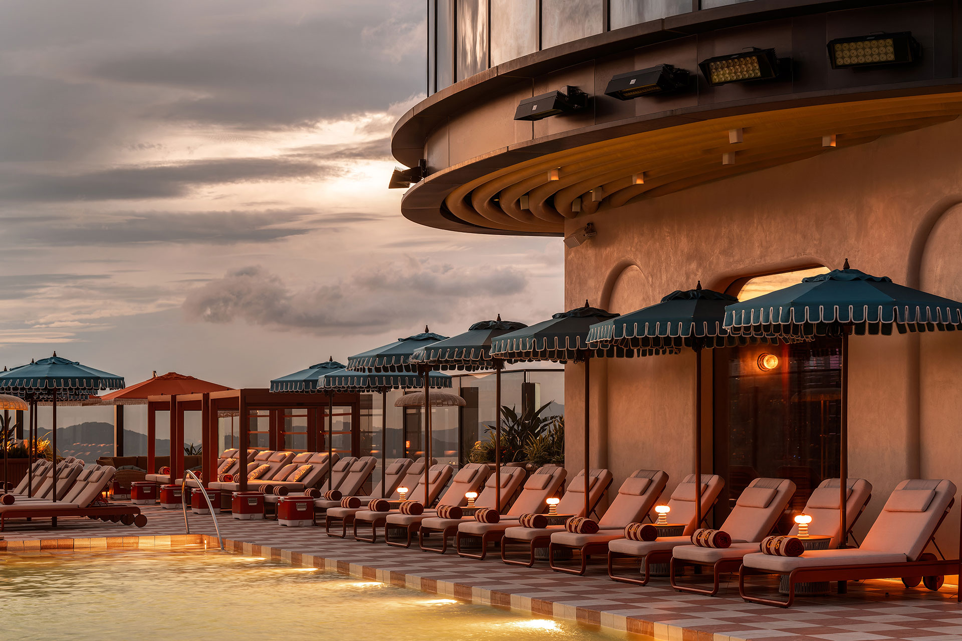 The journey begins at the entrance, where light flows through curved ceilings and walls, blending warm whites with subtle green reflections from the pool. Layered illumination breathes life into the space, immersive and serene, drawing the gaze toward a framed city view. Inside Swim Club, ceiling fixtures cast golden hues, while table lamps create intimacy, lighting conversations like quiet stages. Beyond the windows, Hong Kong glows against the bar’s haloed curves and shimmering backlit bottles, evoking sunlight on water.