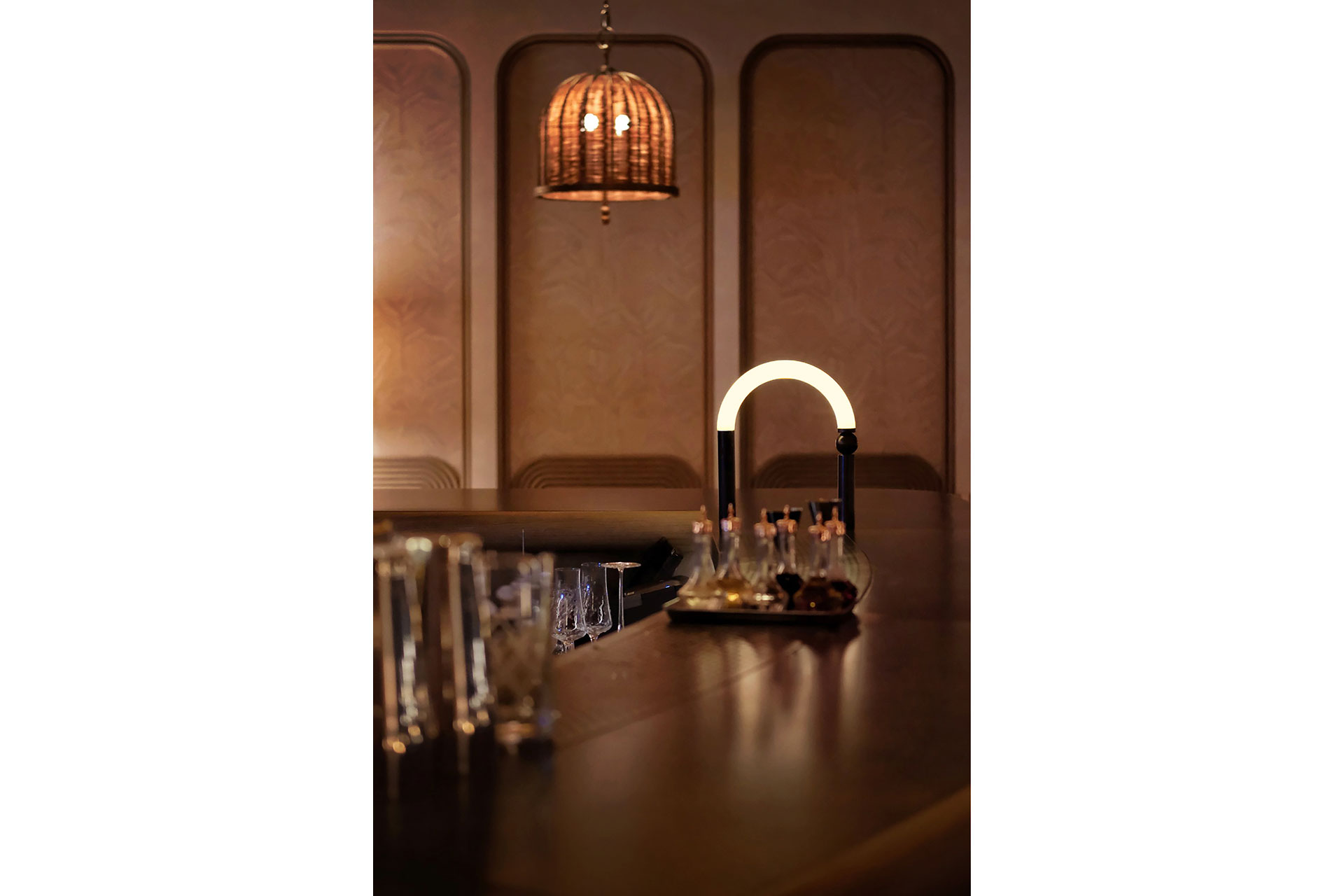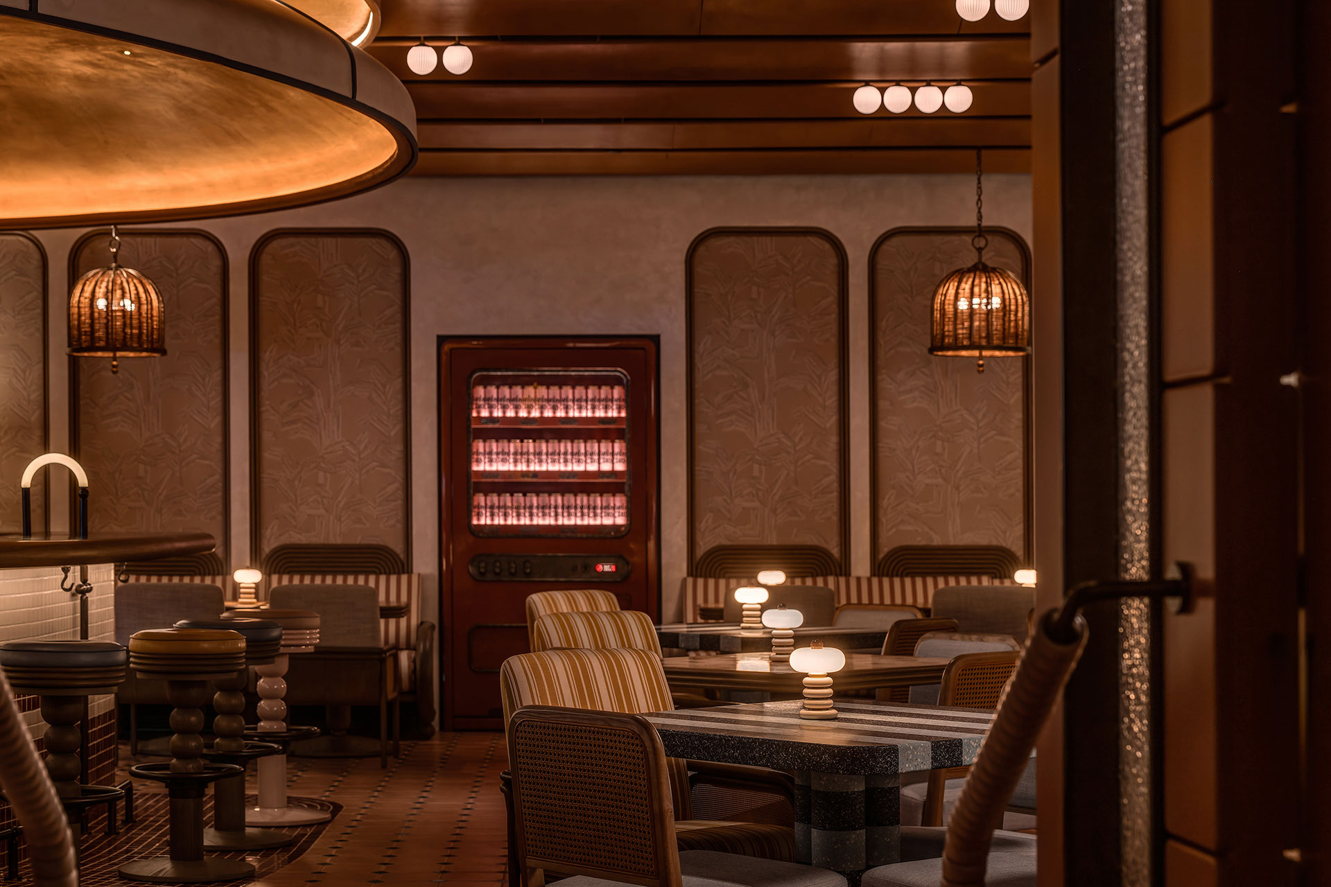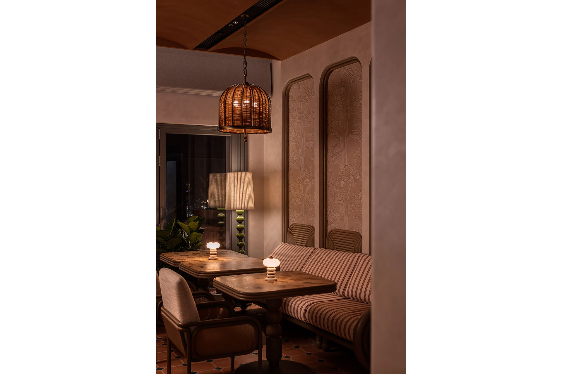 The journey begins at the entrance, where light flows through curved ceilings and walls, blending warm whites with subtle green reflections from the pool. Layered illumination breathes life into the space, immersive and serene, drawing the gaze toward a framed city view. Inside Swim Club, ceiling fixtures cast golden hues, while table lamps create intimacy, lighting conversations like quiet stages. Beyond the windows, Hong Kong glows against the bar’s haloed curves and shimmering backlit bottles, evoking sunlight on water.