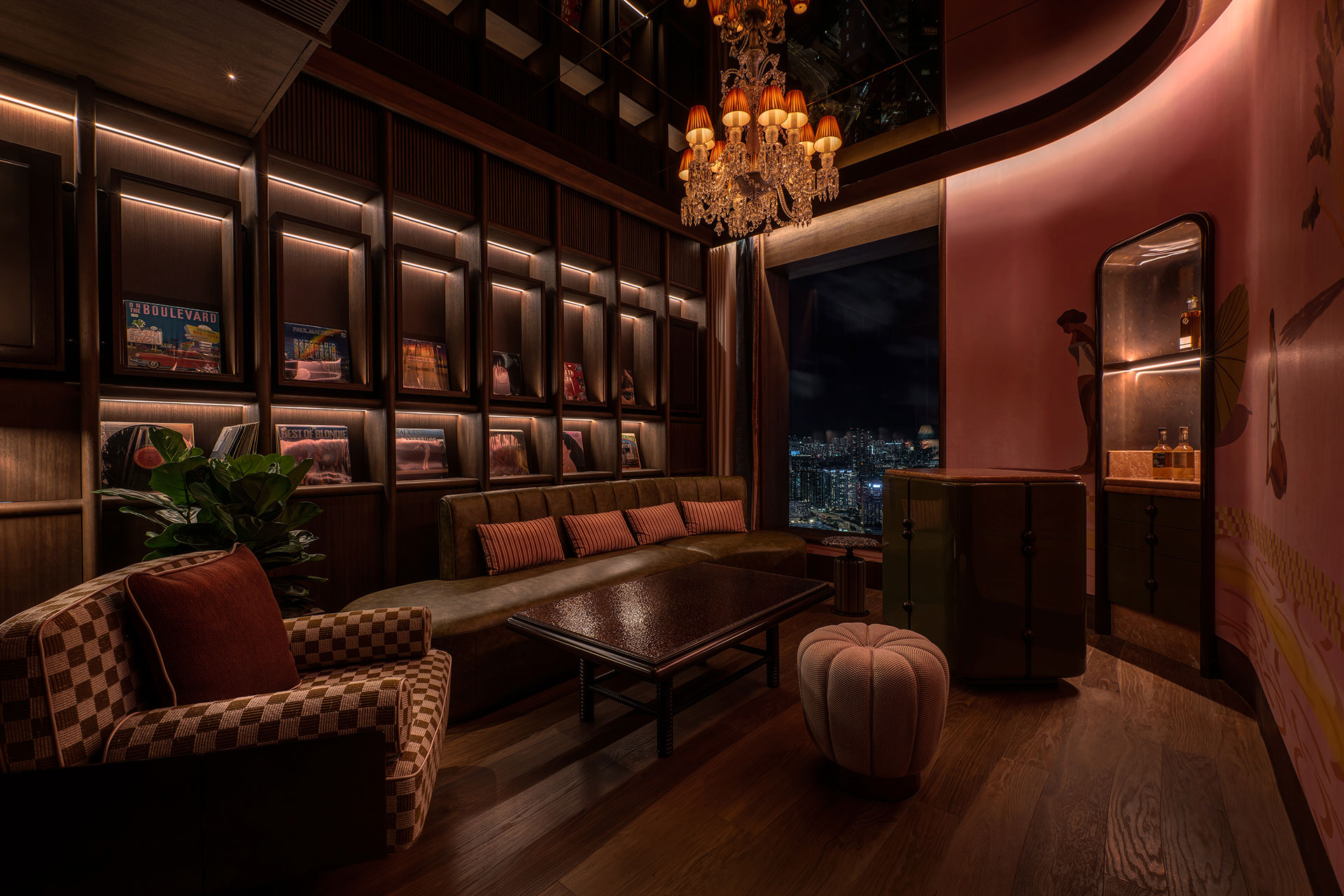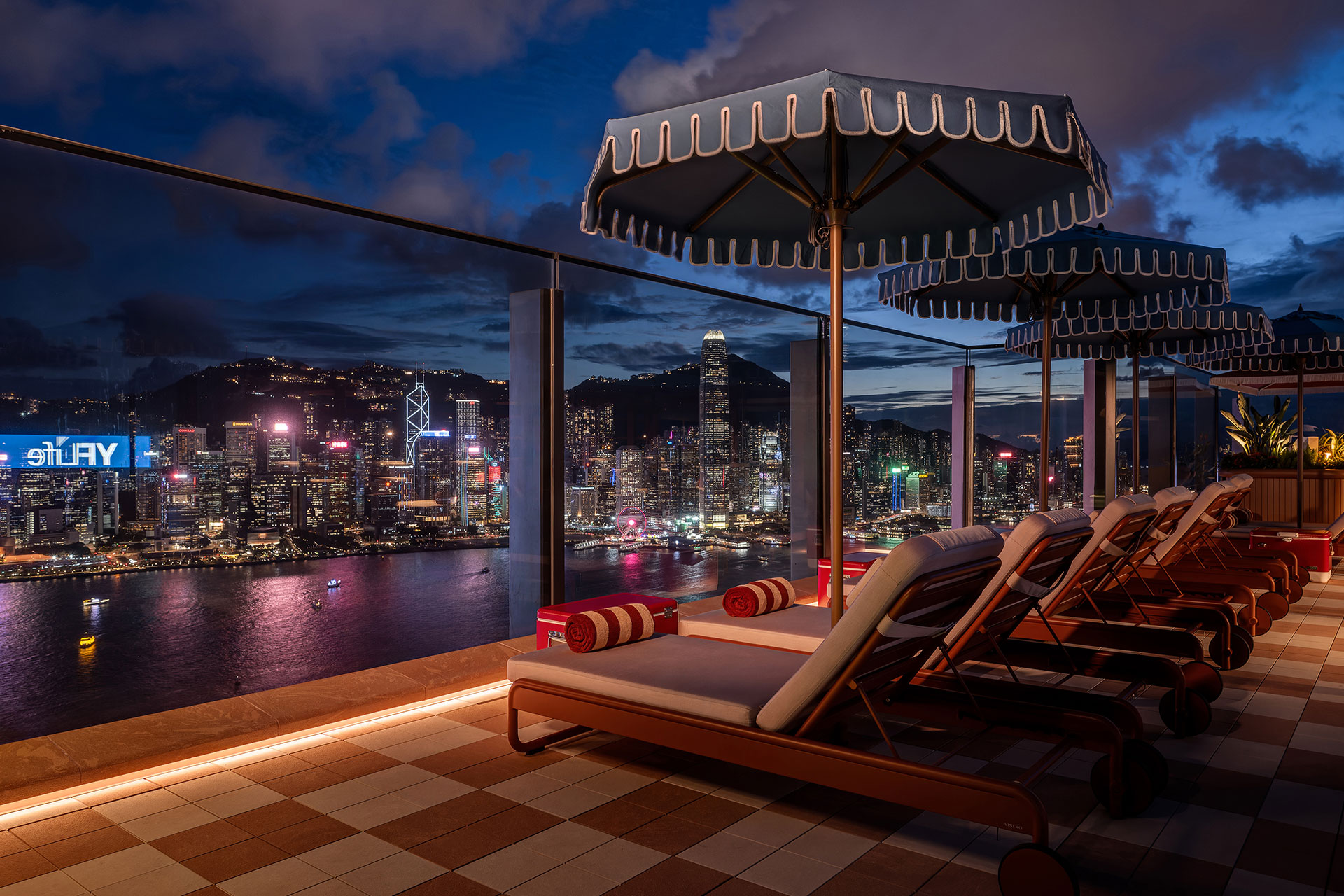 A hidden door reveals High Dive—a secluded lounge for intimate gatherings. Here, chandeliers and ambient glows enrich textures and colors, balancing refinement with comfort. Outdoors, the terrace opens to Victoria Harbour, bathed in warm light that encourages relaxation. Subtle reflections guide the eye outward, framing the skyline and bridging calm elegance with the city’s vibrant rhythm.