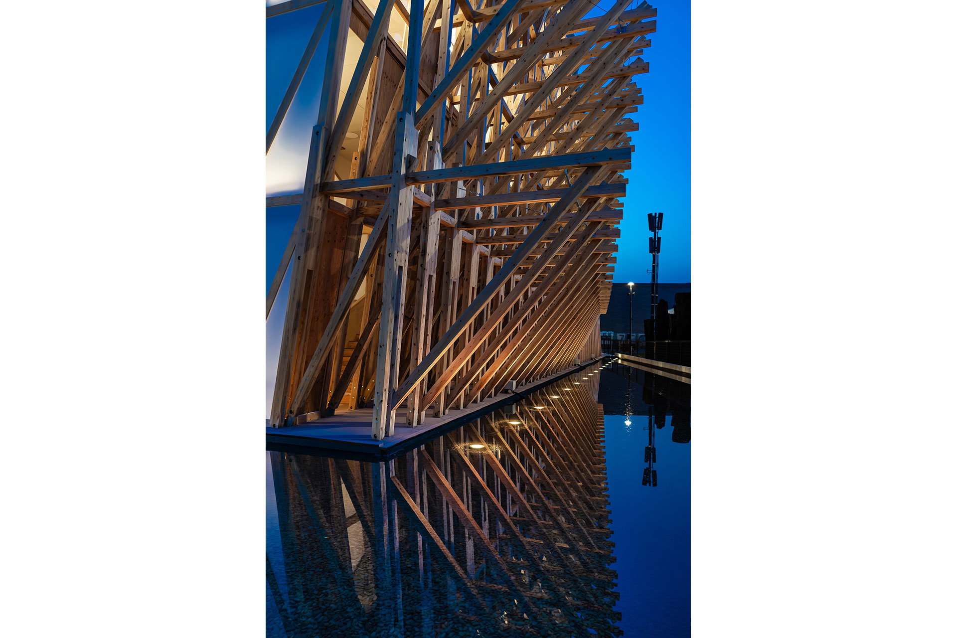 Underwater lighting installed in the water features on both sides of the pavilion illuminates the 13.8 m height wooden structure, creating the impression that the pavilion is receiving light from the “Mother Sea” as it sails.