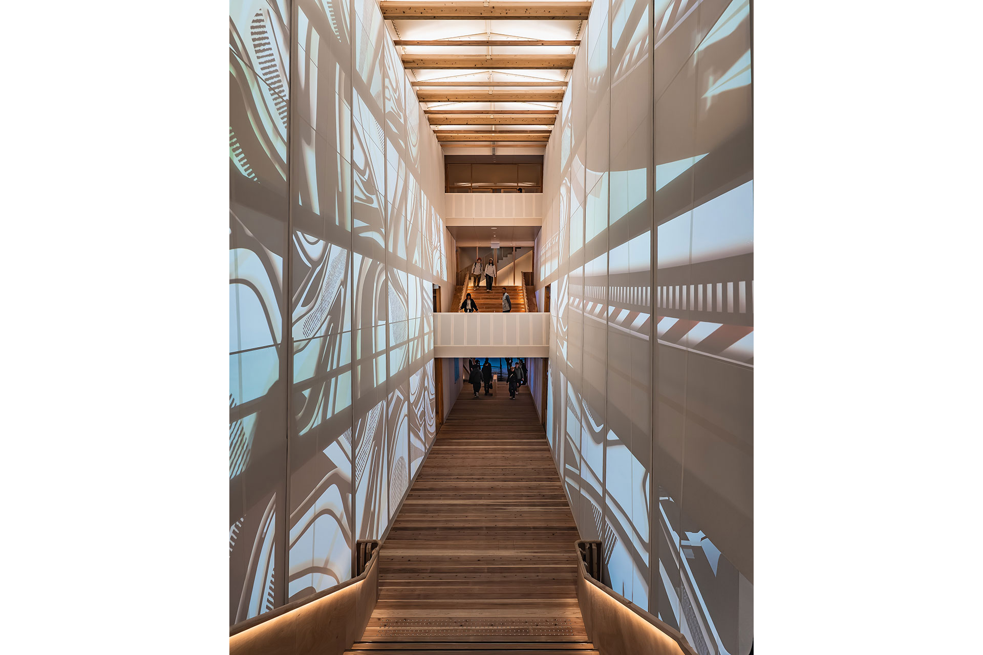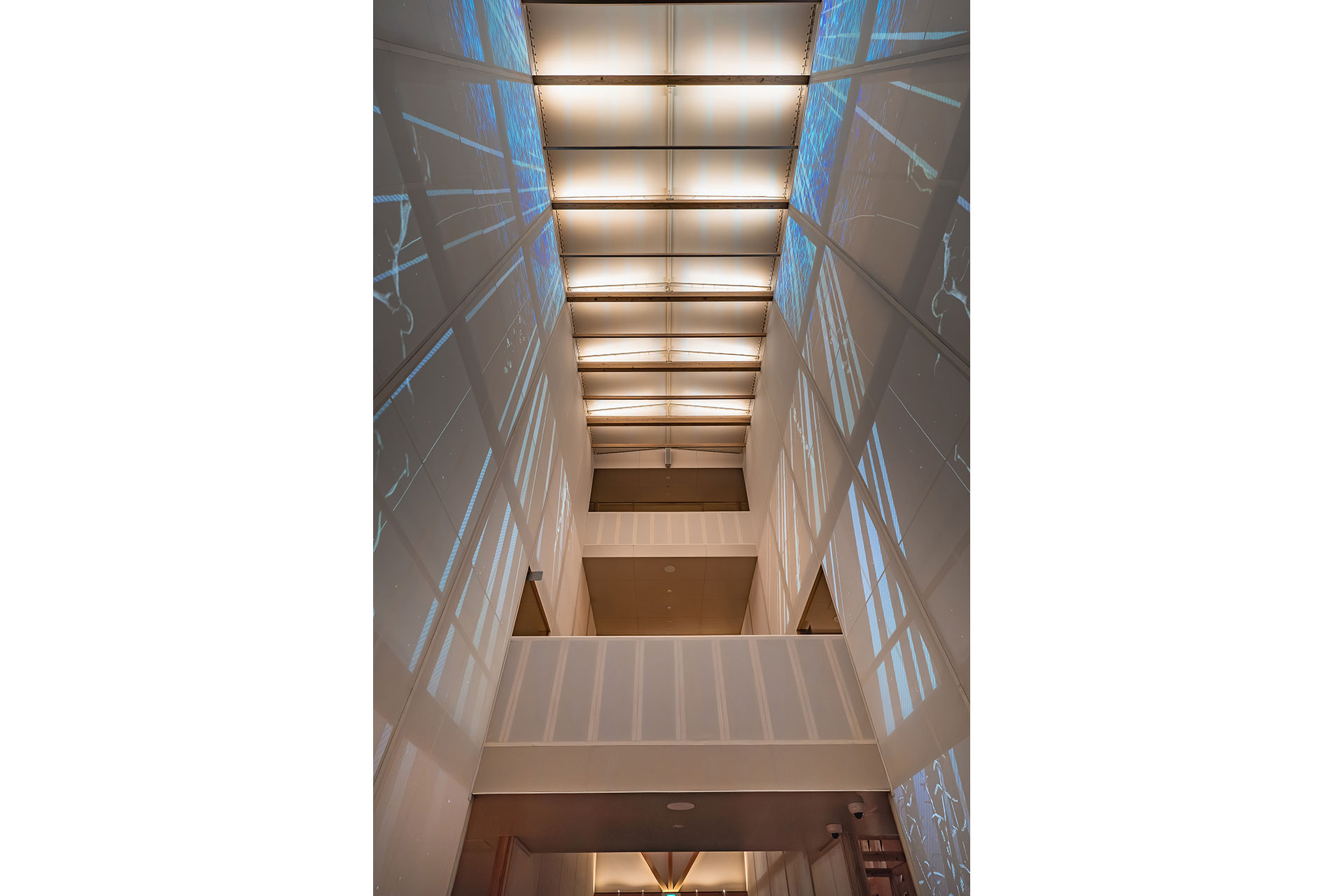 The fourth floor features a distinctive ceiling with a gentle curved shape. Indirect lighting installed on the outer beams of the corridor creates a gradient of light along the ceiling’s curve, accentuating its form.