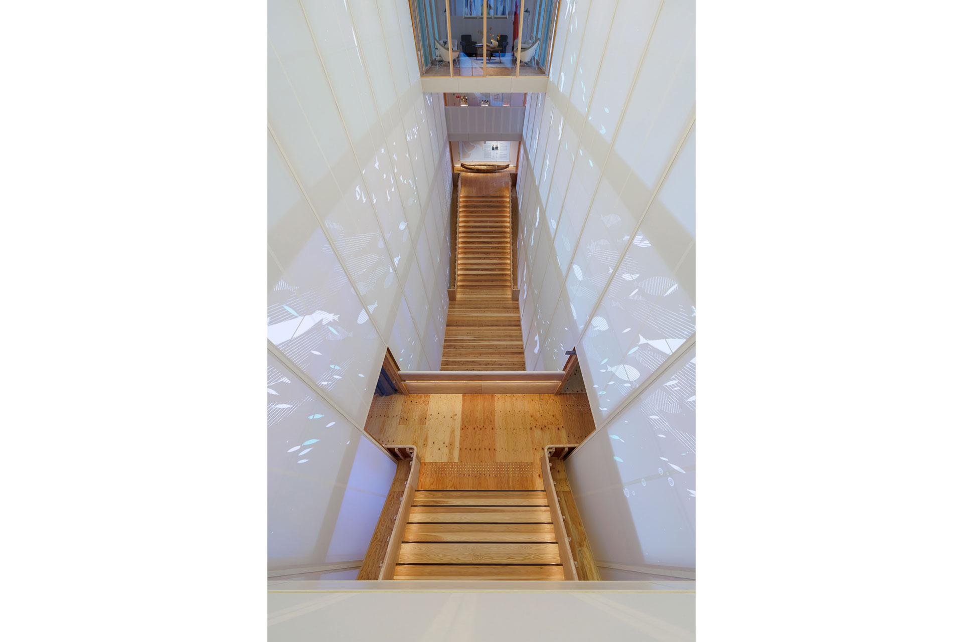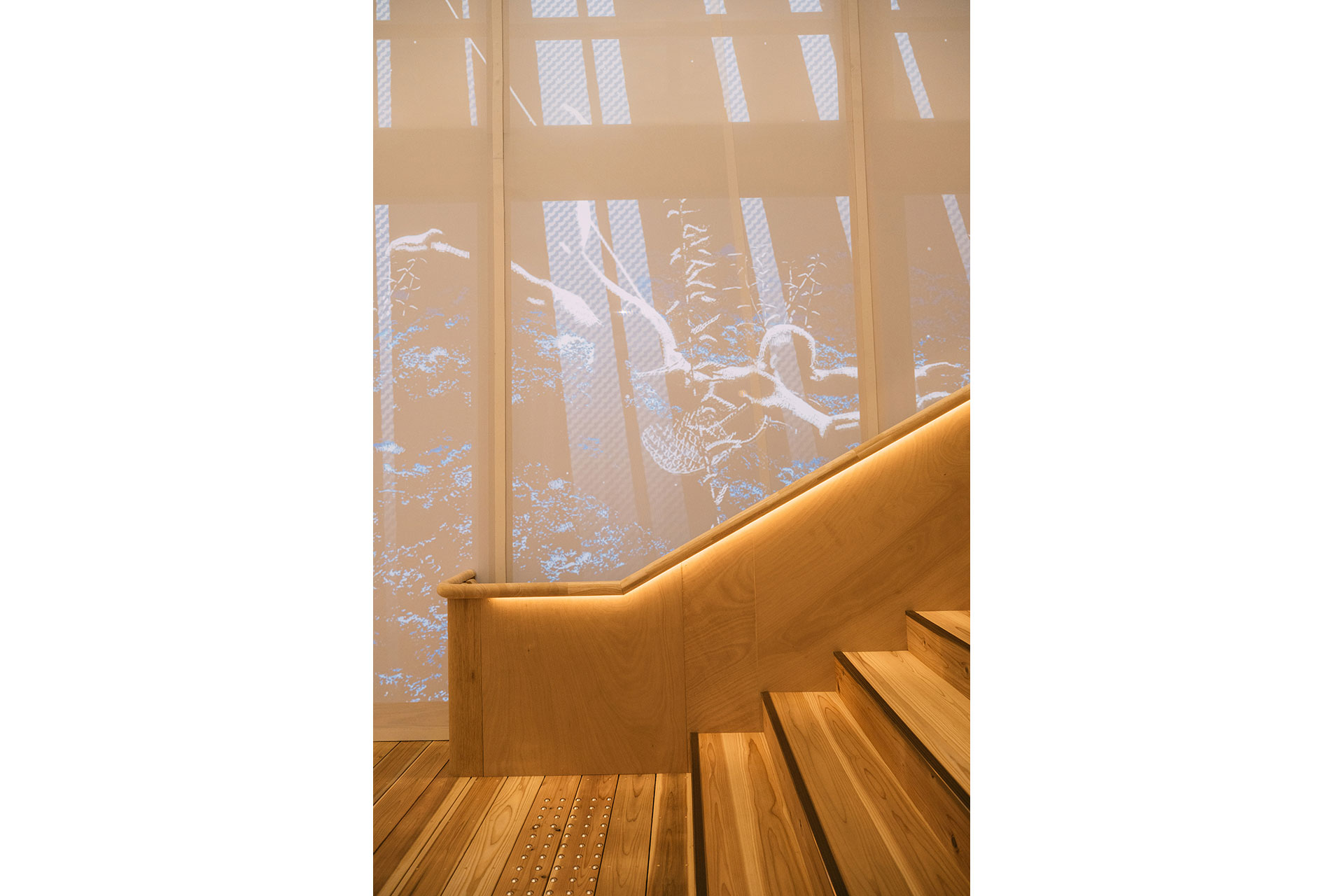 All light passing through the mesh membrane is indirect, preventing glare. High-power linear lighting on the fourth-floor beams of the central atrium also reflects off the mesh, blending with natural light. This envelops visitors on the first floor in a sensation reminiscent of the “Mother Sea” or a protective “mother’s womb.” The linear lighting installed above the beams is concealed by wooden curtain boards. As a result, visitors can experience the light naturally cascading from above like natural daylight at night, without being aware of the presence of the fixtures.