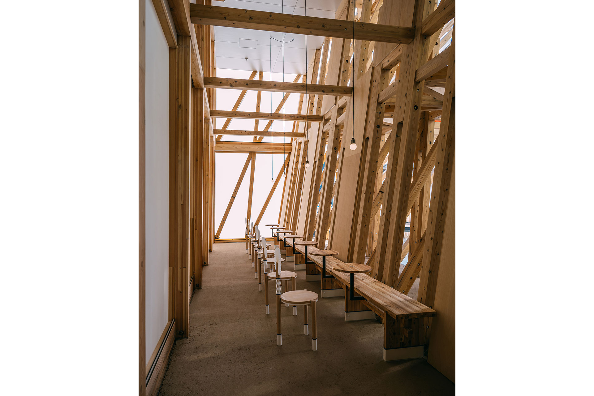 The large wooden-structured pavilion is designed to create a “well-being lighting environment” through lighting design and a dimming control system.
