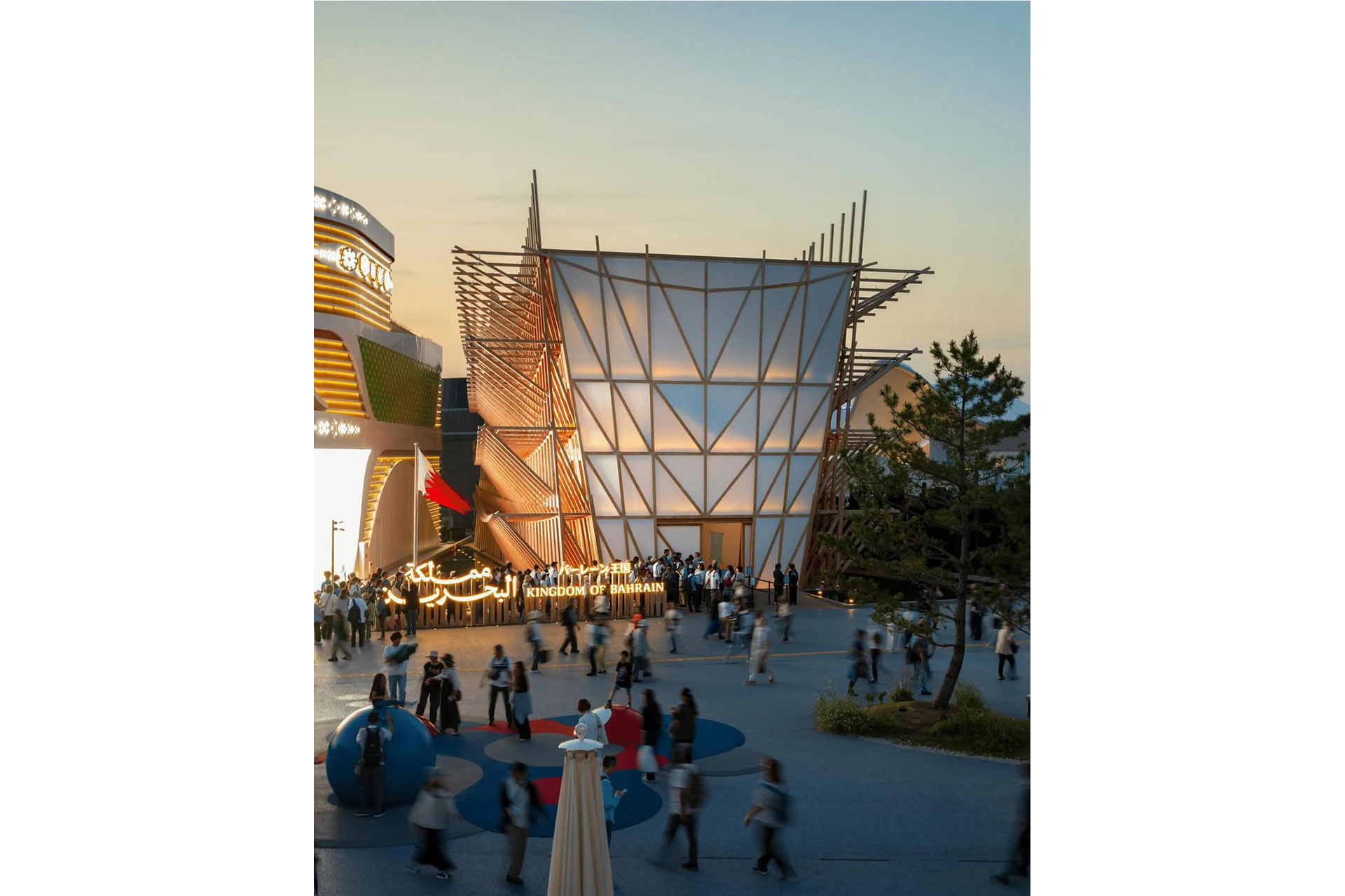 The pavilion’s defining features, the wooden structure and mesh membrane, evoke Bahrain’s traditional sailing vessel, the dhow boat. Constructed from approximately 3000 wooden pieces, it functions as a modern vessel carrying a story of connection between the two nations, the art of joinery, and cultural exchange. All wooden pieces are fully reusable after the Expo, reflecting a sustainable design philosophy.