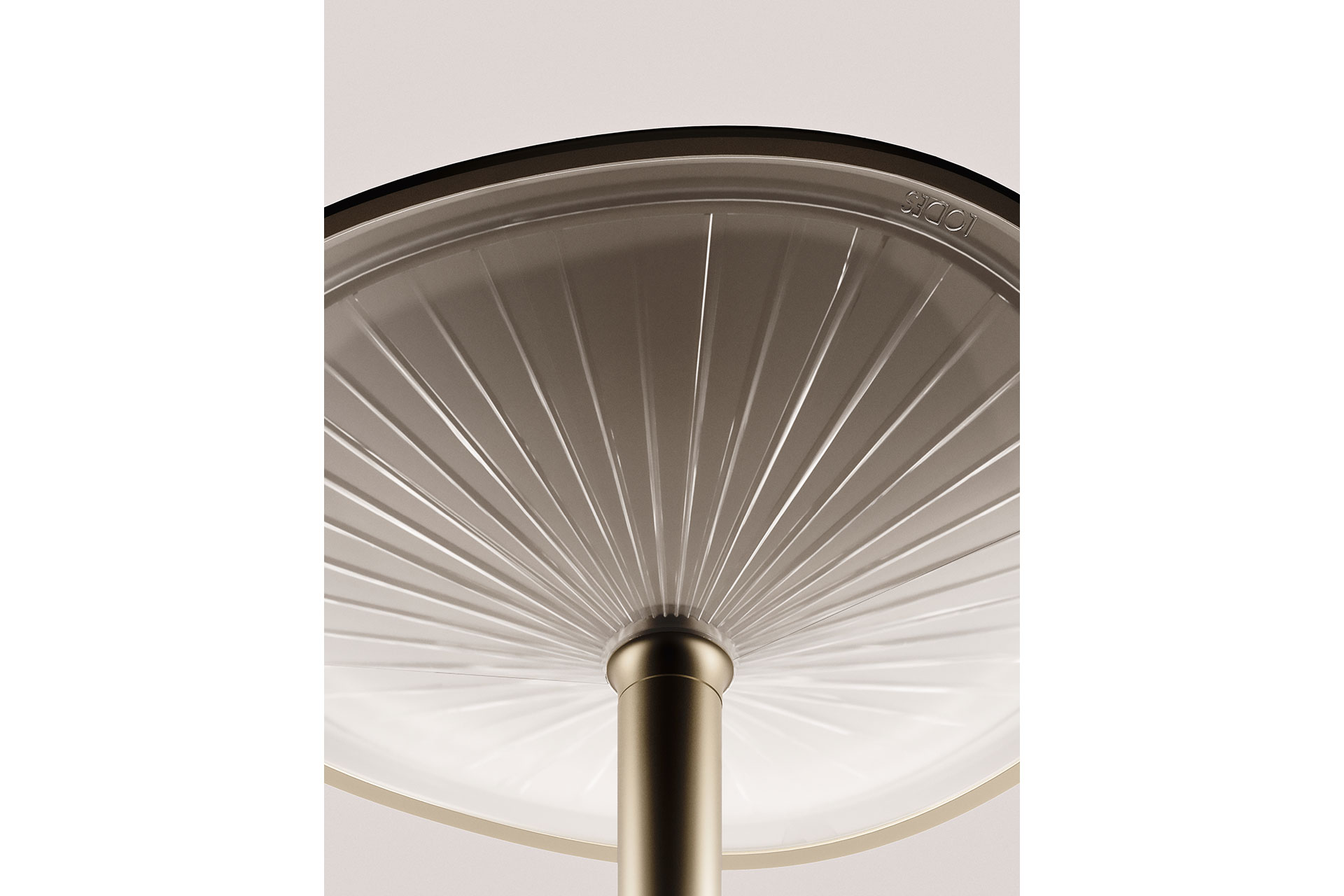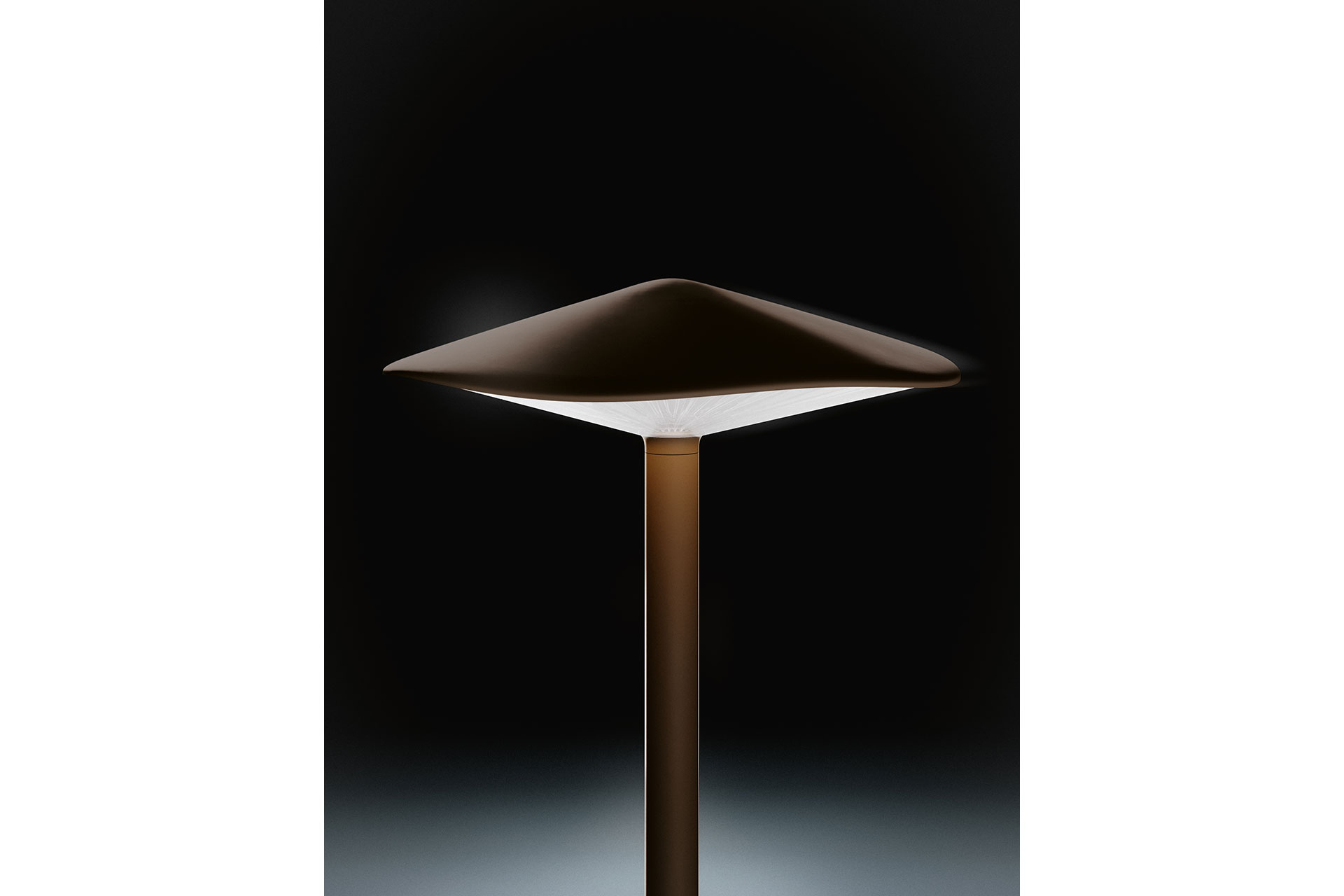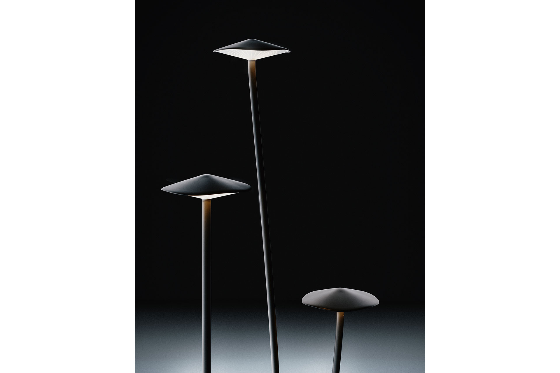 The elegant silhouette evokes the shape of a mushroom – hence the name Kinno, which means ‘mushroom’ in Japanese – and plays with visual perception to suggest the imperfect harmony of the natural world. The cap, which appears perfectly circular from above, reveals a soft irregularity when viewed from other angles, emphasising its organic design. Similarly, the radial slats – deliberately inserted beneath the cap – create a natural, unexpected effect that is echoed in the stem, available in either a straight or curved version, adding a sense of movement and spontaneity to the lighting composition.