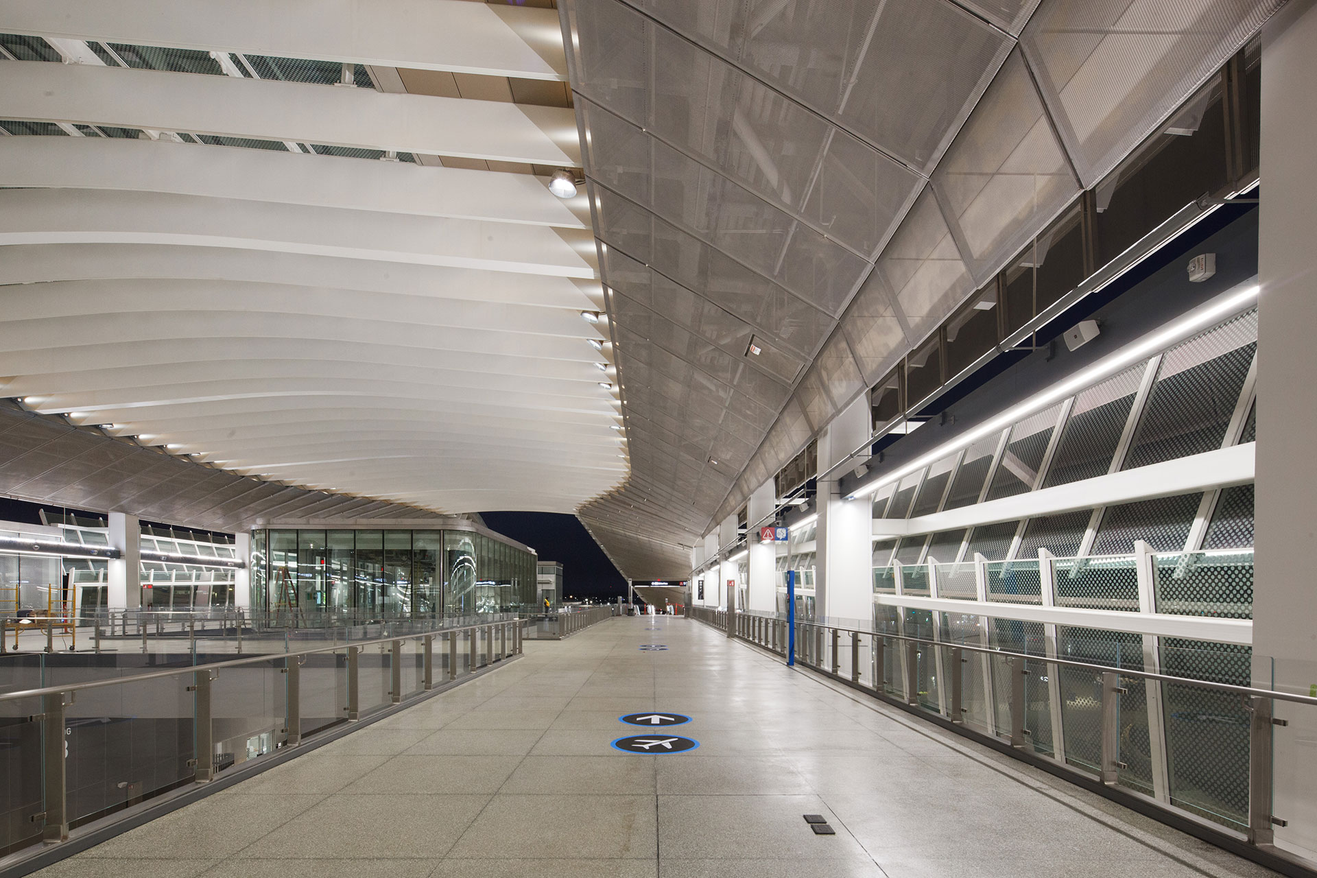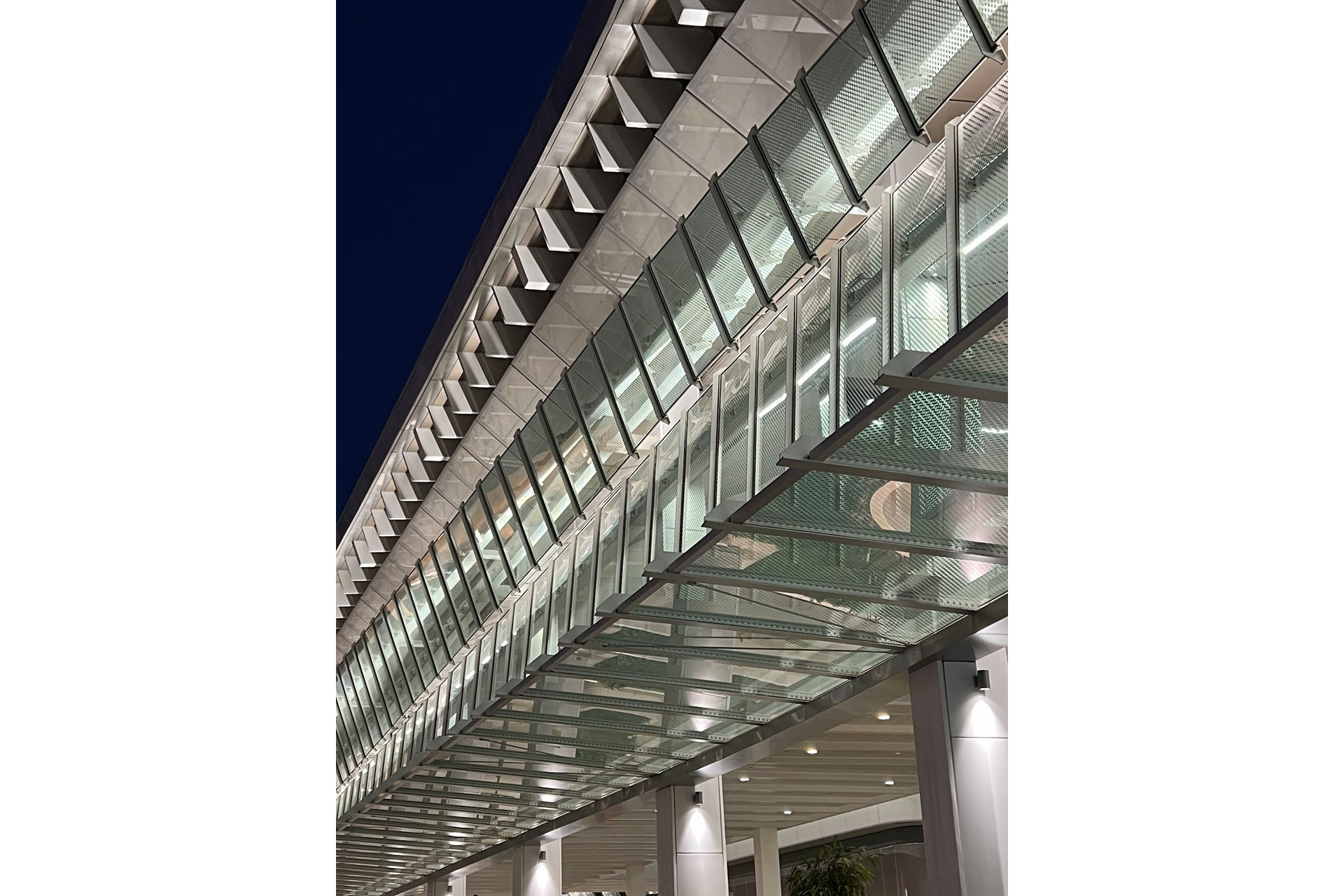 Perforated metal panels with undulating geometries form an elegant ceiling. The asymmetric, sloping façade panels presented a challenge for consistent illumination. Each bay contained multiple unique mounting conditions and geometries. Rather than customizing luminaires for each variation, the team developed a modular system of surface- and arm-mounted adjustable uplights. This solution design and construction, reduced costs, and allowed for attic stock to support future maintenance. The uplighting emphasized the floating, airy ceiling and enhanced perceived brightness during nighttime hours.