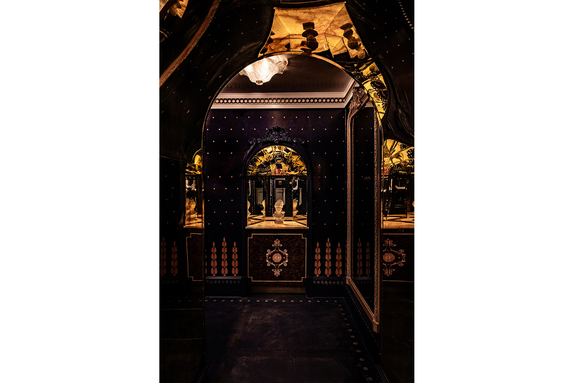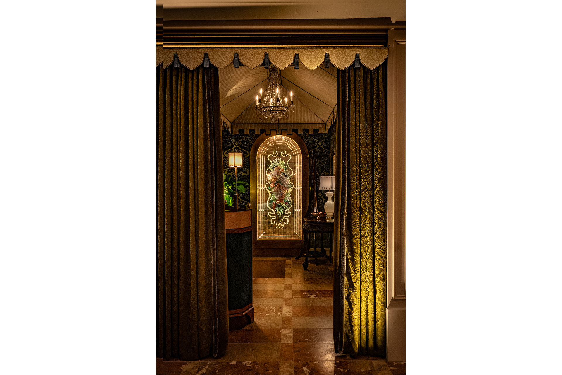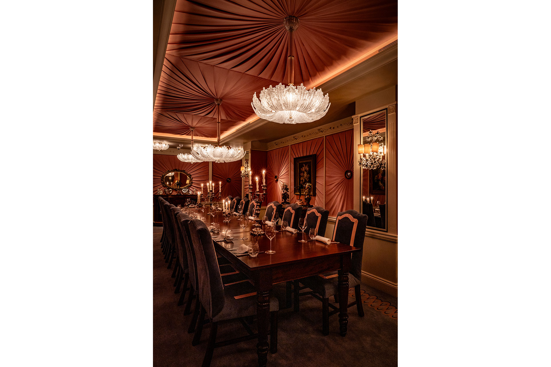 In the basement hides a private dining room accessible via a secret door. Concealed within is a dramatic and opulent dining room complete with decorative crystal chandeliers and illuminated ceiling coves washing warm light across the fabric ceiling, adding to the story telling of this dining experience.