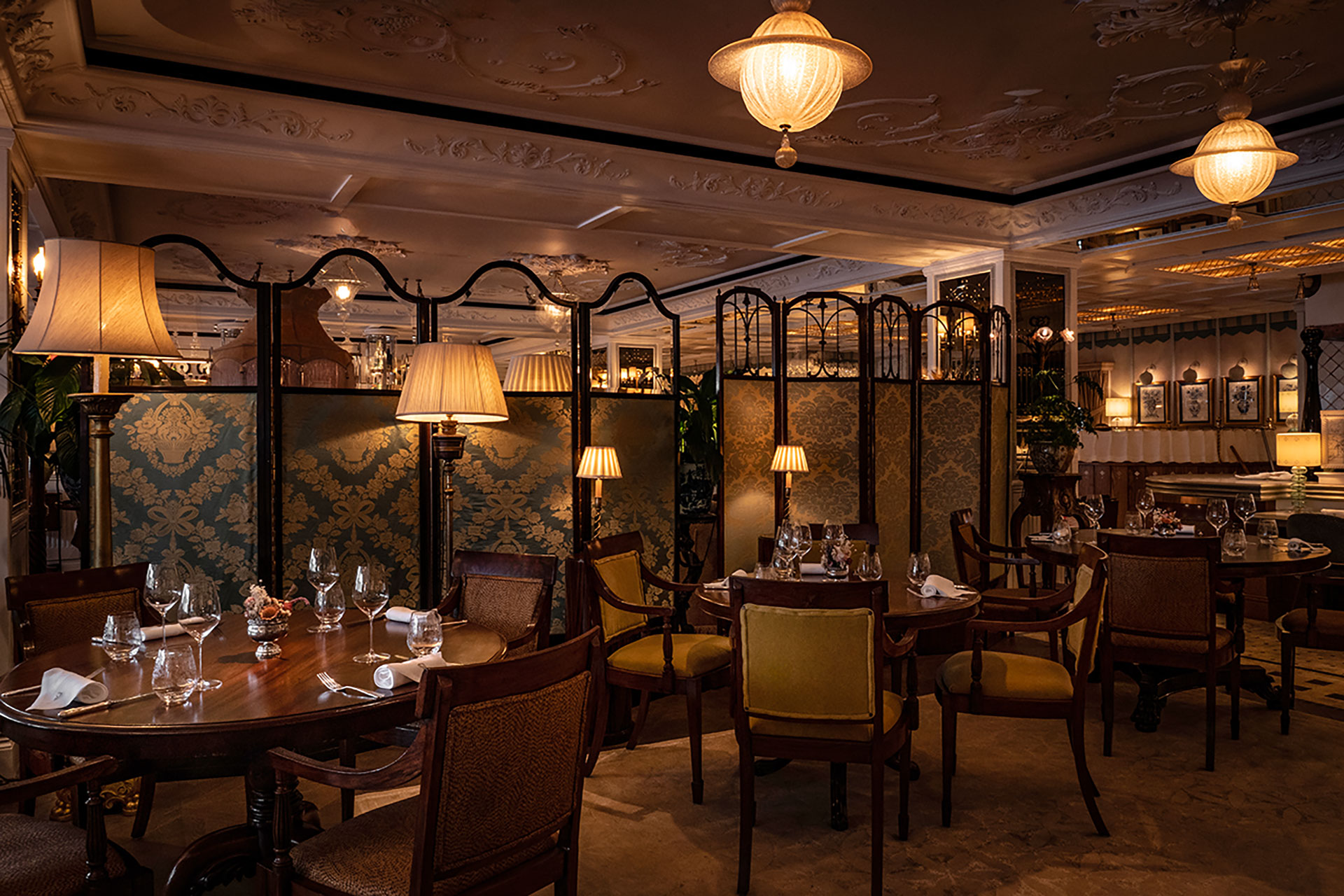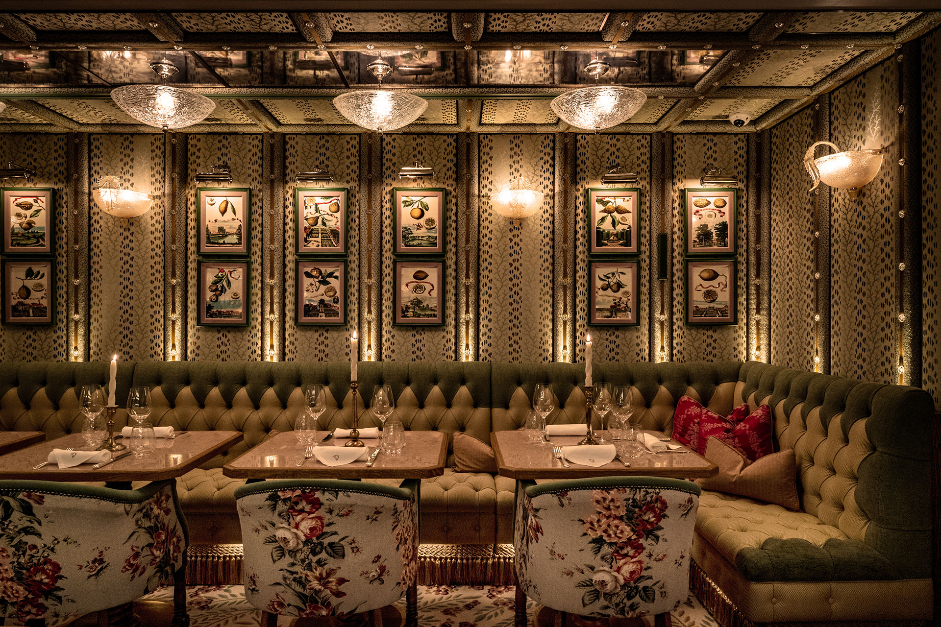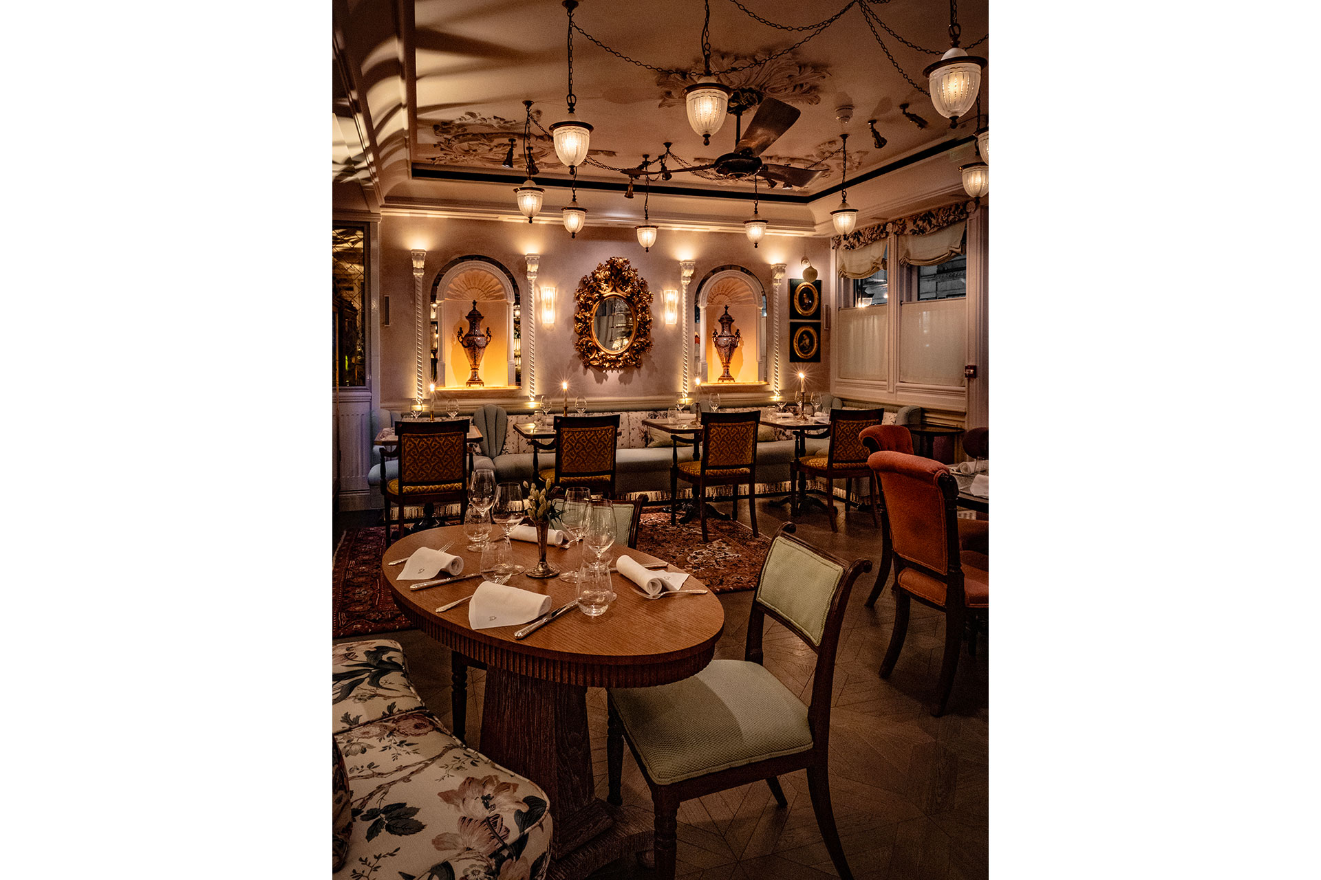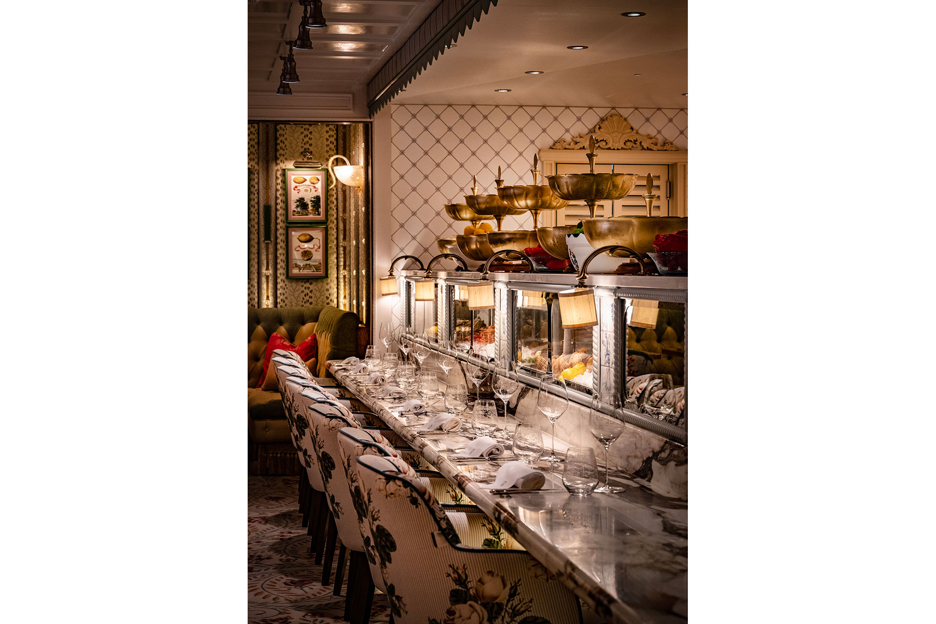 Through the entrance portal guests are presented with a dining room filled with patterned fabrics, textures and colours. Every light fixture and detail has been carefully curated to ensure that guests are immersed in this luxurious setting, whilst retaining the essence of an intimate dining experience and grand residential character.