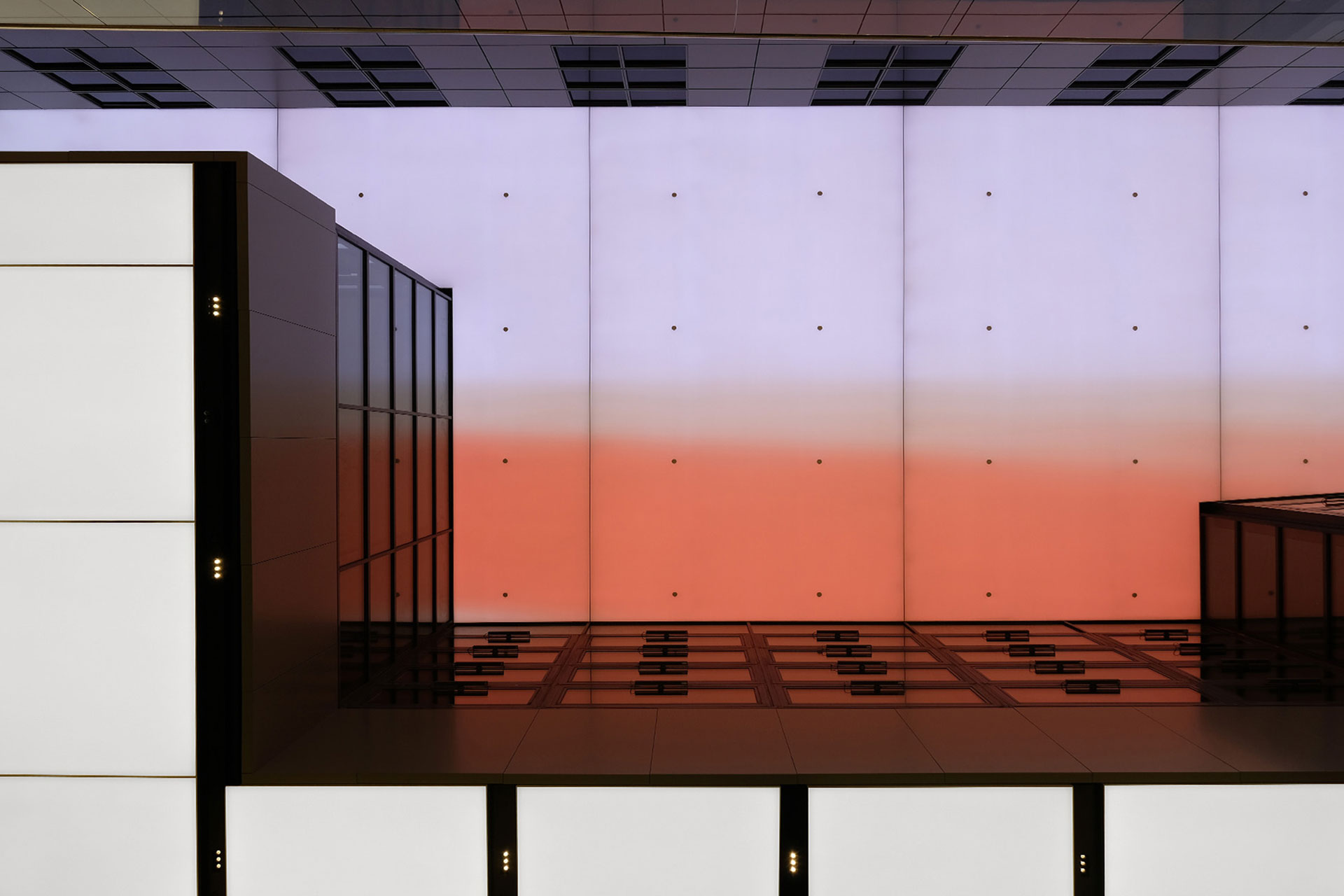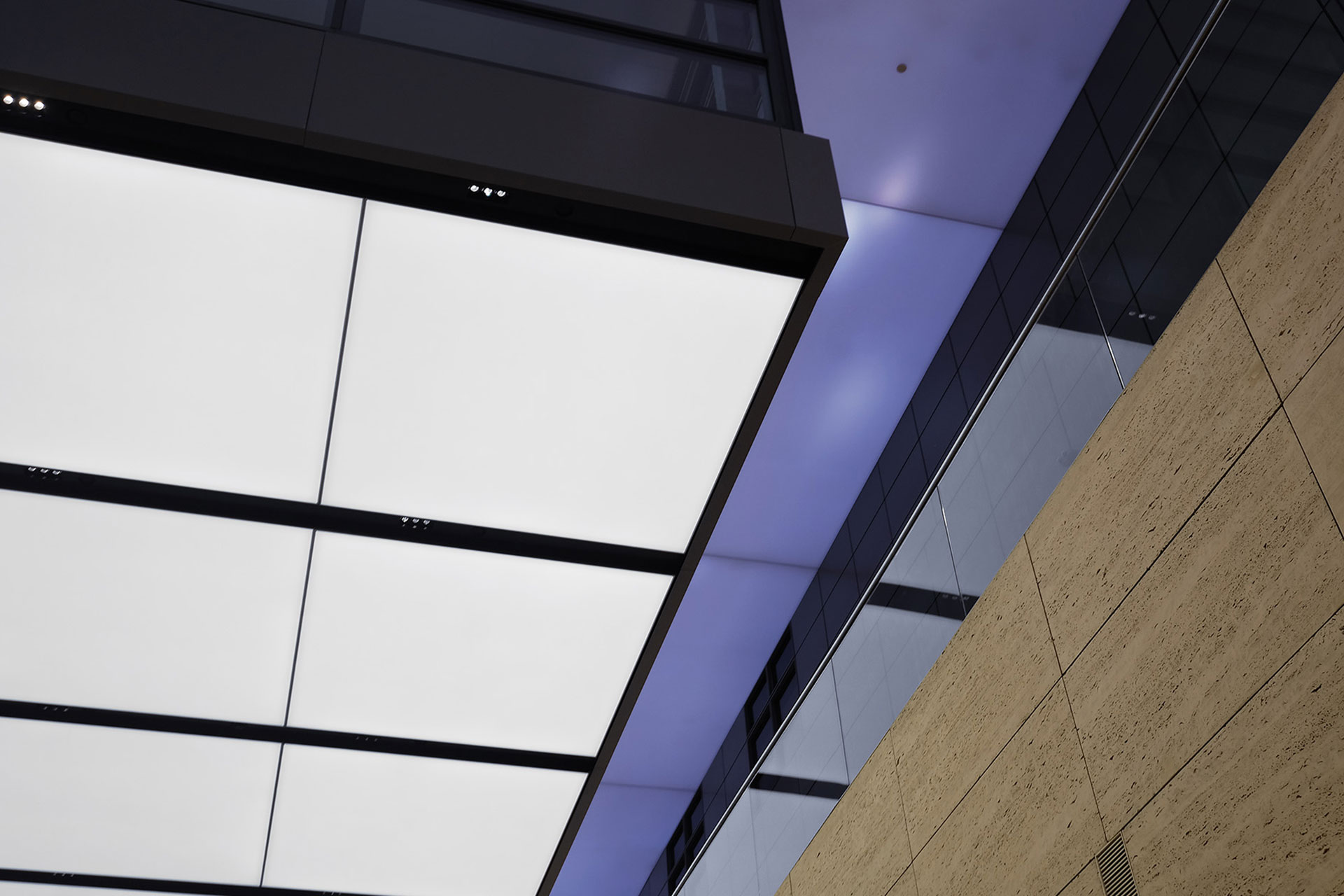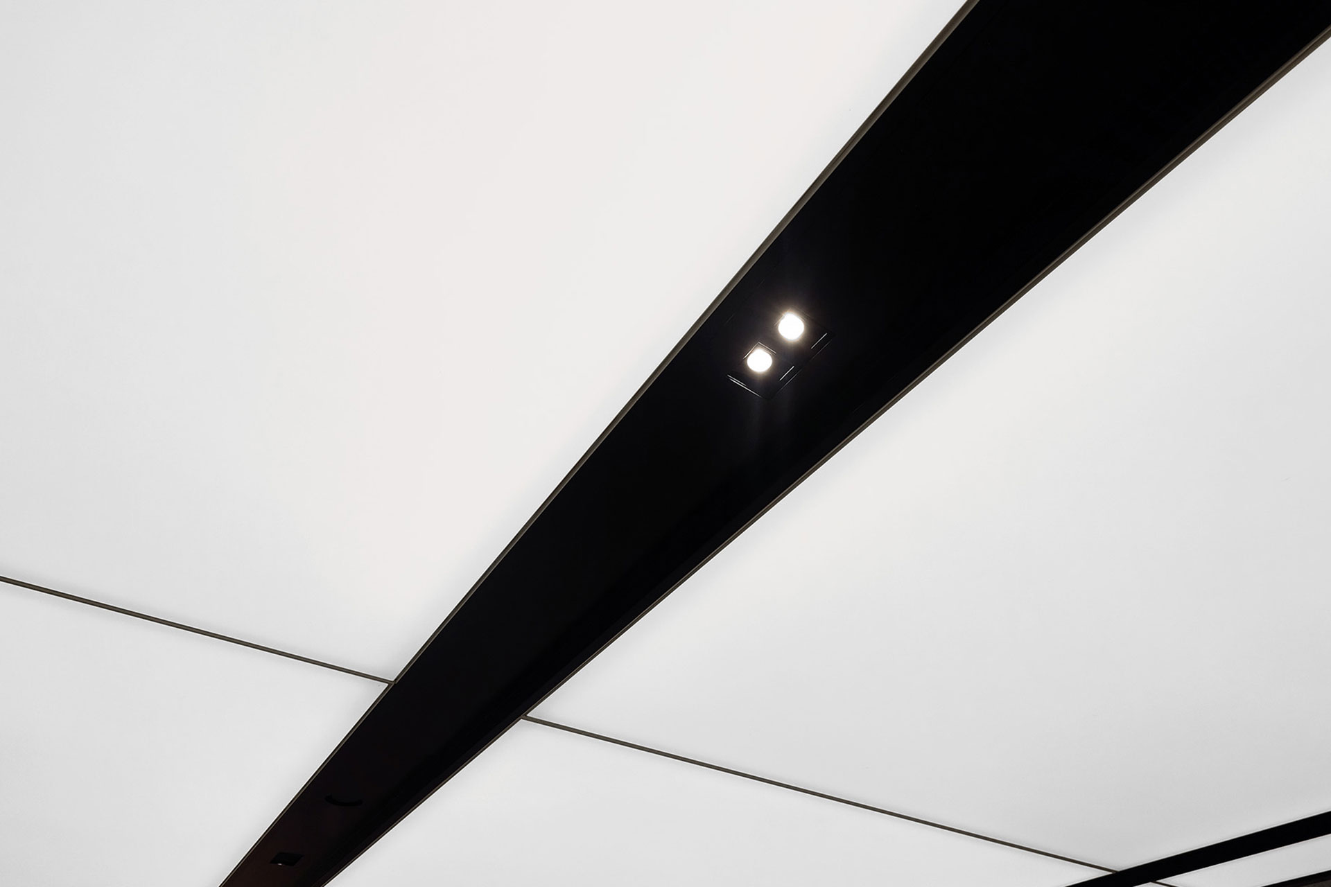 On the lower level, large backlit boxes form a continuous luminous surface. Custom-designed and fully serviceable, they diffuse uniform, glare-free light through double membranes, while discreet technical bands integrate downlights, safety systems, speakers, and cameras. LEDs arranged in a fifteen-centimeter grid ensure even, efficient distribution, while emergency modes maintain clarity in critical situations.