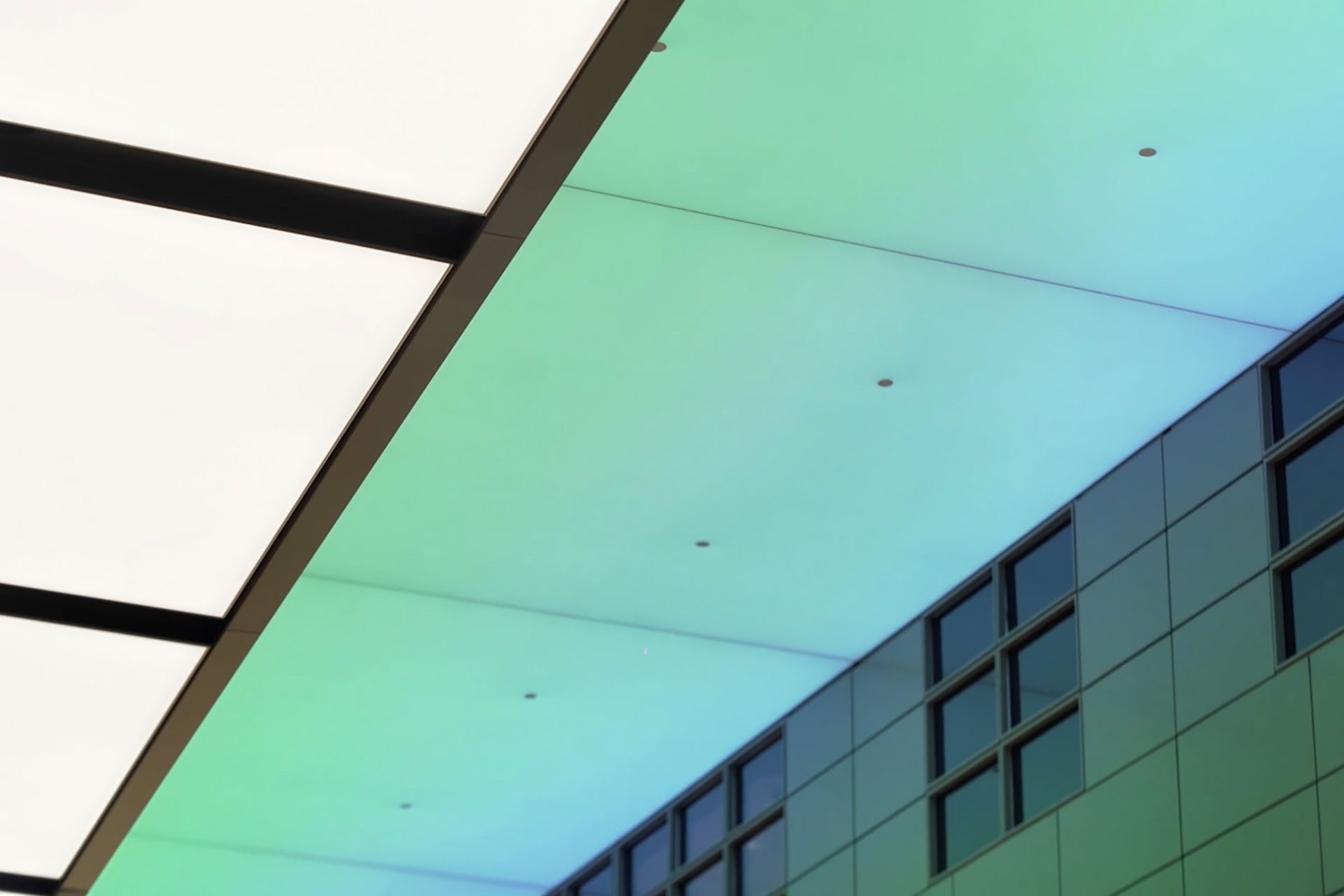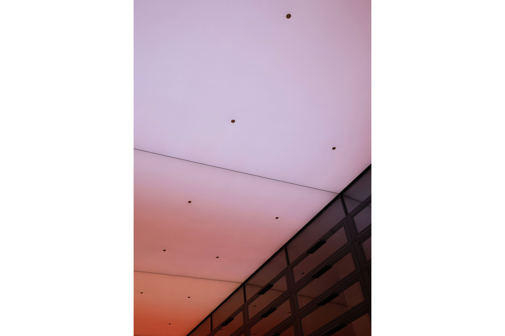 On the upper level, a low-resolution LED matrix creates dynamic atmospheres: clouds, reflections, or chromatic gradients emerge at architectural scale, shifting like a sky in motion. Visual perception completes the images, producing depth and temporality beyond the screen effect. Programming allows each pixel to be mapped, atmospheres to be scaled, and sequences to evolve with seasons or events.