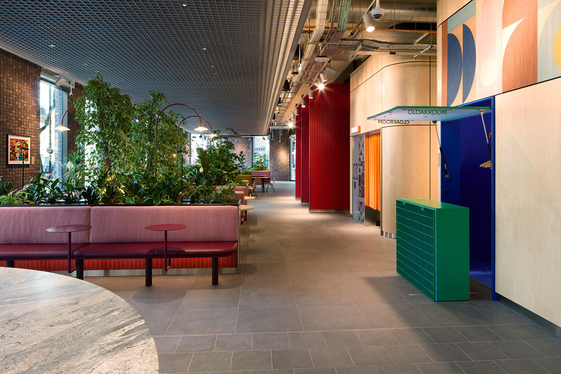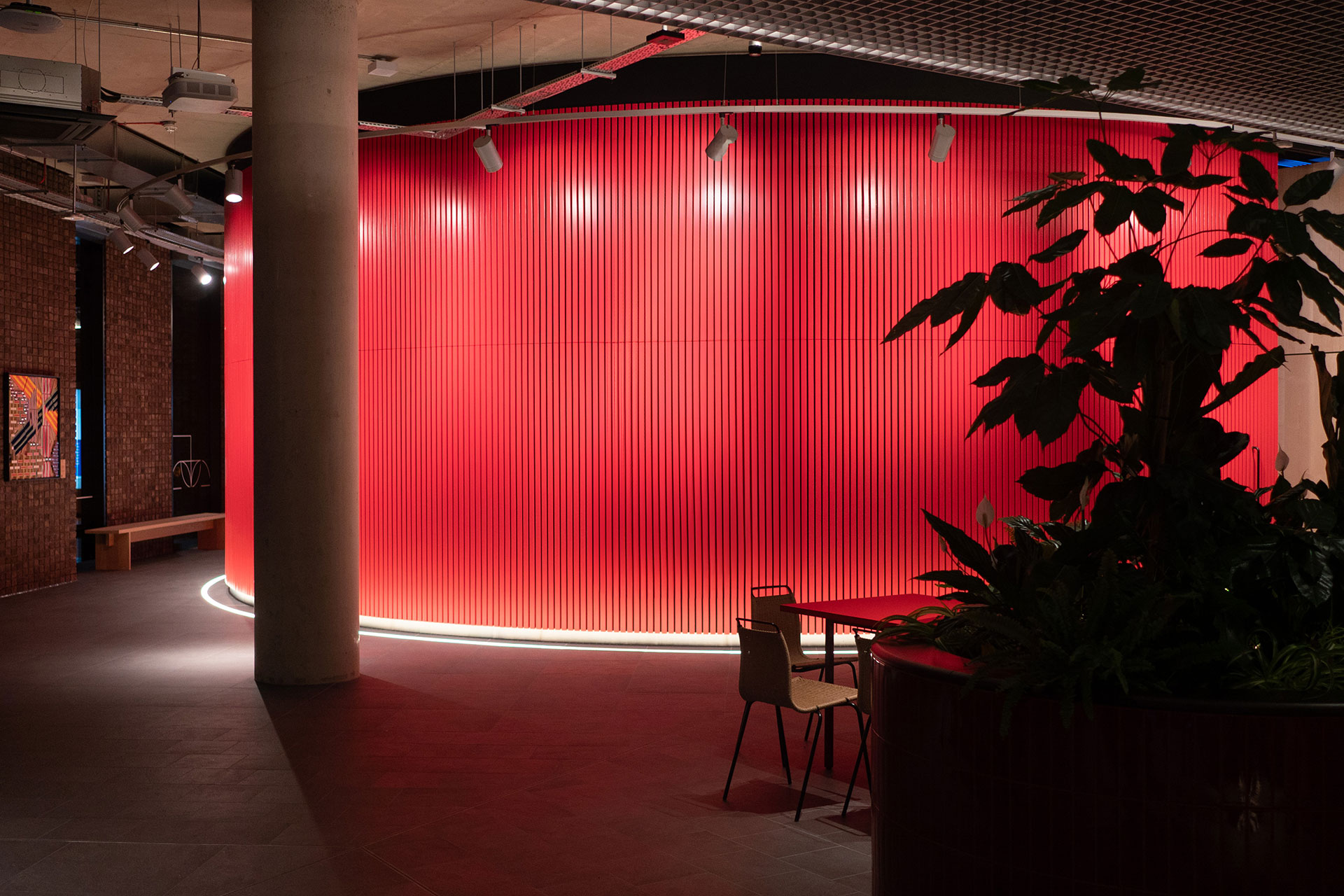 Leading from reception, The Arcade is a lively, internal ‘street’ featuring meeting spots, lush planting, and playful design elements. Track-mounted wall washers and spotlights accentuate textured brickwork, featured artwork, and the bright, bold exterior of The Theatre. A Hunter Douglas perforated raft ceiling houses strategically placed recessed downlights that punch light onto the tables and enhance the planting below. An integrated line of light frames the feature ceiling and supplements ambient light levels while illuminating the soffit above for an elevated effect. Muller Van Severen lamps droop over circular tables, casting an intimate glow, and are complemented by lighting integrated within banquette joinery to create visual interest.