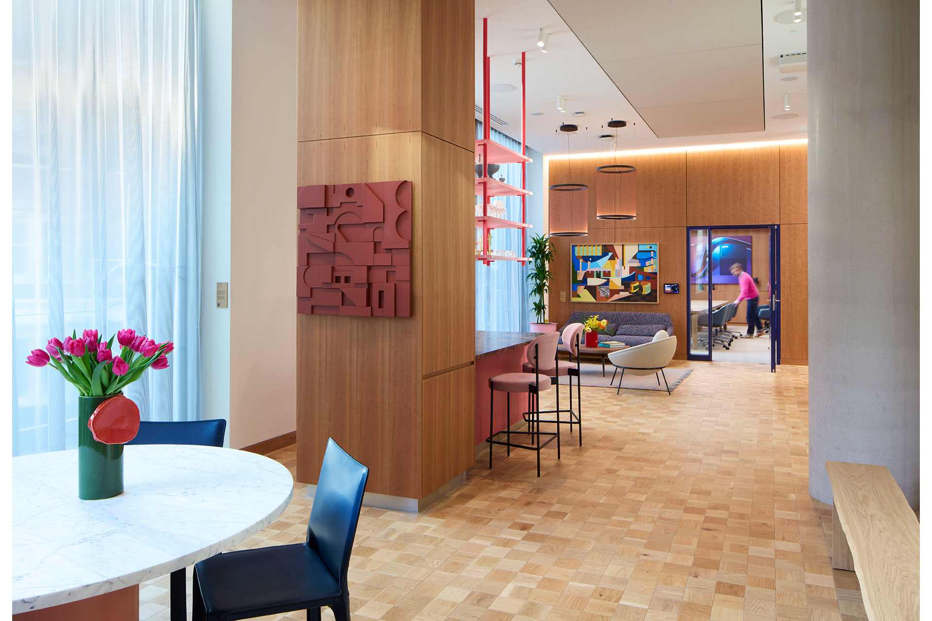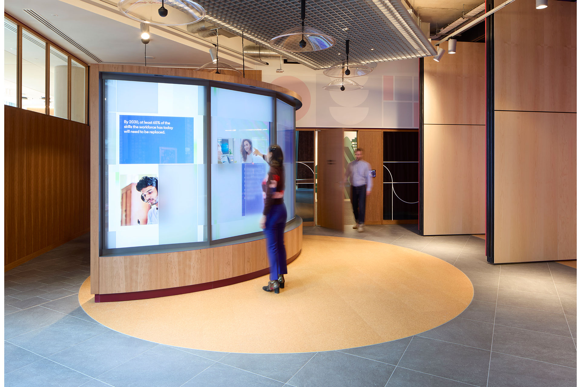 In The Executive Briefing Centre, the lighting design reflects a shift in character to a chic, residential-style space. Cove lighting enhances the vertical timber finishes, adding depth and warmth, and Vibia pendants above soft seating create intimacy. Meeting rooms feature tunable white technology and high colour rendering, creating ideal meeting conditions that users can tailor via a control system. In the boardroom, a Barrisol skylight complements the sleek design look and supports ambient light levels, while adding drama through an array of illuminated colours.