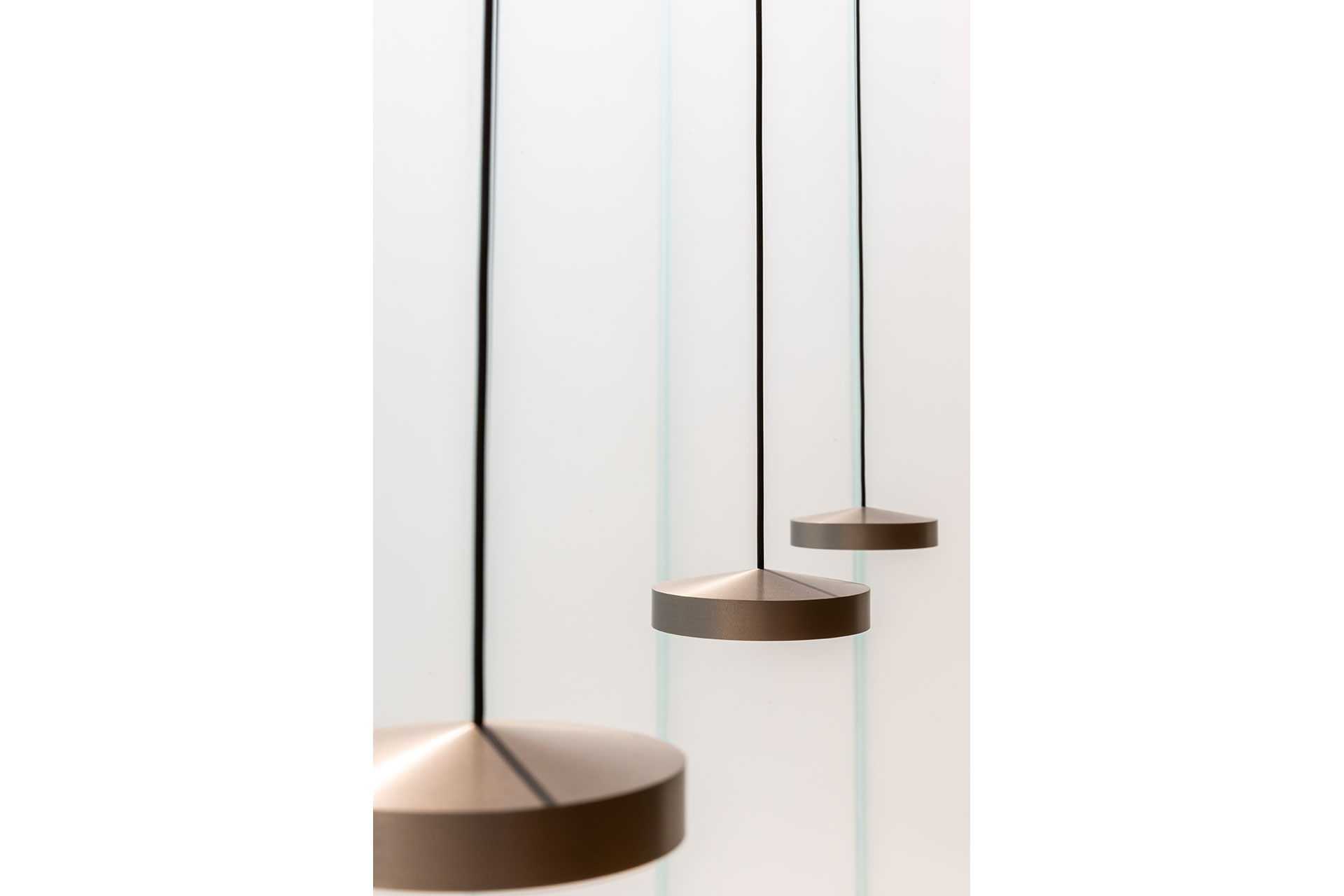 The Luna pendant, designed by Draw Studio, stands out for its slightly conical silhouette, which brings a touch of elegant simplicity to any setting. Its refined finishes enhance the satin effect of the surface, creating a sophisticated visual play of reflections. Luna emits a soft and uniform light, making it ideal for hospitality, residential, and restaurant environments where aesthetic appeal and visual comfort are equally important. Available in nine different finishes, it features microprismatic glass to ensure high-quality illumination and optimal visual well-being.