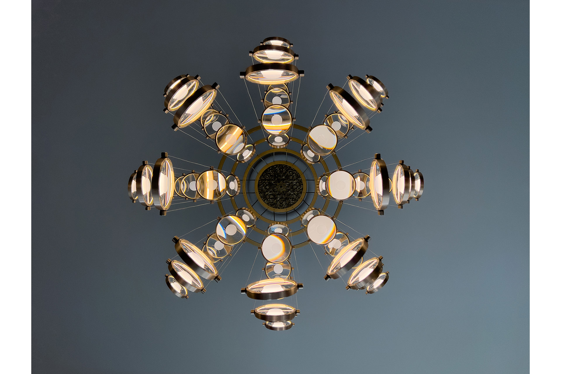 The collection’s tactile quality is defined by a marriage of weight and clarity. The warmth of Dark Brushed Bronze provides a grounded, structural contrast to the brilliant Optical Crystal lens. This pairing ensures that even when unlit, the pieces serve as sculptural artefacts.