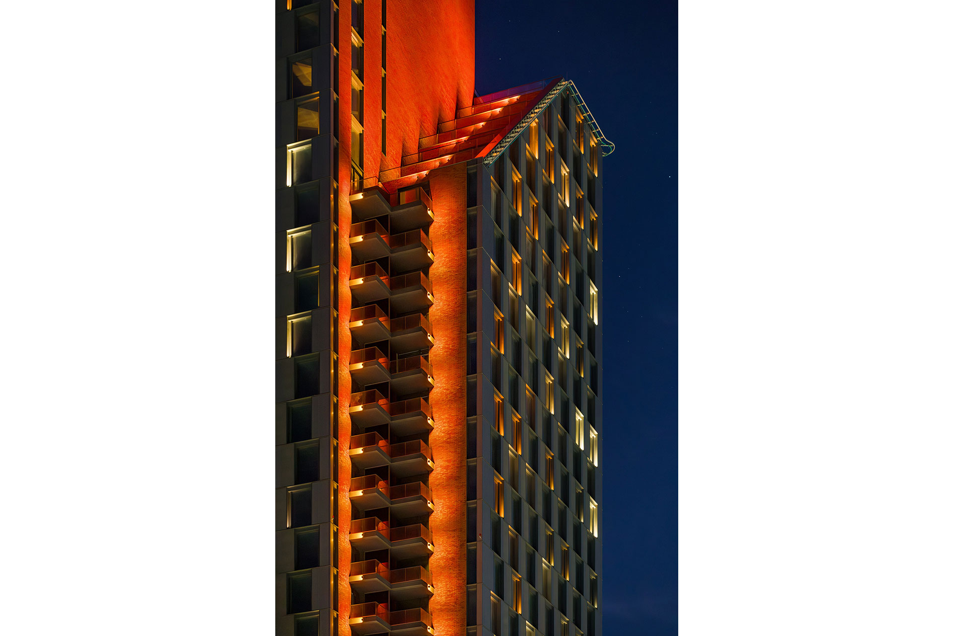 Custom luminaires with asymmetric narrow elliptical beams were developed to precisely illuminate designated areas. Each window effectively functions as a “pixel,” enabling subtle dynamic effects and light gradients across the façade.