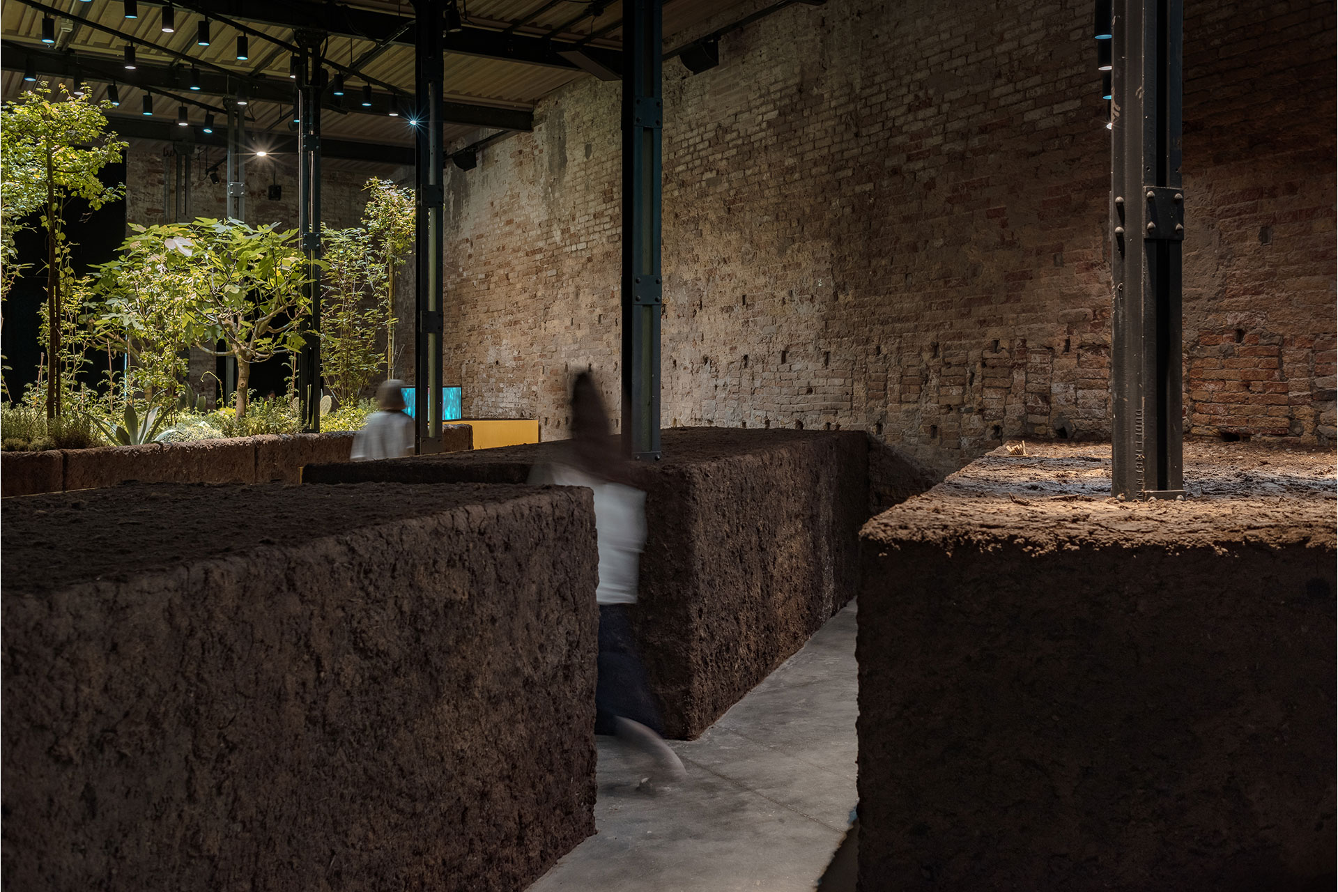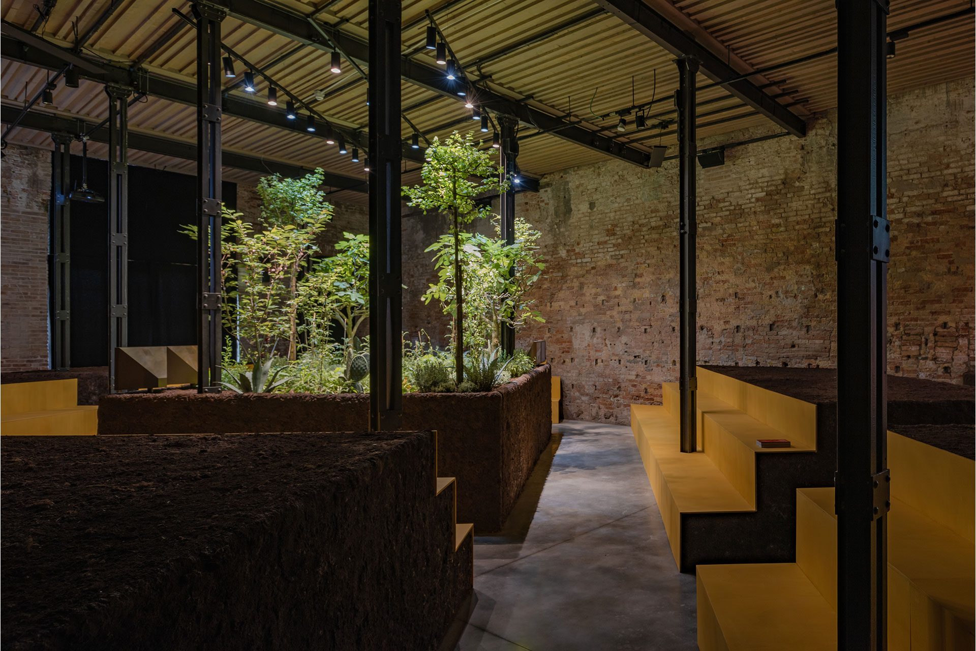 The lighting design for this project took us beyond our usual scope. As an architectural lighting studio, we typically work on residential, office, real estate, hospitality, and commercial spaces. We had never designed a lighting system intended to keep plants alive—and make them produce flowers and fruit—indoors without natural sunlight. The installation is located in the Arsenale of Venice, home of the Venice Architecture Biennale. This year we were selected by INBAL, the Mexican institution responsible for culture and the arts, and we were asked to recreate a chinampa inside a space with only one small north-facing window, far from ideal conditions for an agroforestry system.