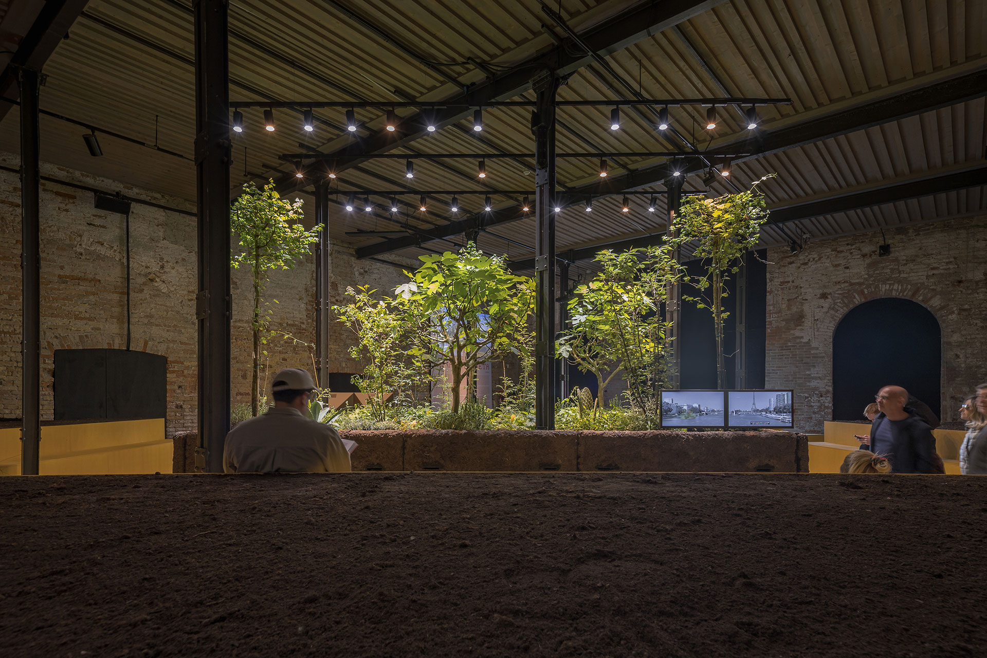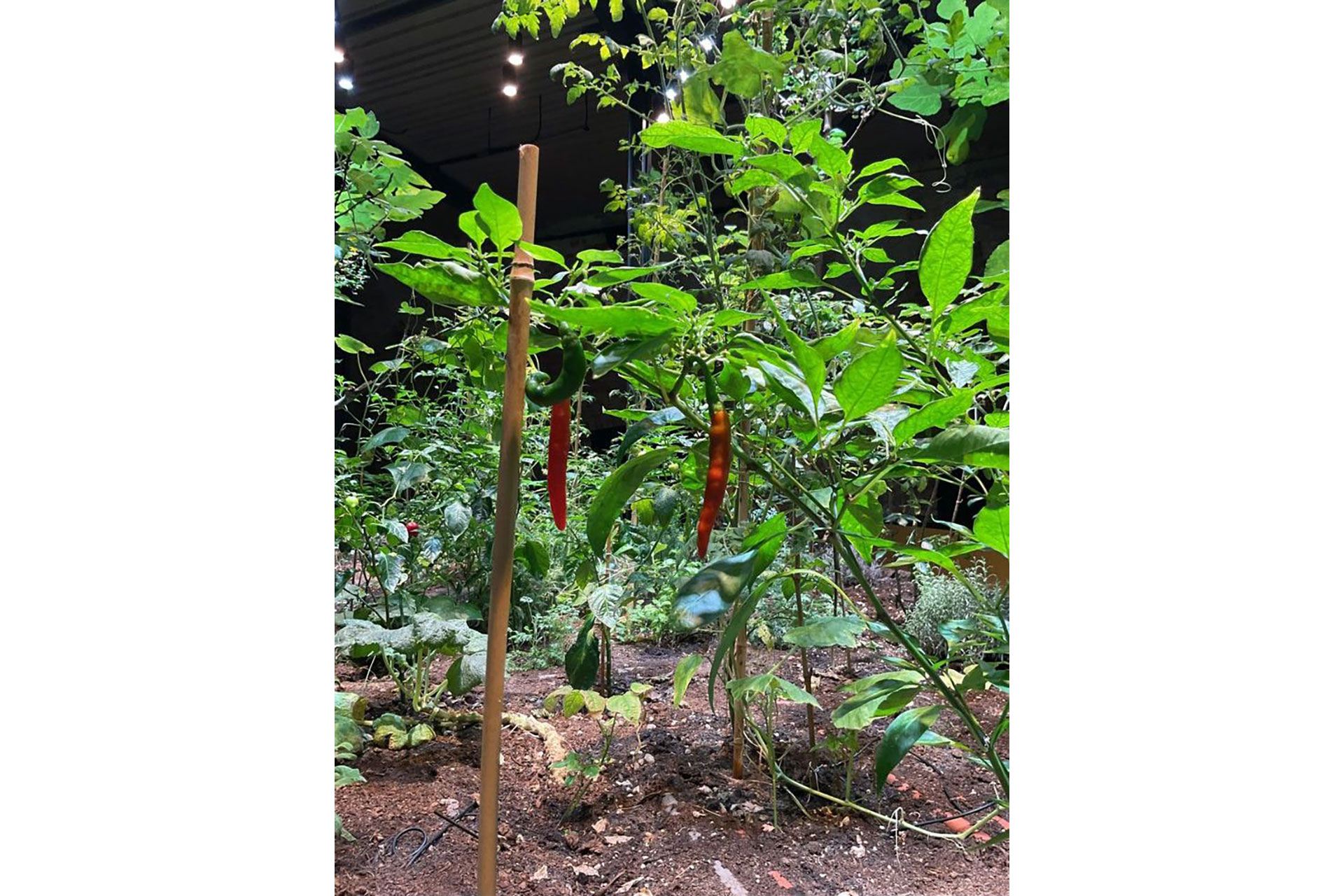 The second challenge was aesthetic. Since this is an architecture biennale, we wanted to avoid any resemblance to a clandestine grow room. We designed the fixtures with a more theatrical look and a concentrated beam to highlight the “wounded chinampa”—a metaphor for ecological erosion that visitors could help regenerate by planting a seed and nurturing it with water and light. The central chinampa, filled with mature plants, is illuminated to support growth and fruiting throughout the seven-month biennale, while the rest of the lighting provides only what is necessary for safe circulation, allowing the chinampa to remain the protagonist of the installation.