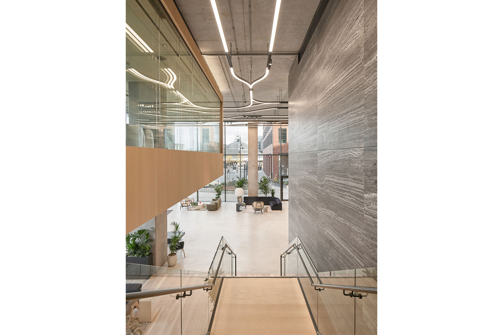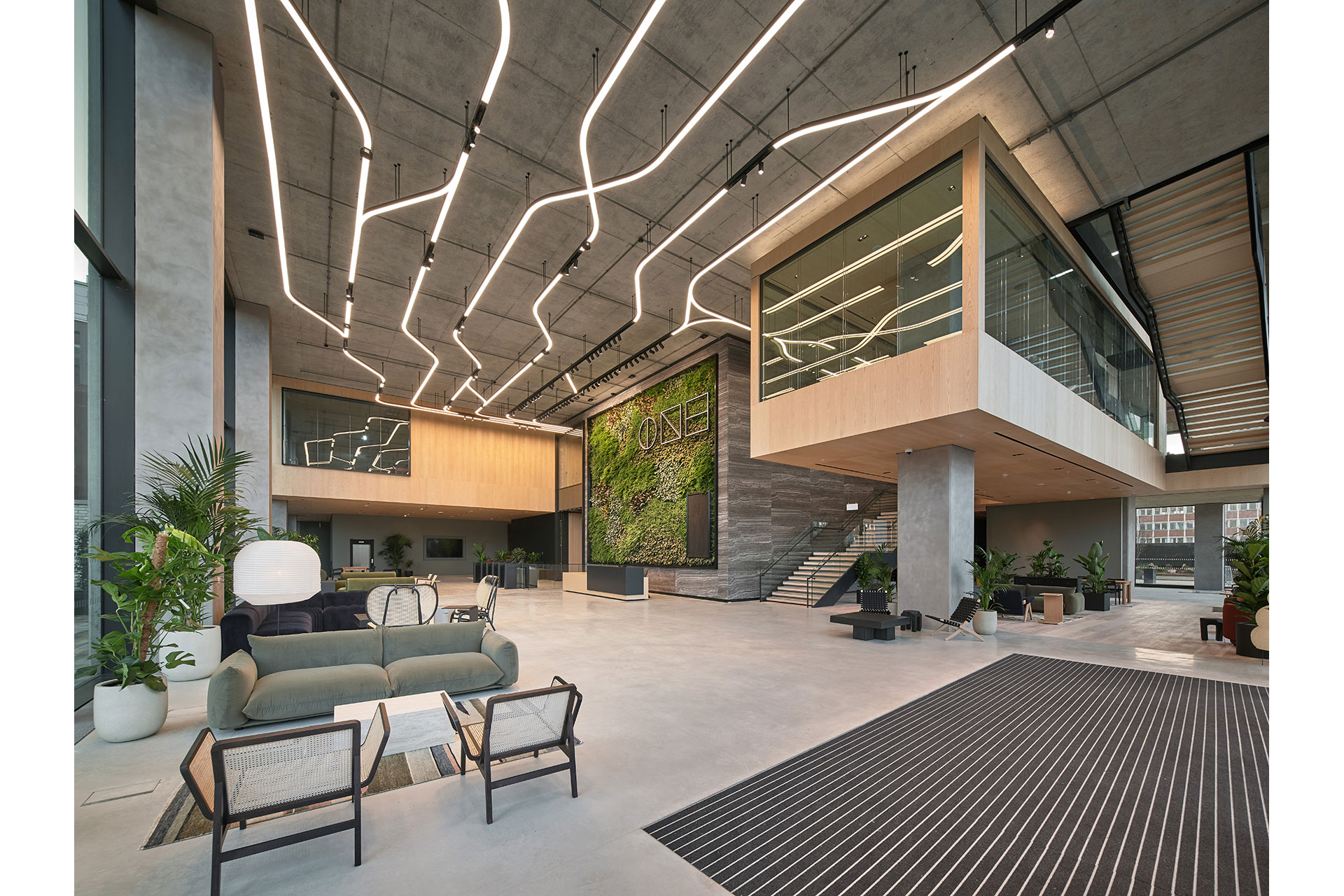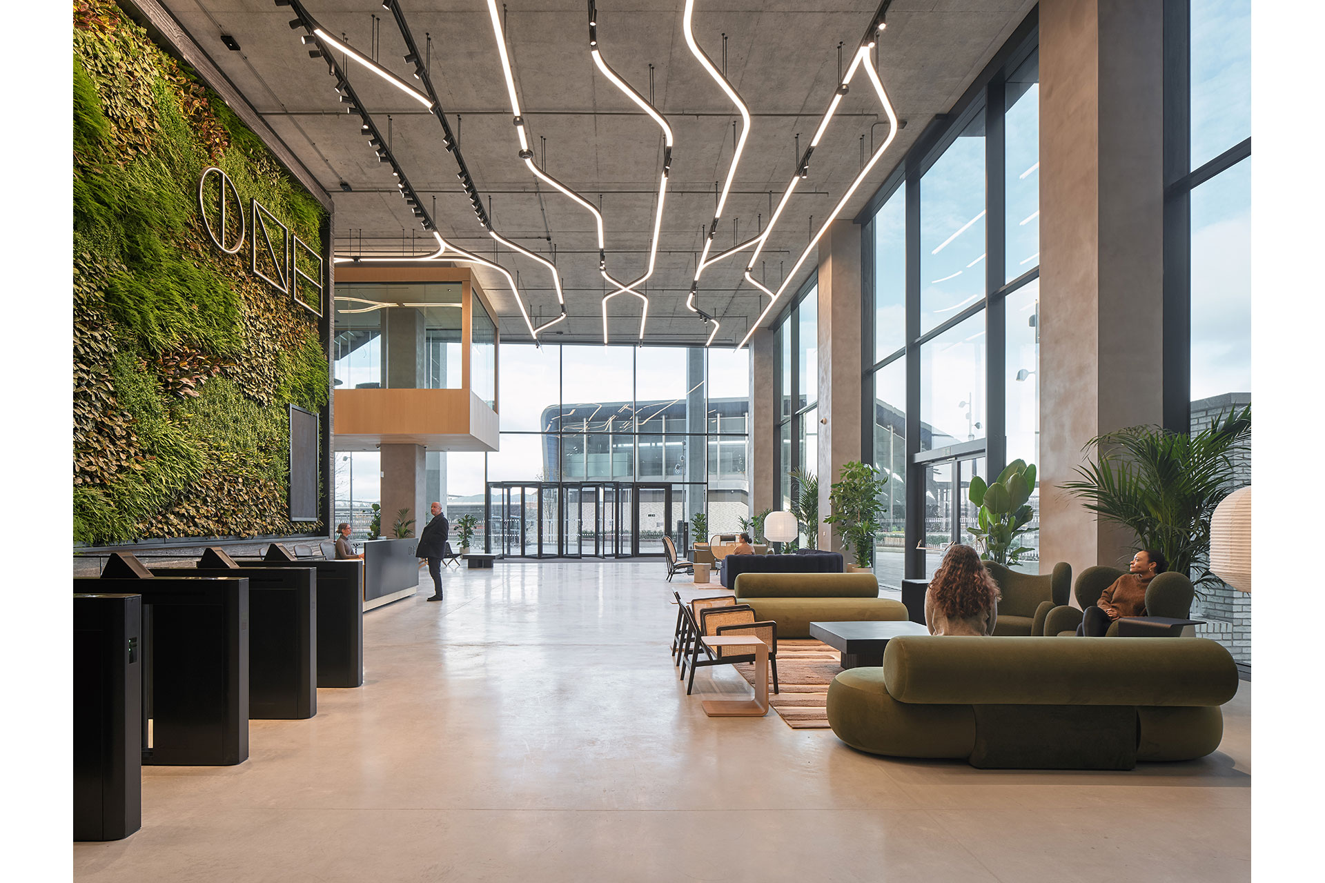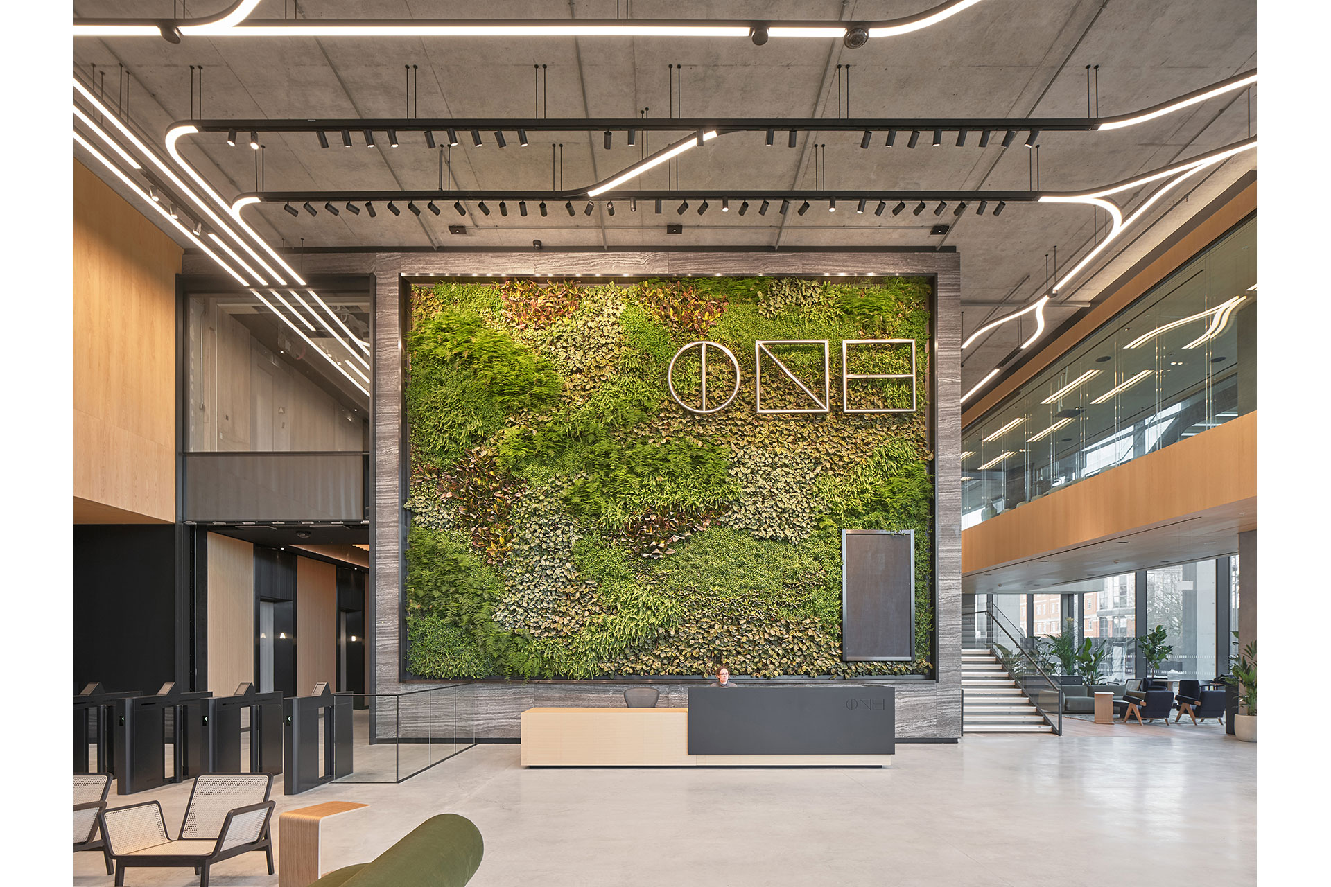 Upon entering the triple-height reception lobby of One Station Hill, the immediate focal point is the lush, full-height living wall behind the reception desk.