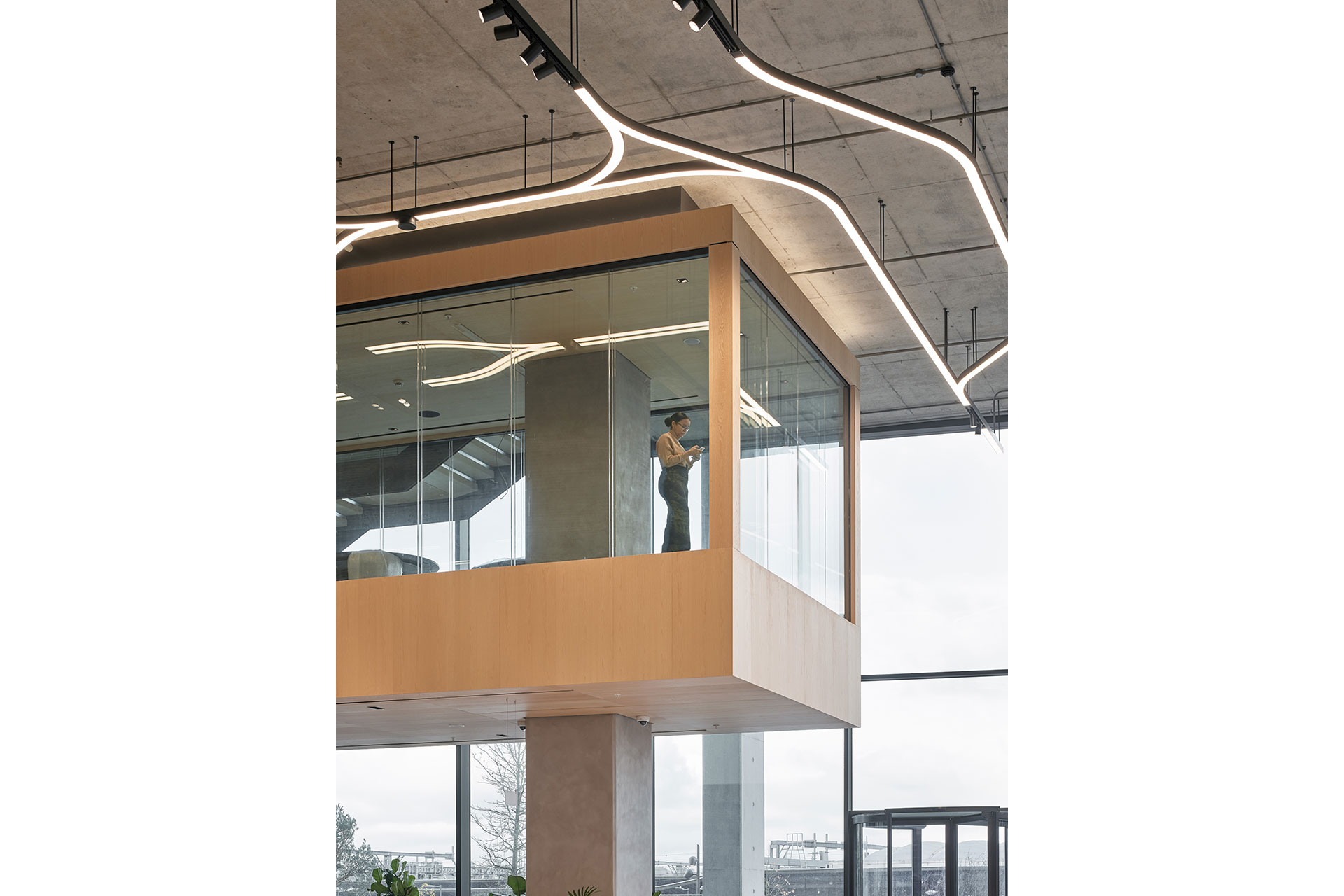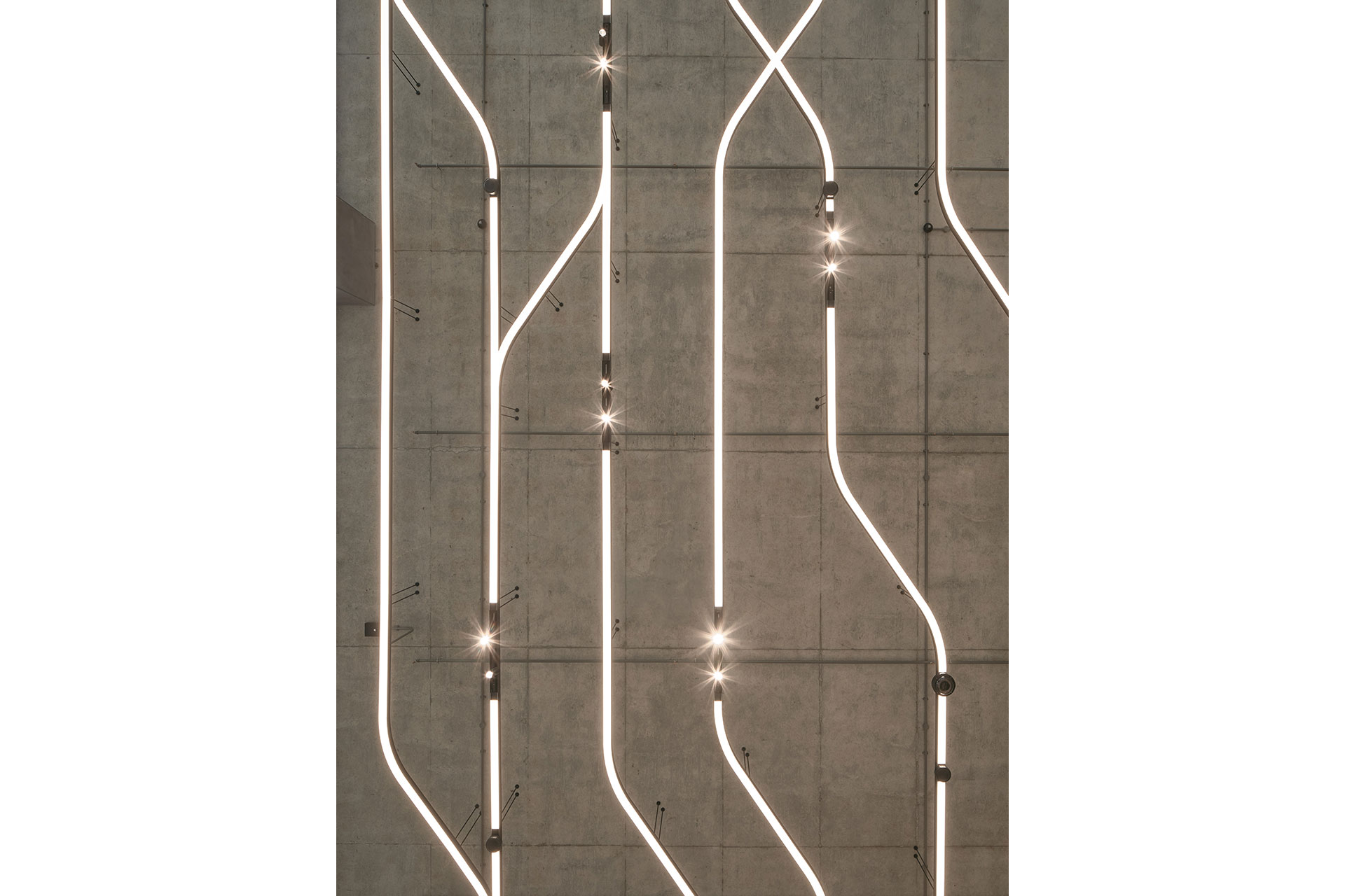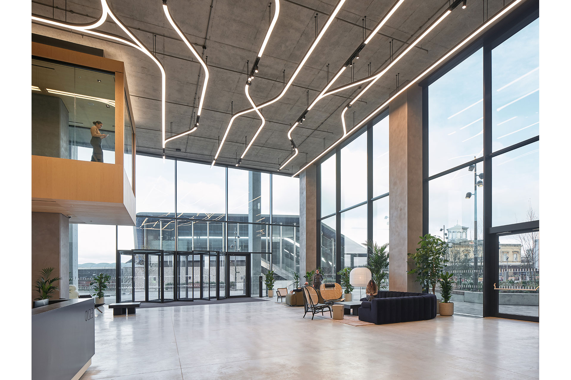 To achieve the necessary accent lighting for seating, circulation areas, and the living wall, a surface-mounted track and spotlight system was chosen. This system is integrated into a bespoke profile that also includes linear diffused lighting to highlight the flowing curves of the track’s frame, whilst at the same time providing additional uplift of ambient illumination for the lobby, along with housing emergency lighting, loudspeakers, and CCTV cameras.