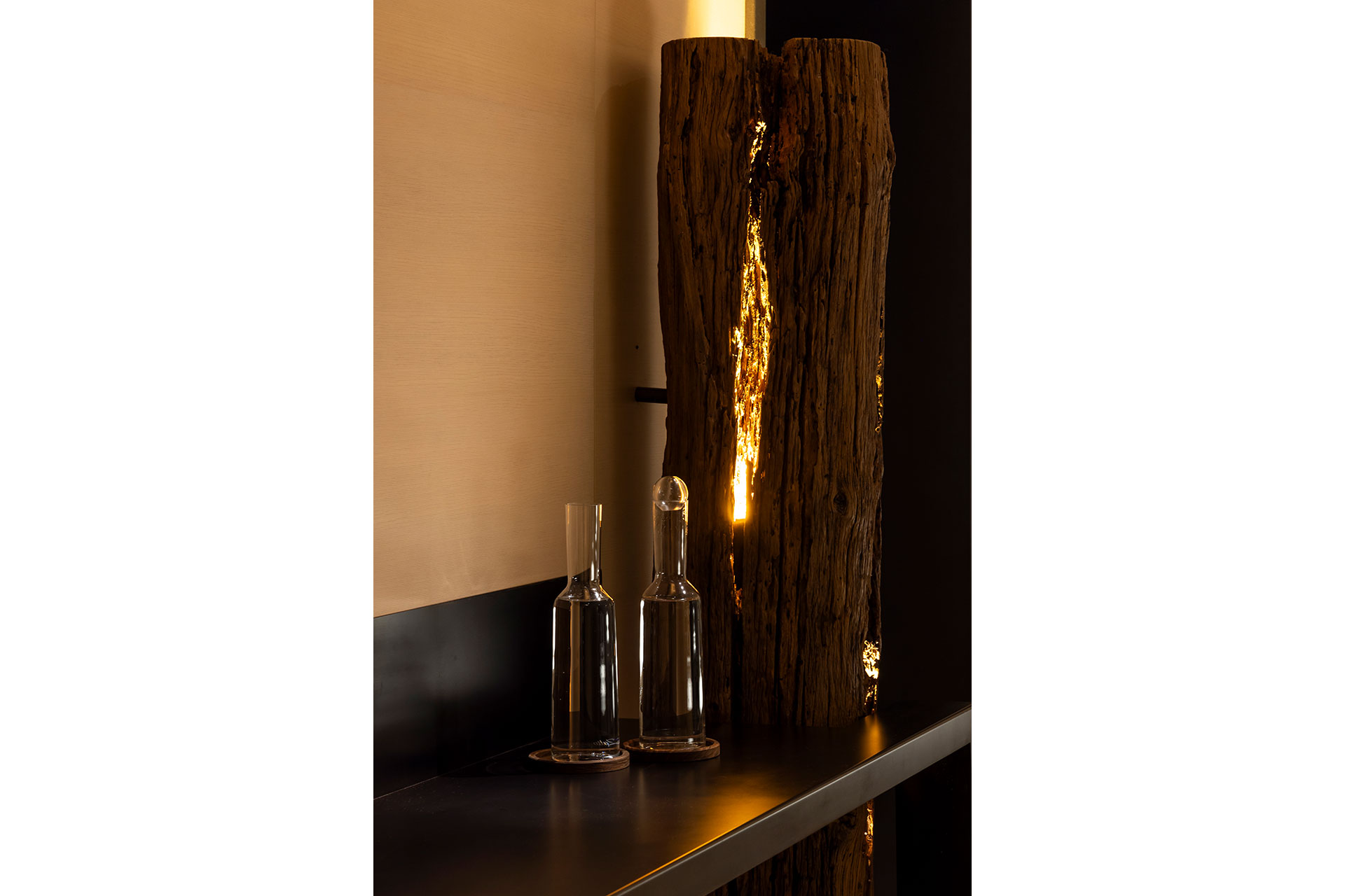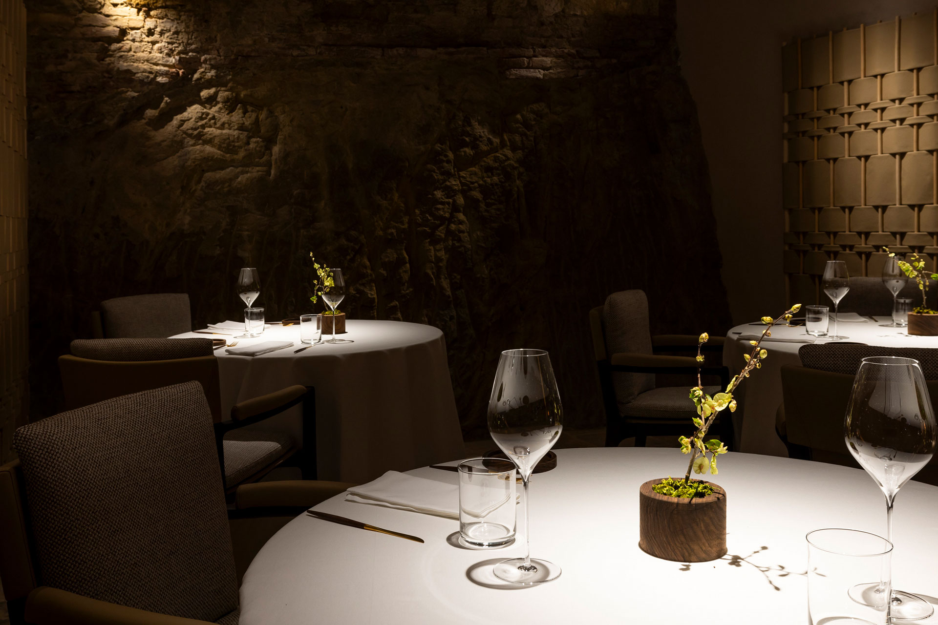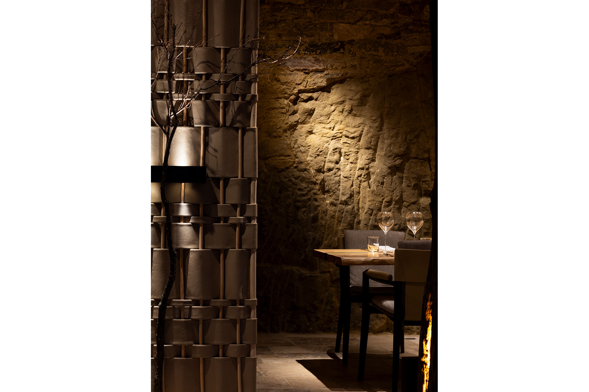 Designed exclusively for nighttime dining, the restaurant’s lighting has been crafted by Foster + Partners’ Lighting Team to enrich the dining experience. A warm interior glow, visible from the village’s narrow street, draws guests inside for a memorable experience. Light is focussed precisely where needed, onto the dining tables, creating intimate pools of warmth that bring guests together without directly illuminating them. The surrounding space remains dim, with minimal, carefully place accents that preserve a sense of calm and depth. Most materials were locally sourced to reduce environmental impact, and regional artisans contributed bespoke elements, most notably a reclaimed 300-year-old ceiling beam repurposed into an illuminated bench with integrated LED lighting. Track-mounted spotlights, discreetly located between the historic timber beams, offer flexibility and creative freedom. In addition to highlighting the tables they reveal the rugged texture of the exposed rock wall and the delicate woven leather acoustic panels, casting gentle shadows that enhance the intimate, welcoming atmosphere.