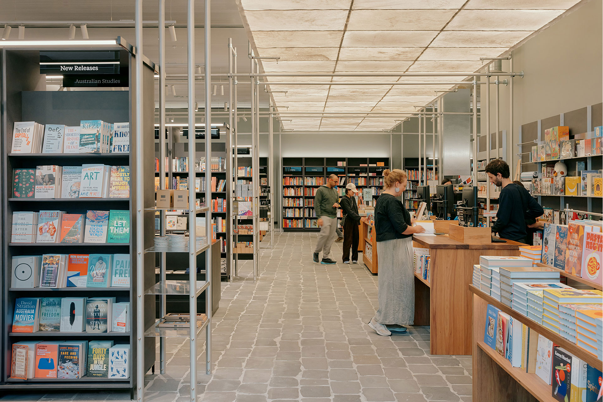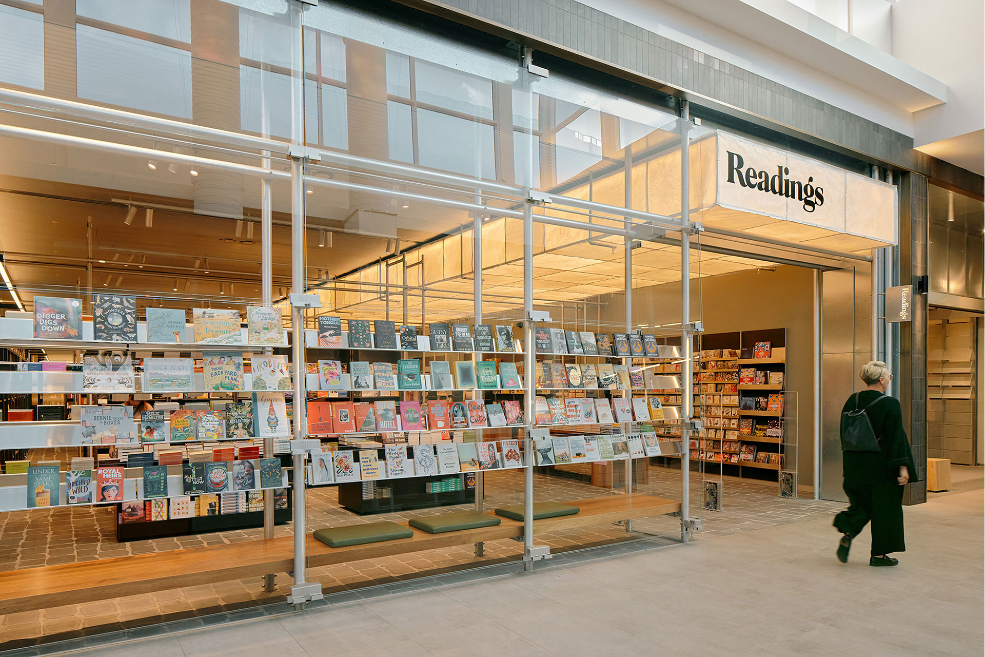 The striking 23 by 3.4-metre bespoke illuminated ceiling feature for bookstore Readings is a monumental paper lantern crafted entirely from pulped misprinted books.