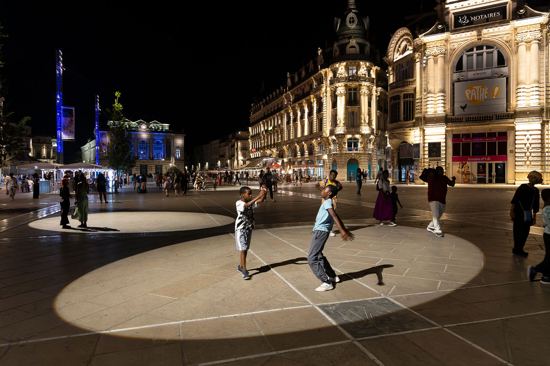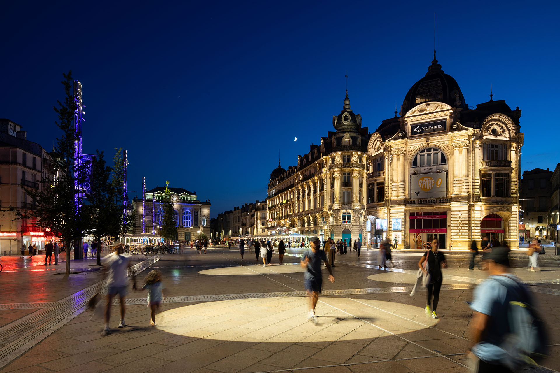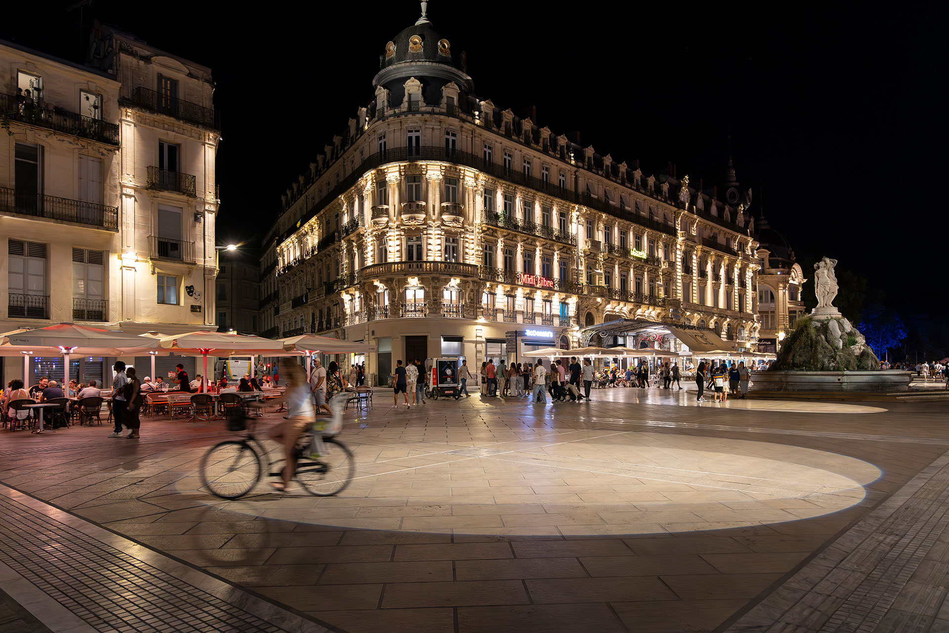 All the historic façades of the square are illuminated by overhead lighting, revealing their volumes and details. This light, projected from top to bottom, respects the darkness of the night sky and preserves the peaceful atmosphere of Montpellier evenings.