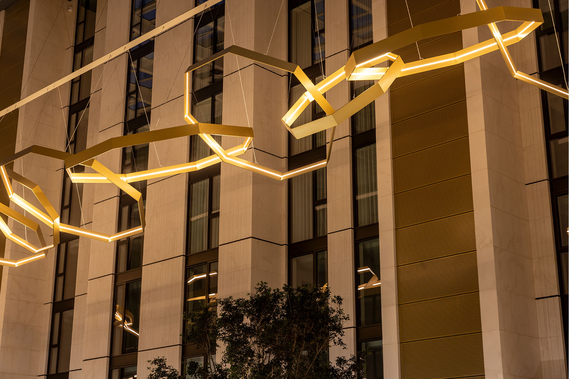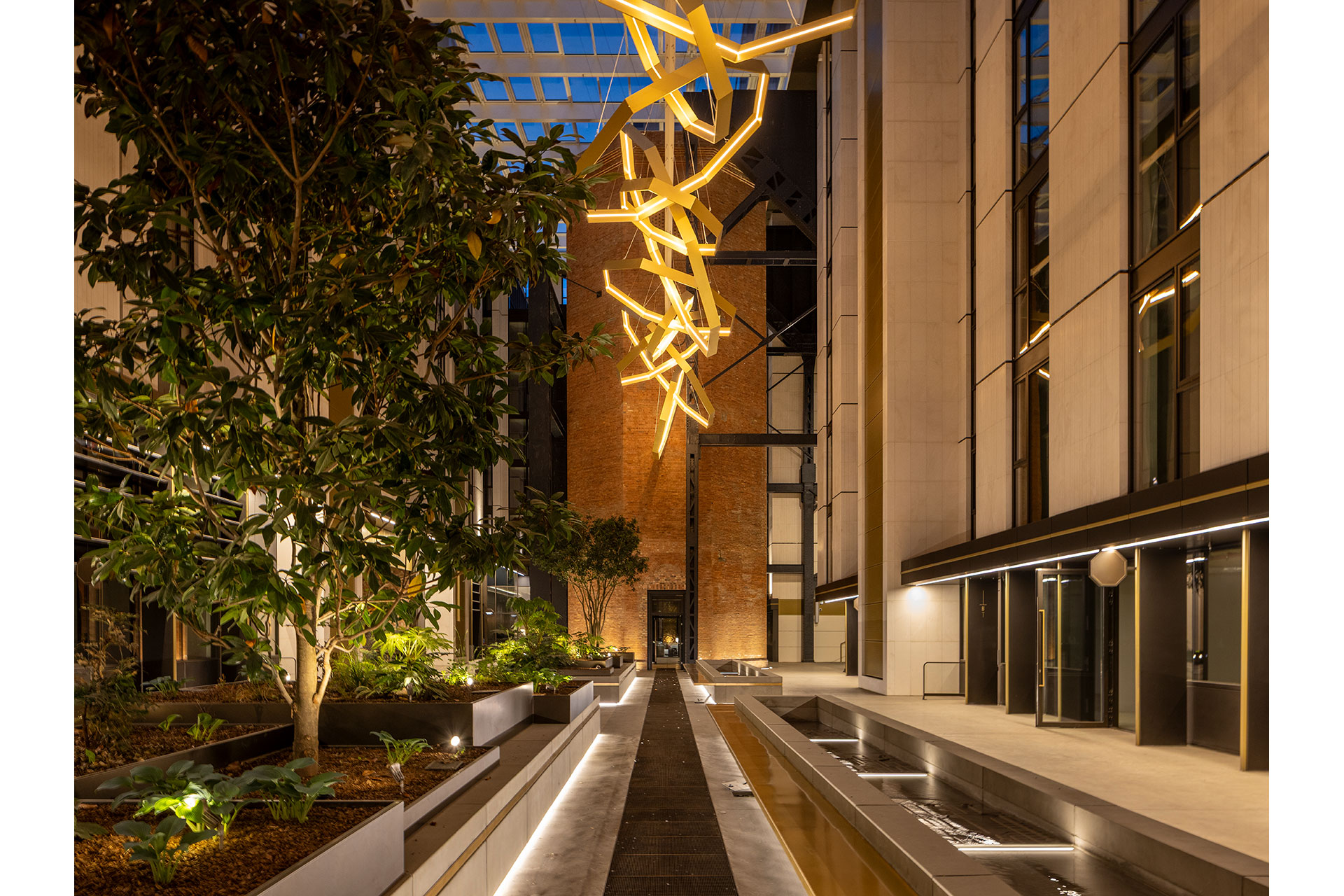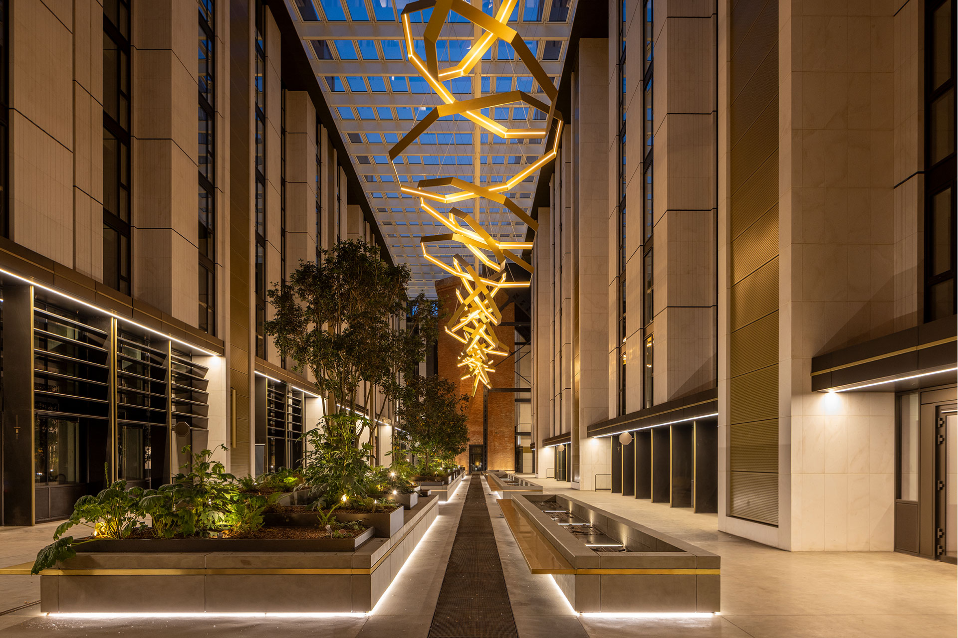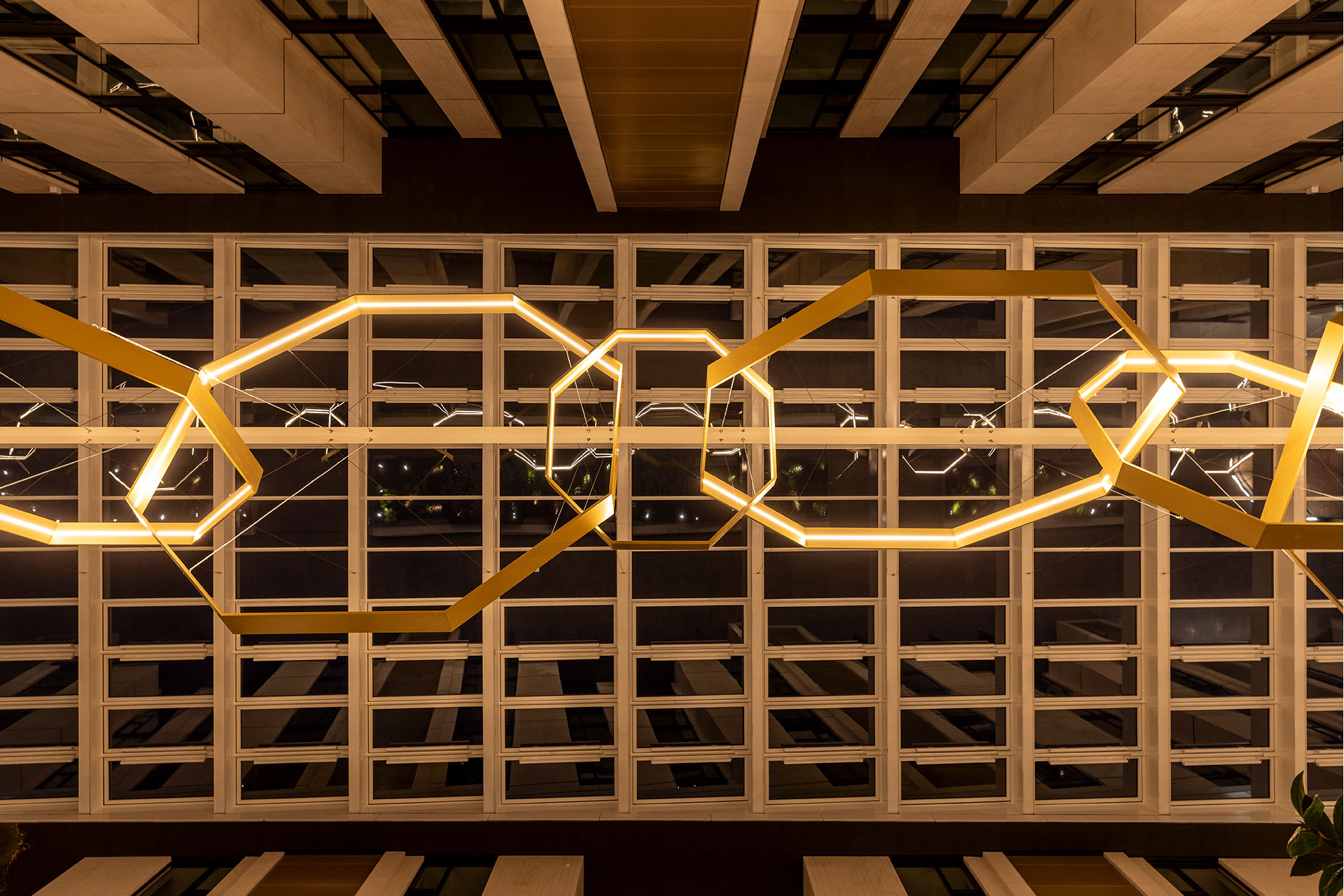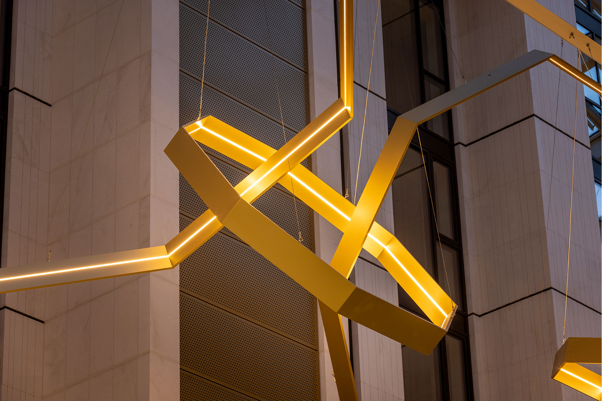 Each octagon is individually programmed to emit a travelling pulse of light, creating a subtle, rhythmic flow from one end of the installation to the other. This dynamic movement echoes the building’s industrial heritage, reinforcing the designer’s vision and transforming the pendant into a storytelling element within the atrium.