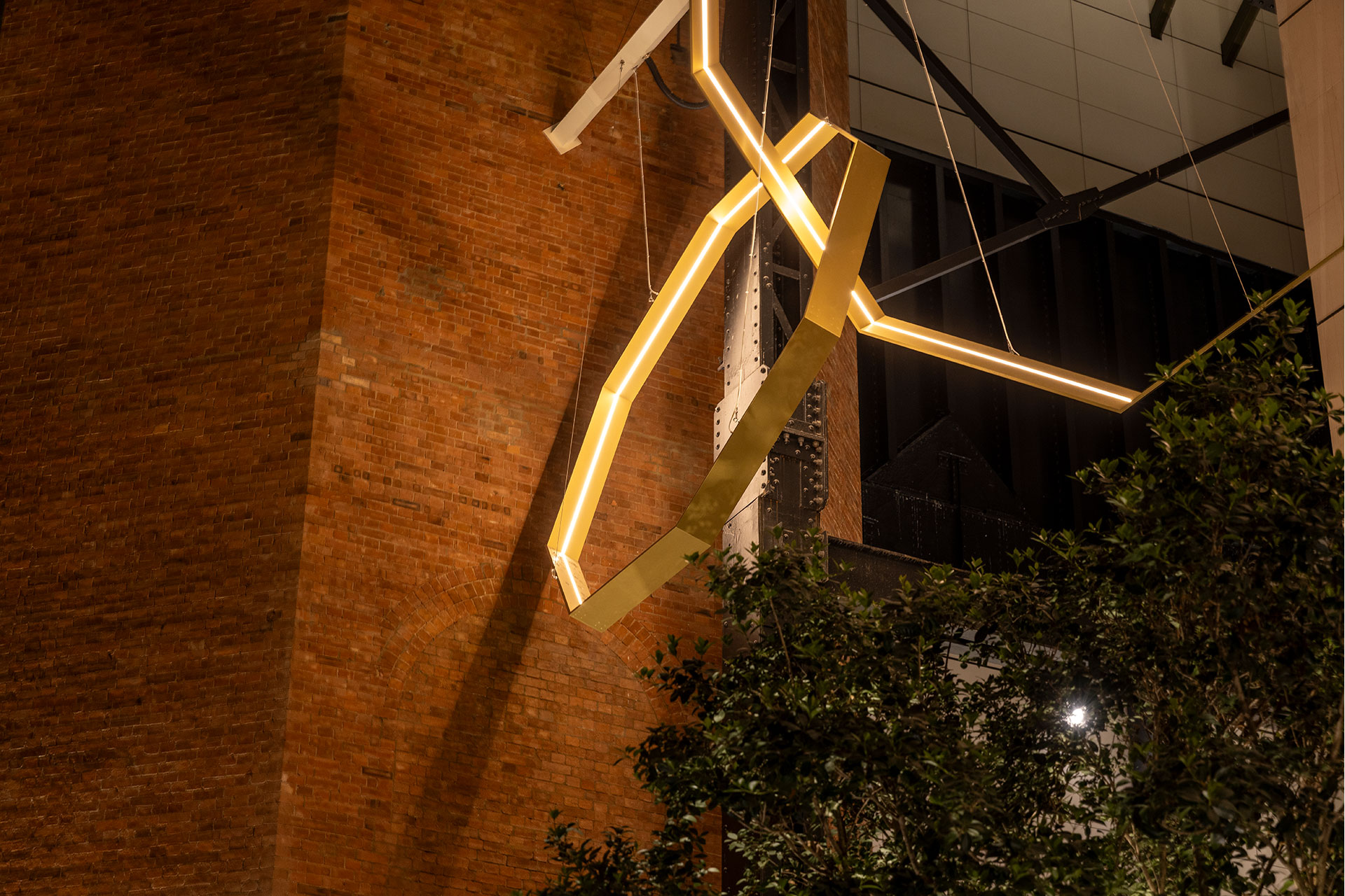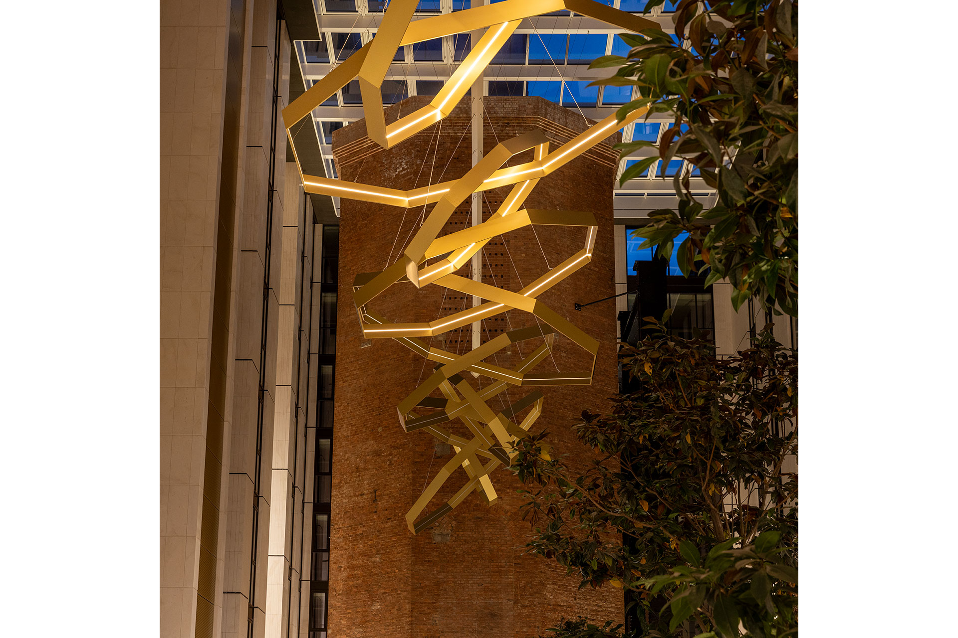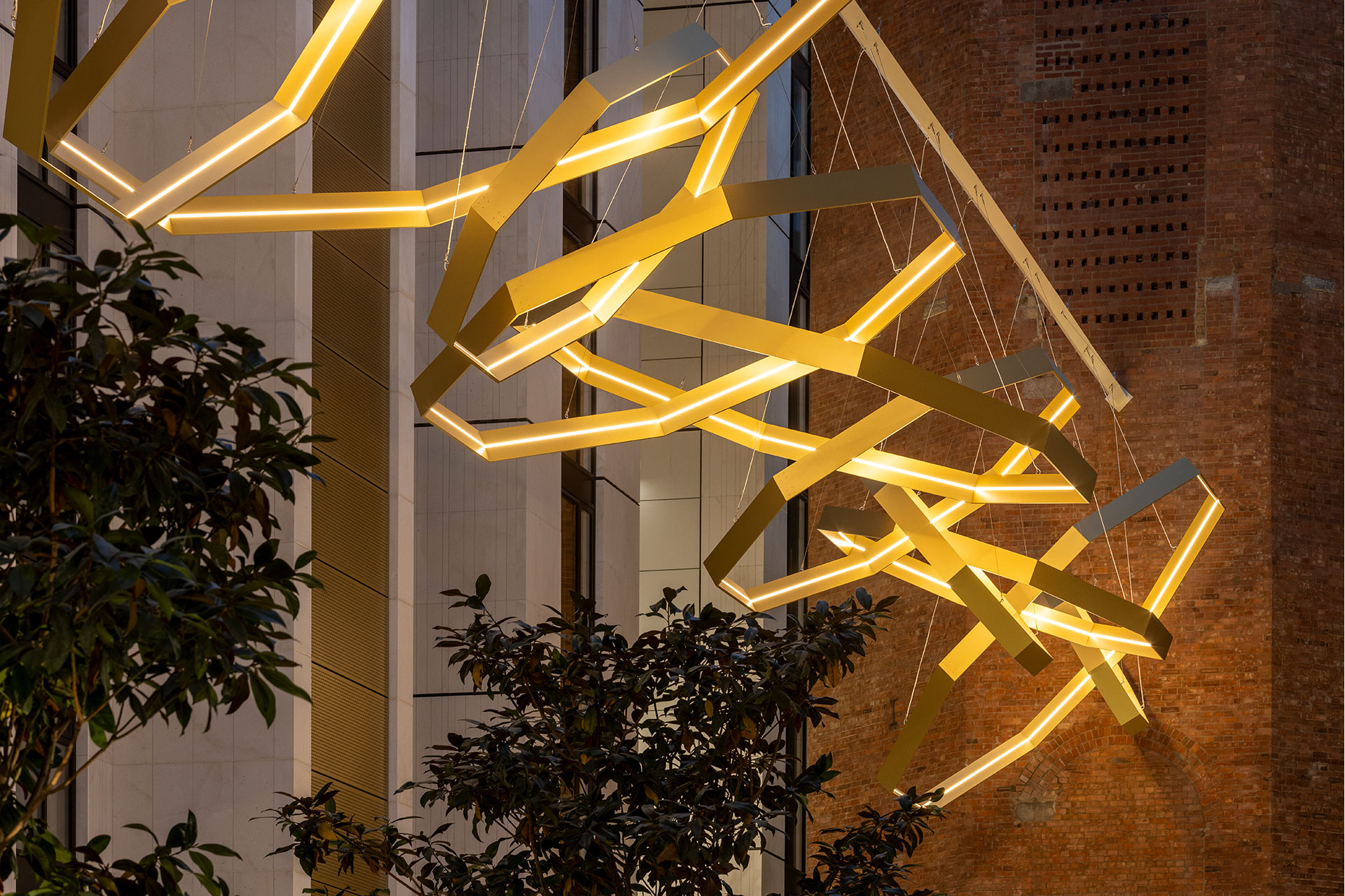The design brief demanded a solution that respected the Grade II listed building while delivering a contemporary art installation. The pendant comprises 24 interlocking octagonal elements suspended between the historic chimneys, realised through close collaboration between the design team and Studiotech, who engineered, integrated, and delivered the installation.