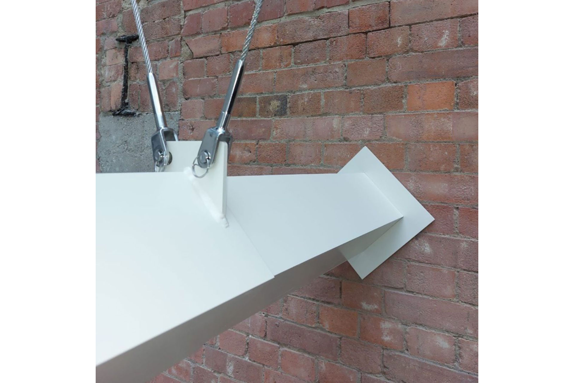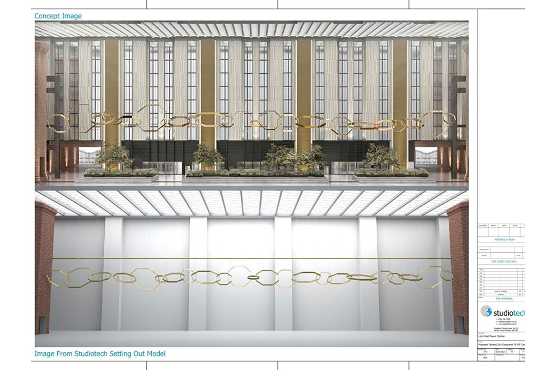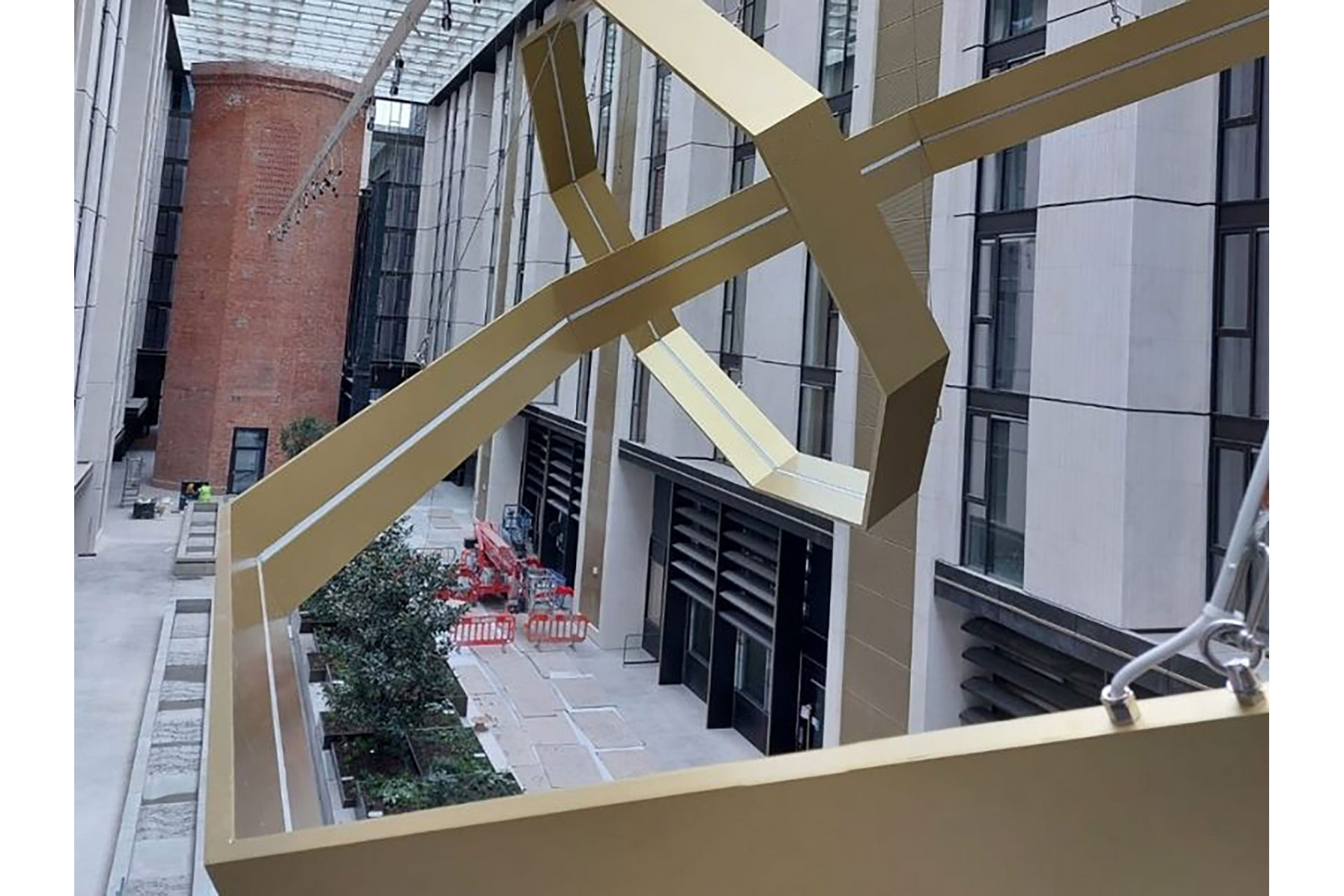 The design brief demanded a solution that respected the Grade II listed building while delivering a contemporary art installation. The pendant comprises 24 interlocking octagonal elements suspended between the historic chimneys, realised through close collaboration between the design team and Studiotech, who engineered, integrated, and delivered the installation.