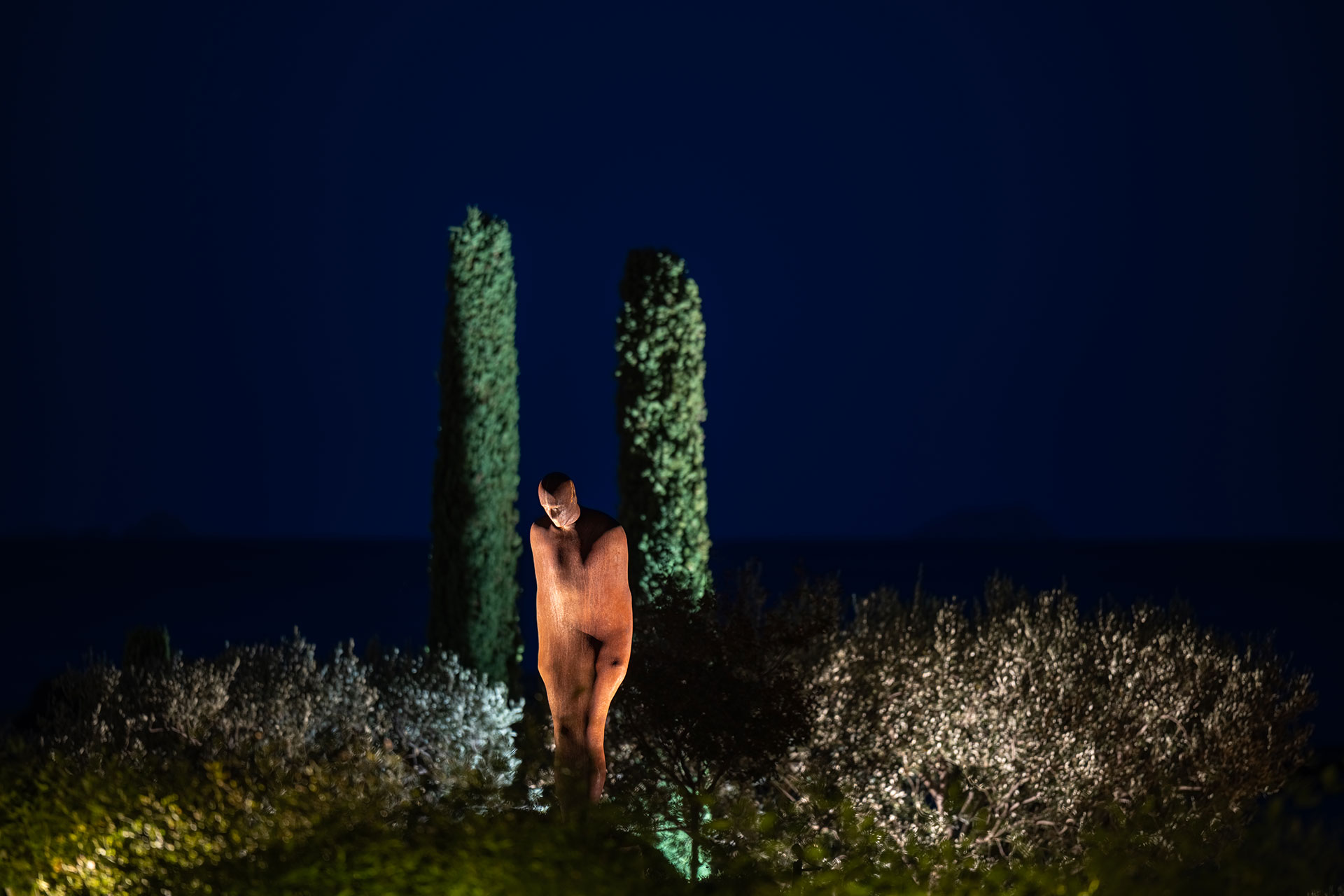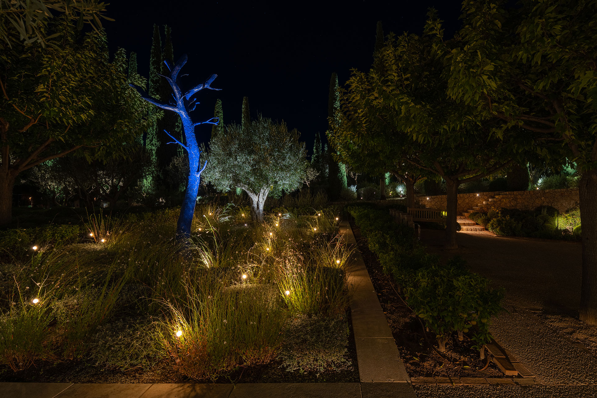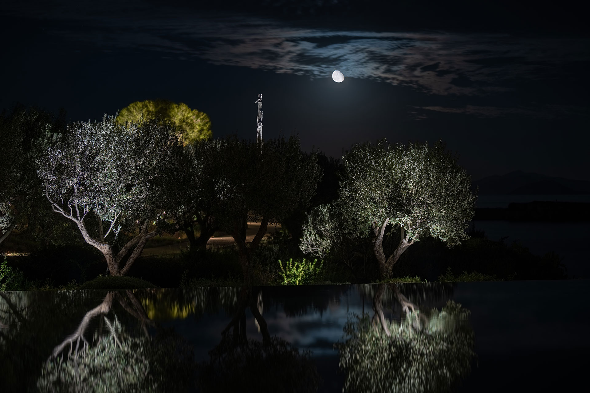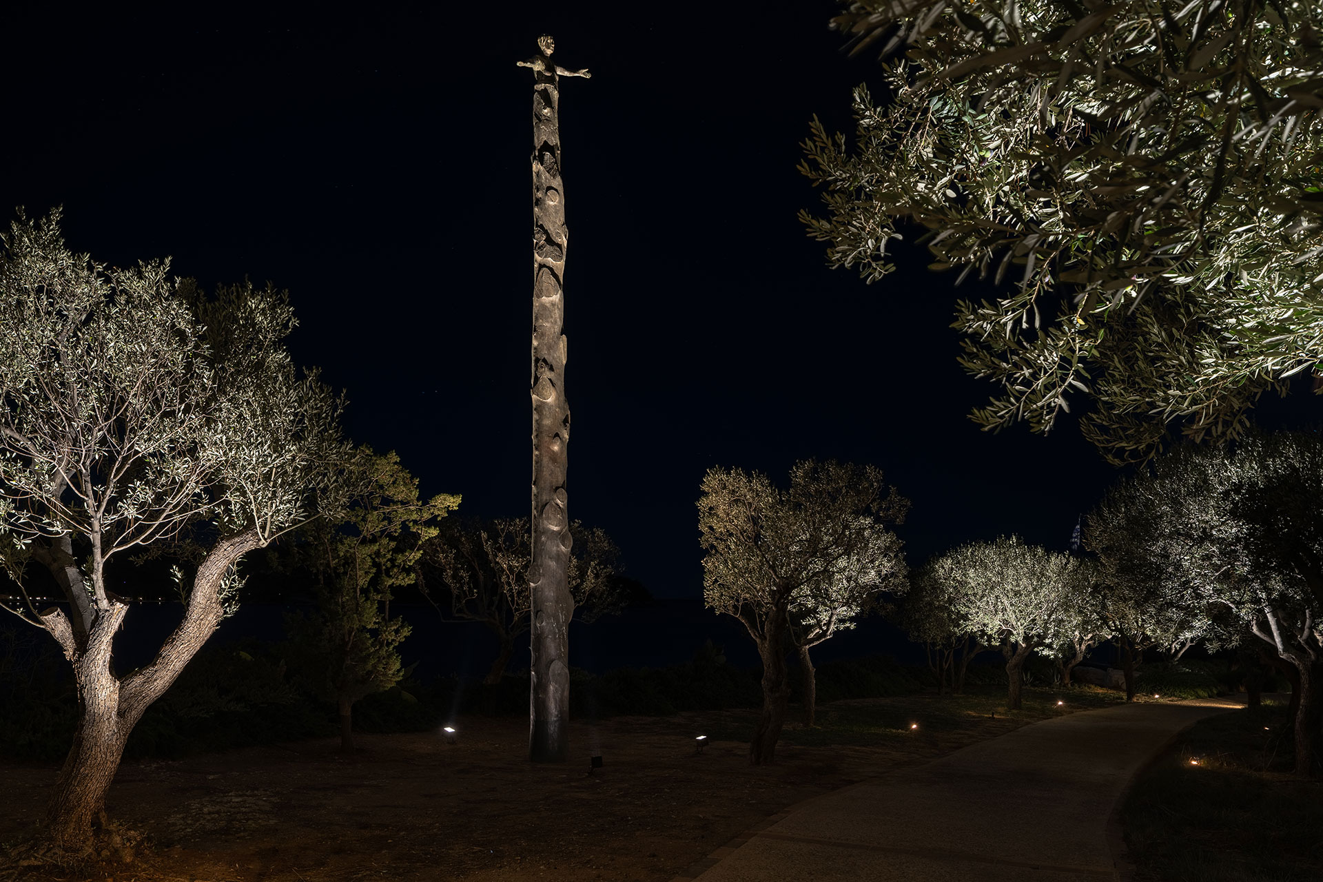 The landscape lighting design transforms this private coastal residence into a nocturnal atmospheric scene. The lighting concept highlights the natural geometry of the terrain, the unique sculptures, the vegetation, and the serene view of the sea. Carefully composed layers of light reveal the textures and silhouettes of olive trees and cypresses, guiding the viewer’s eye through the garden’s organic pathways.