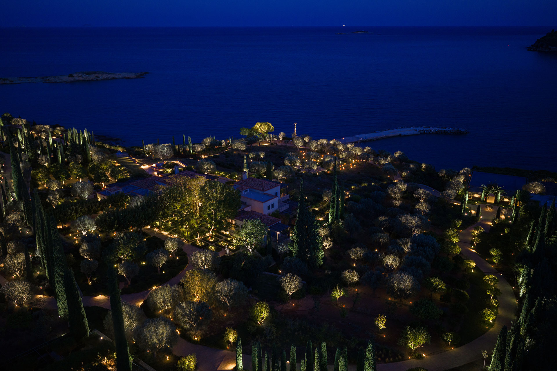 From elevated viewpoints, the residence glows discreetly within the Mediterranean setting, with individual points of light echoing the stars above and reflecting off the sea below—creating a delicate balance between visibility and mystery. The result is a landscape that breathes with light.