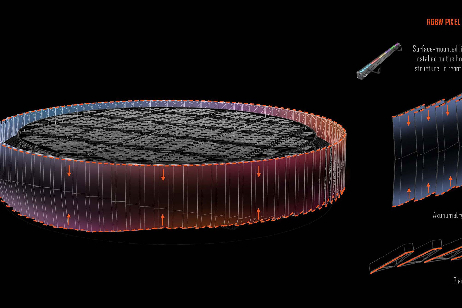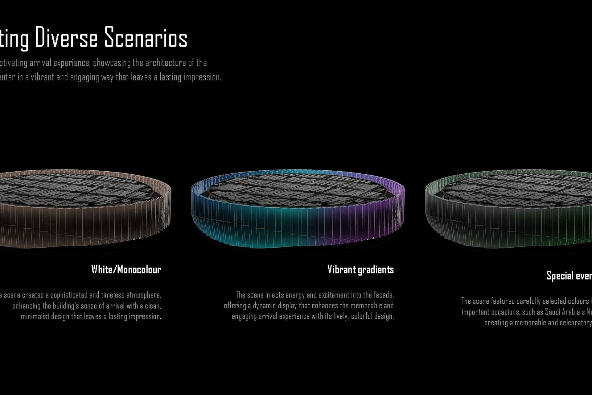 The façade lighting concept for the Qiddiya Welcome Center is conceived as a contemporary expression of movement, anticipation, and identity—reflecting Qiddiya’s role as the future capital of entertainment, sports, and culture in Saudi Arabia. Rather than treating the façade as a static surface, the lighting transforms it into a dynamic threshold: a moment of arrival that sets the emotional tone for the visitor journey.