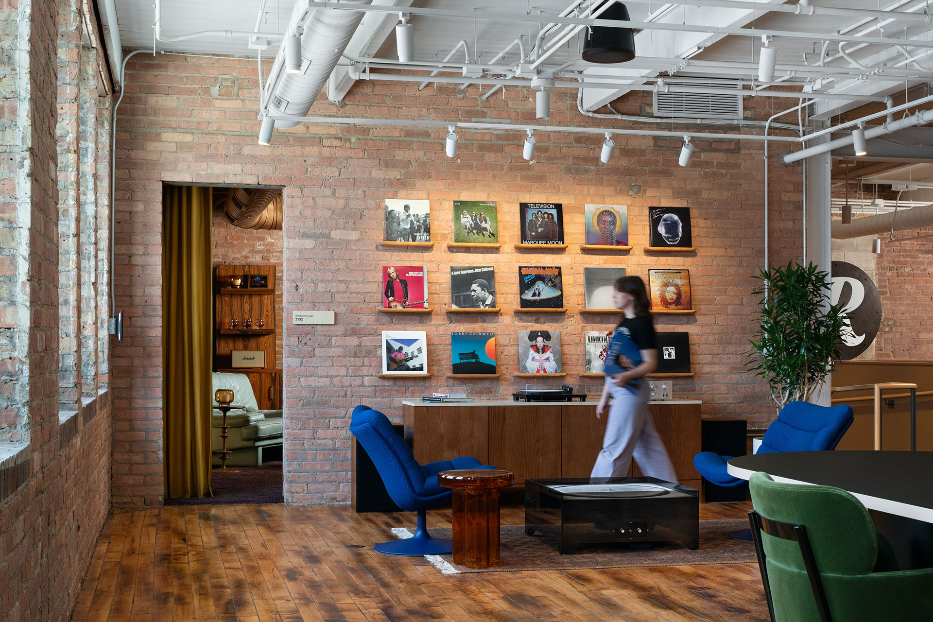 Adjacent to reception is a raised collaboration space that features meeting, lounging, and listening areas. Suspended, cost-effective track fixtures highlight their record collection and provide flexibility should furniture be moved to host large gatherings.