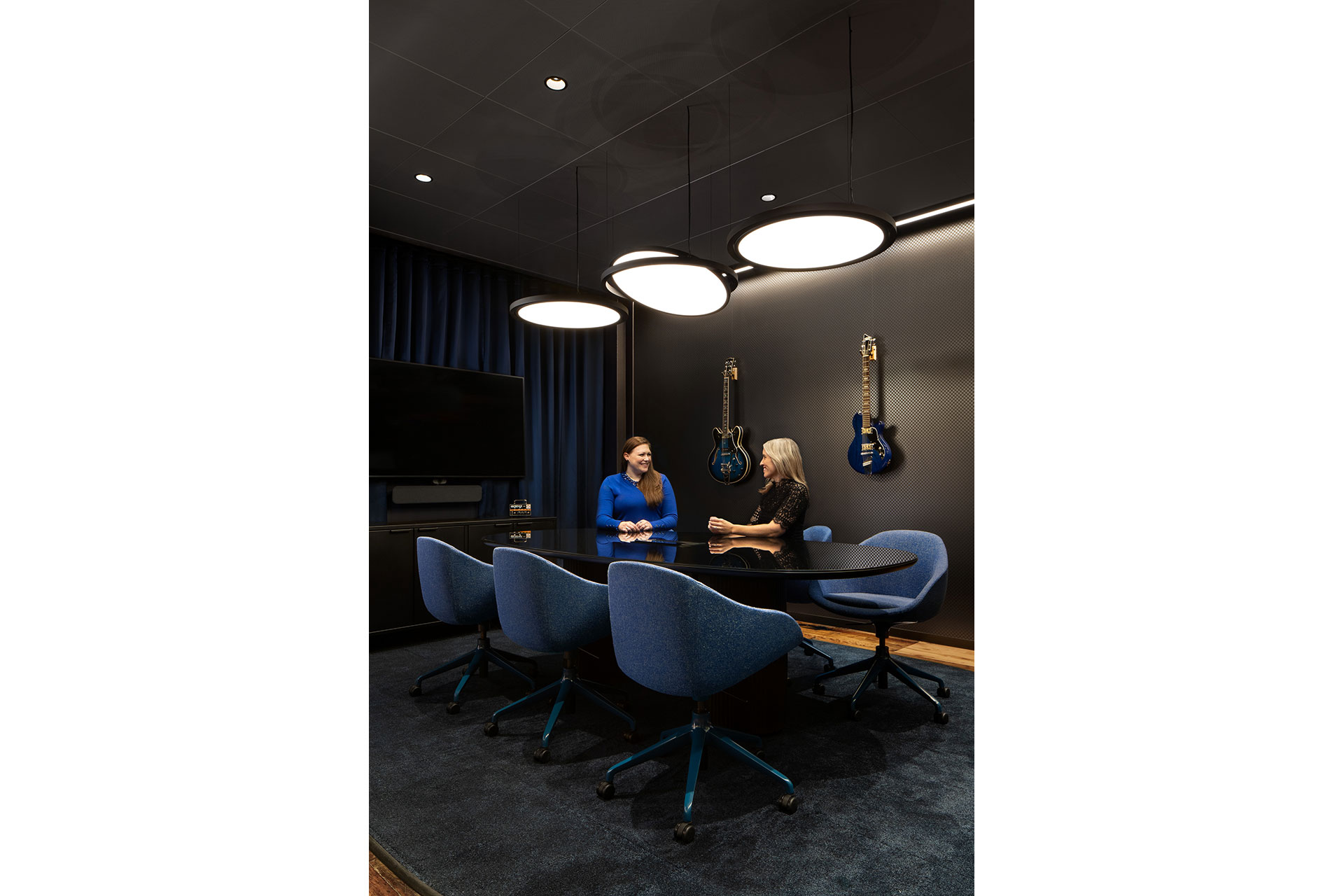 Each conference room has a unique design aesthetic. Linear fixtures wash walls and highlight instruments, creating a backdrop that can be seen through the floor-to-ceiling glazing. Recessed downlights in a bespoke ceiling are painted to match. Feature pendants that can be tilted and repositioned draw focus to the table while providing task lighting. Dimming controls provide multiple presets for the various needs of each meeting space.